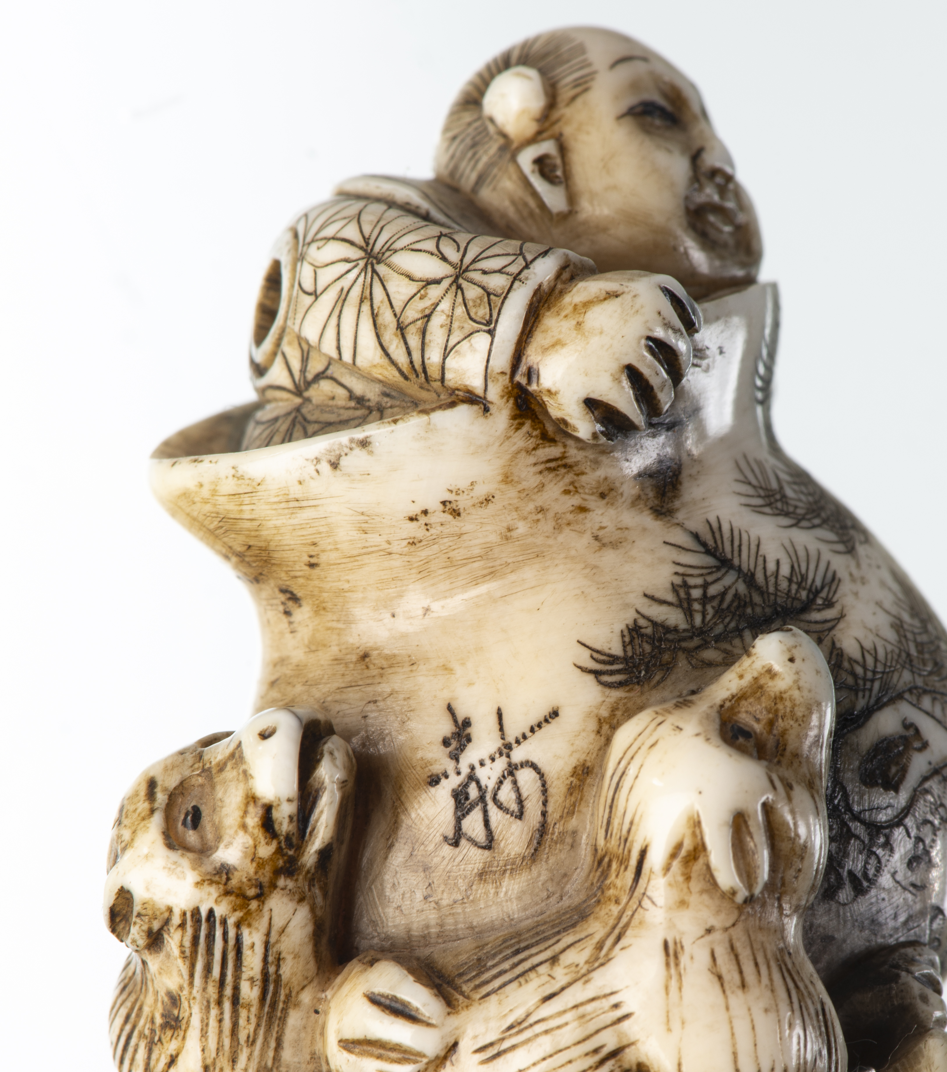JAPON - XXe - Netsuke sculpté en ivoire représentant un personnage sortant d'un vase
