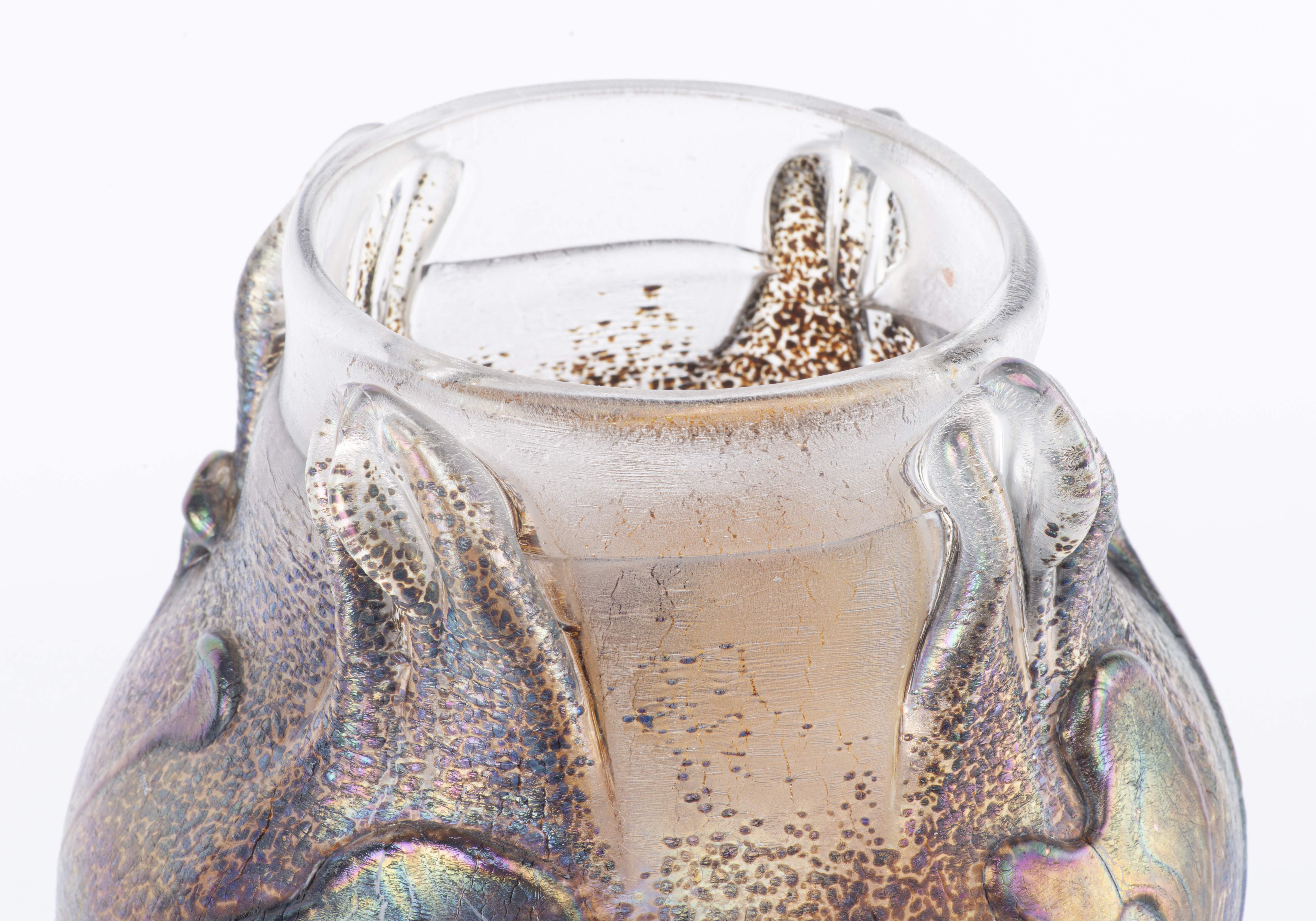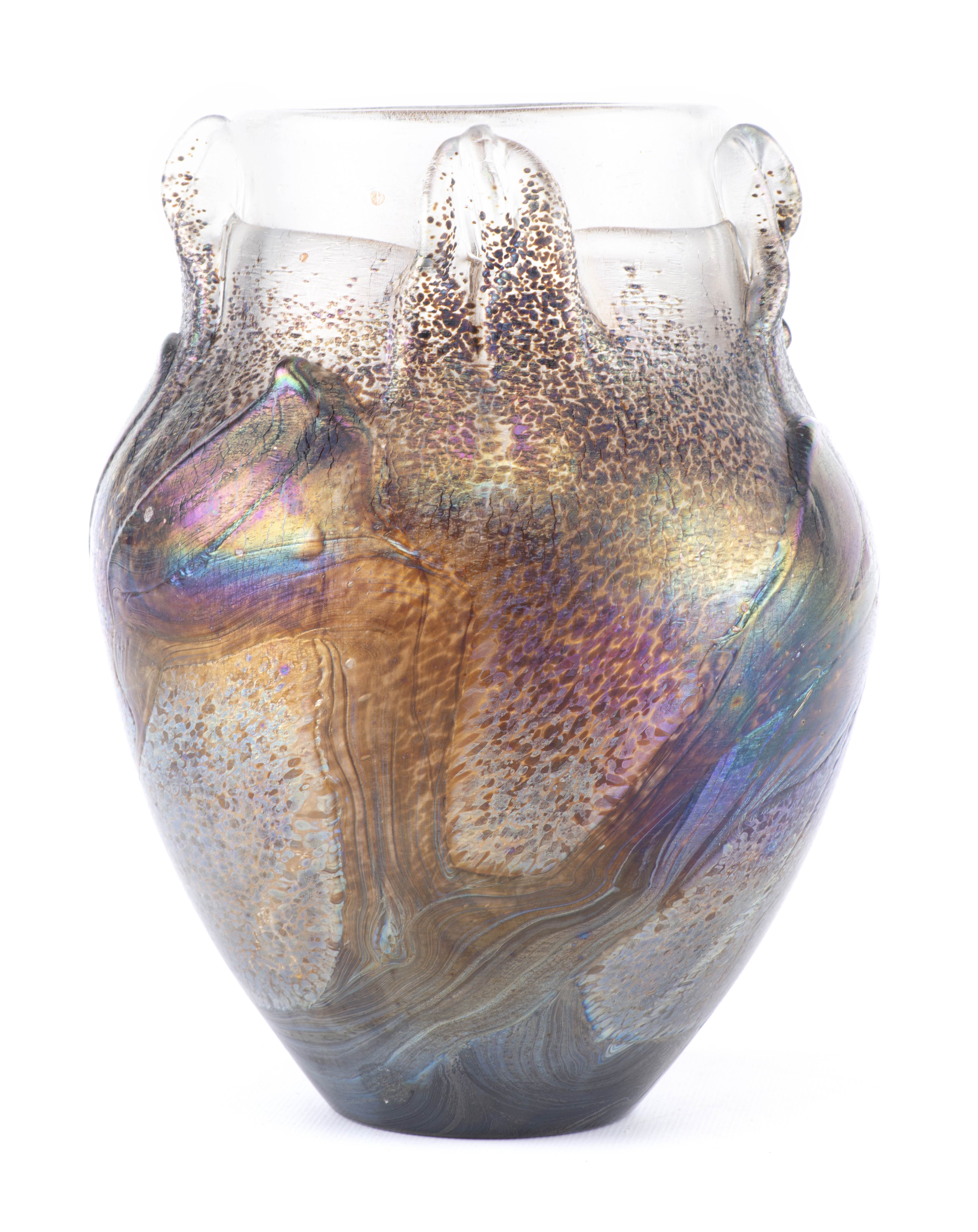 Jean-Claude NOVARO (1943-2015), vase de forme ovoïde en verre soufflé, décor en application à chaud d'éléments bleutés et irisés d'inspiration végétale