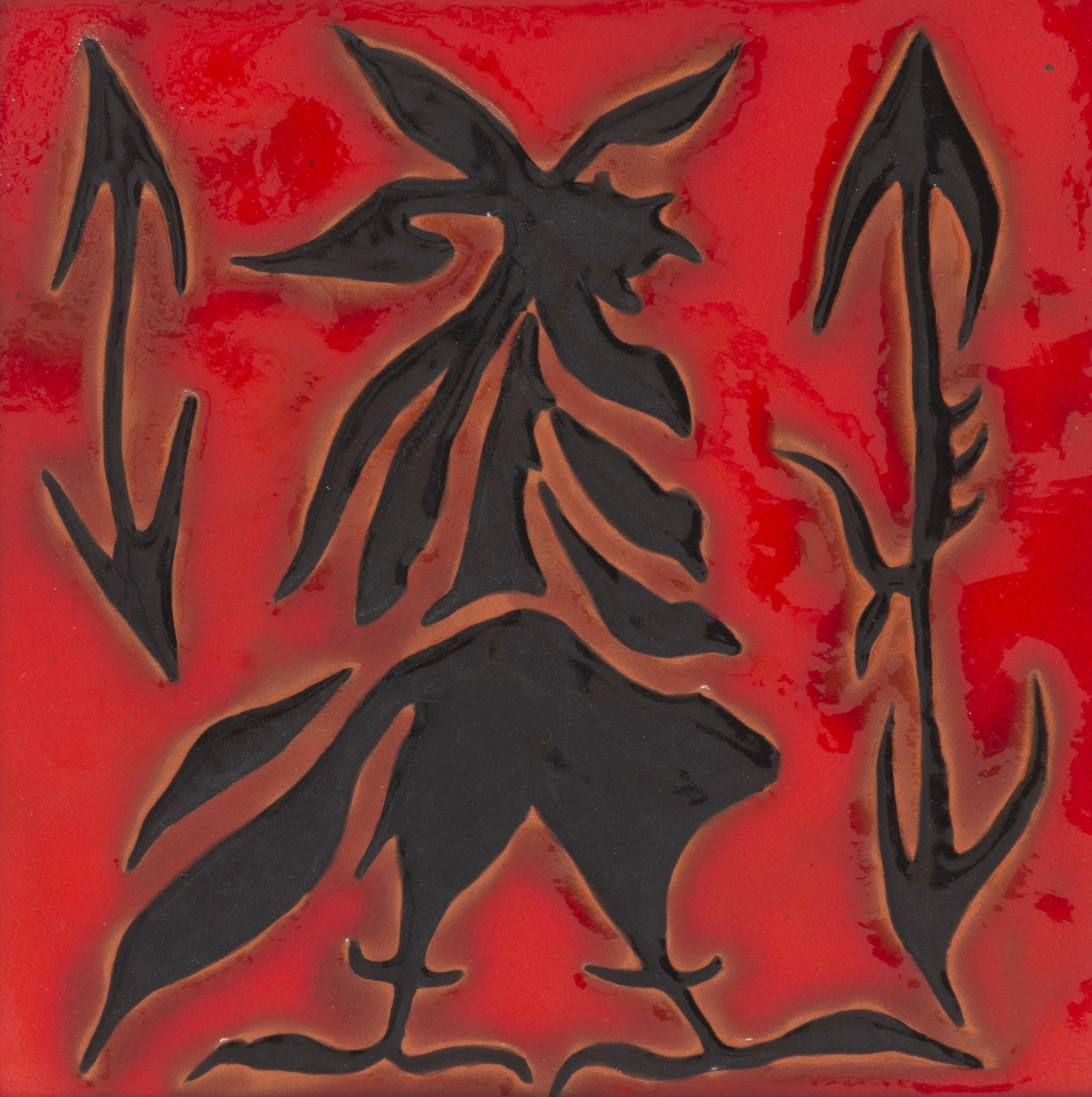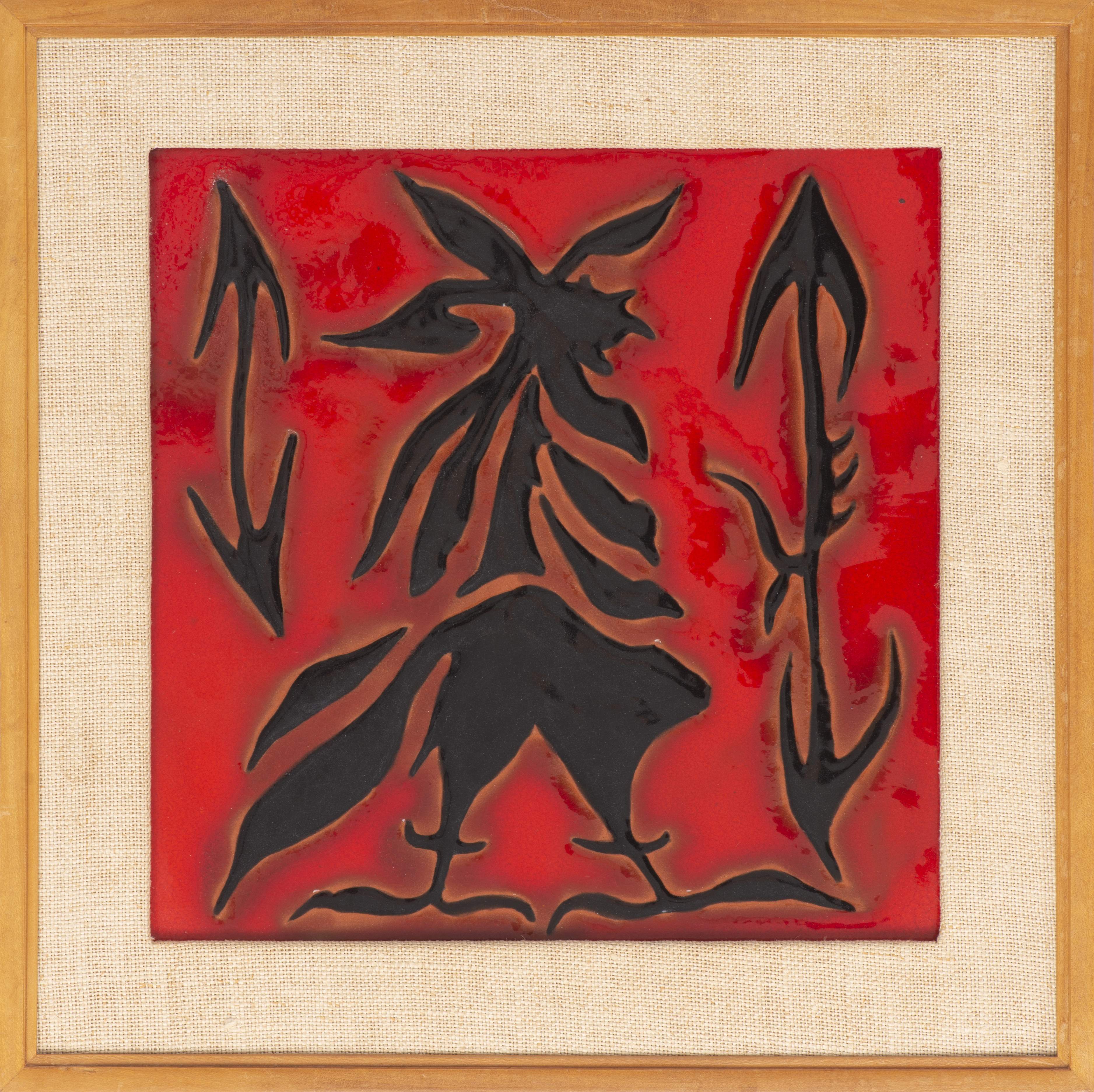 Jean LURCAT(1894-1970), plaque en terre cuite émaillée à couverte rouge et noire, sous cadre, signée au dos J. Lurçat Sant Vicens R-A.