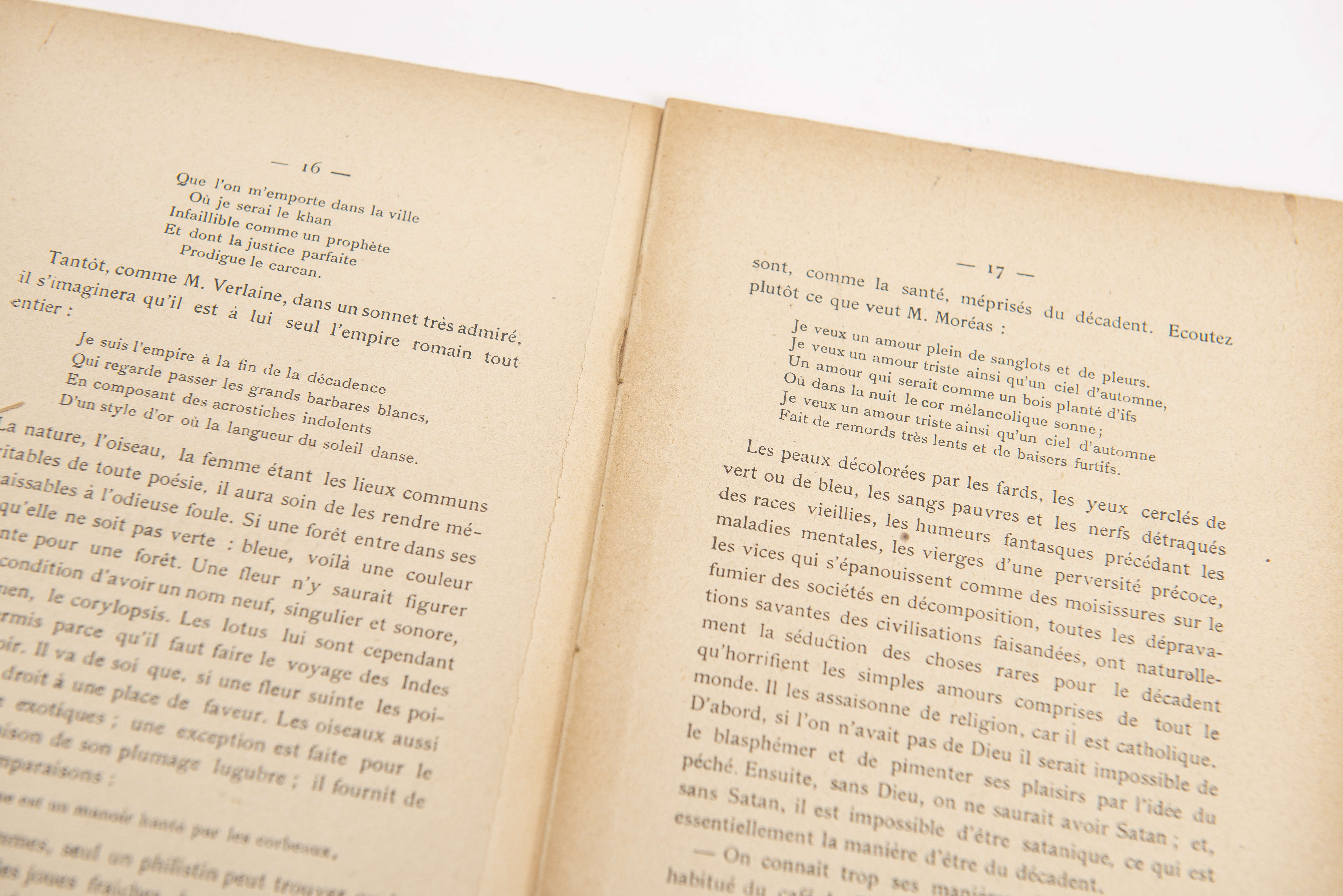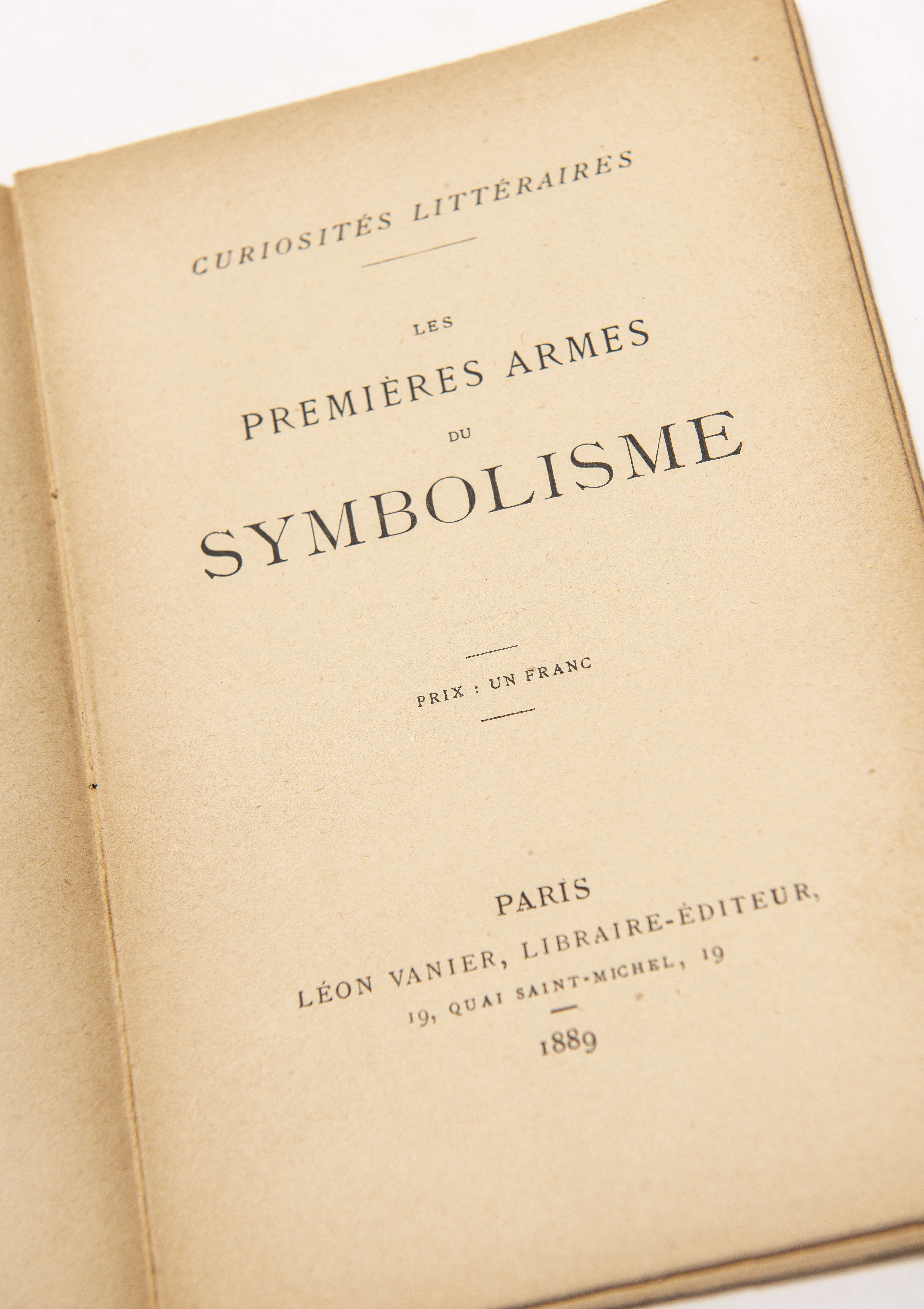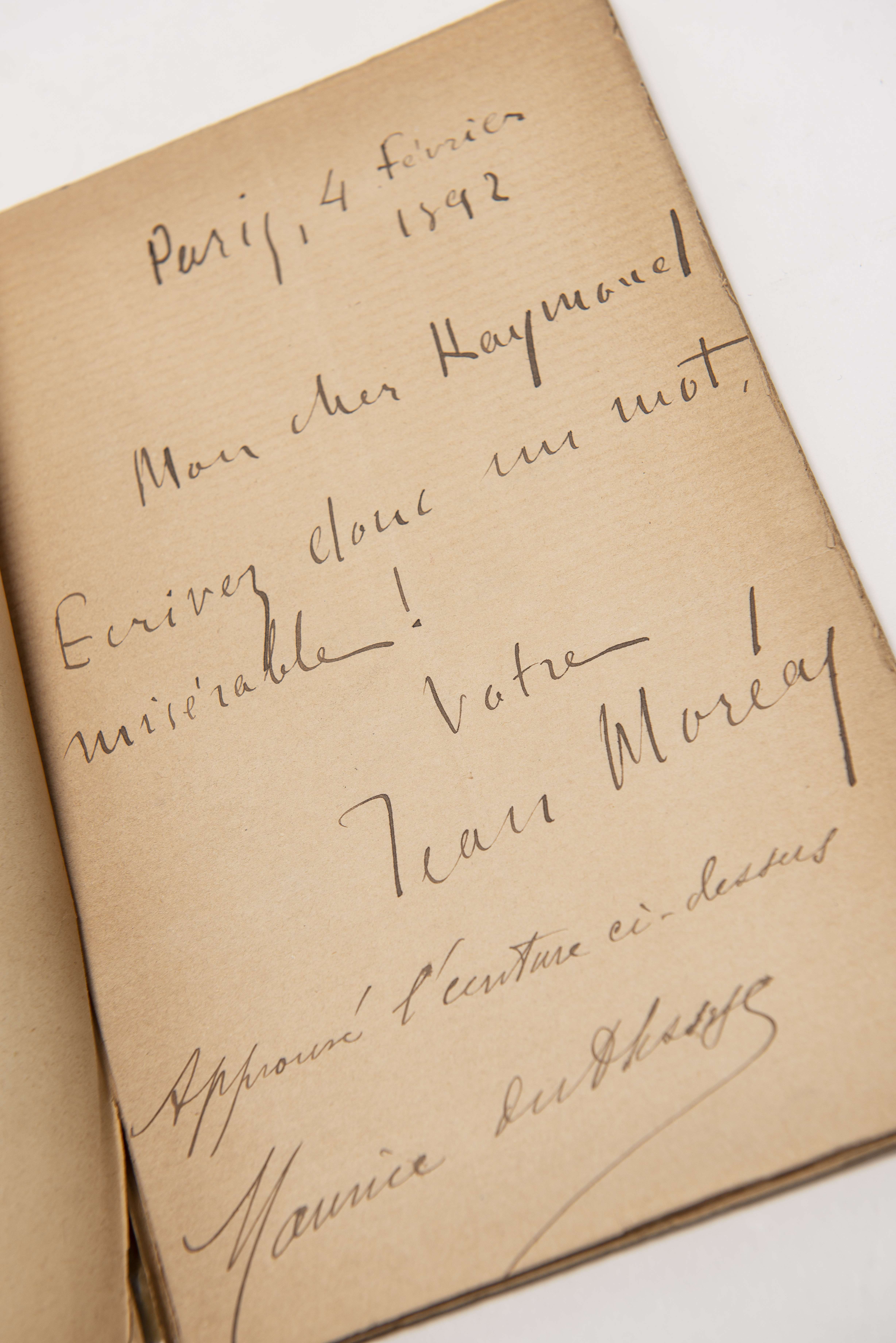 Jean Moréas, Anatole France, Paul Bourde, Léon Vanier, "Curiosités littéraires -Les premières armes du Symbolisme", Léon Vanier, Libr-Editeur, 19 Quai Saint-Michel 19, Paris, 1889. L'exemplaire est accompagné d'une lettre dédicacée "Paris, 4 février 1892, Mon cher Haymauel, Ecrivez donc un mot misérable! votre Jean Moréas - Approuvé l'écriture ci-dessus Maurice Duchasse".