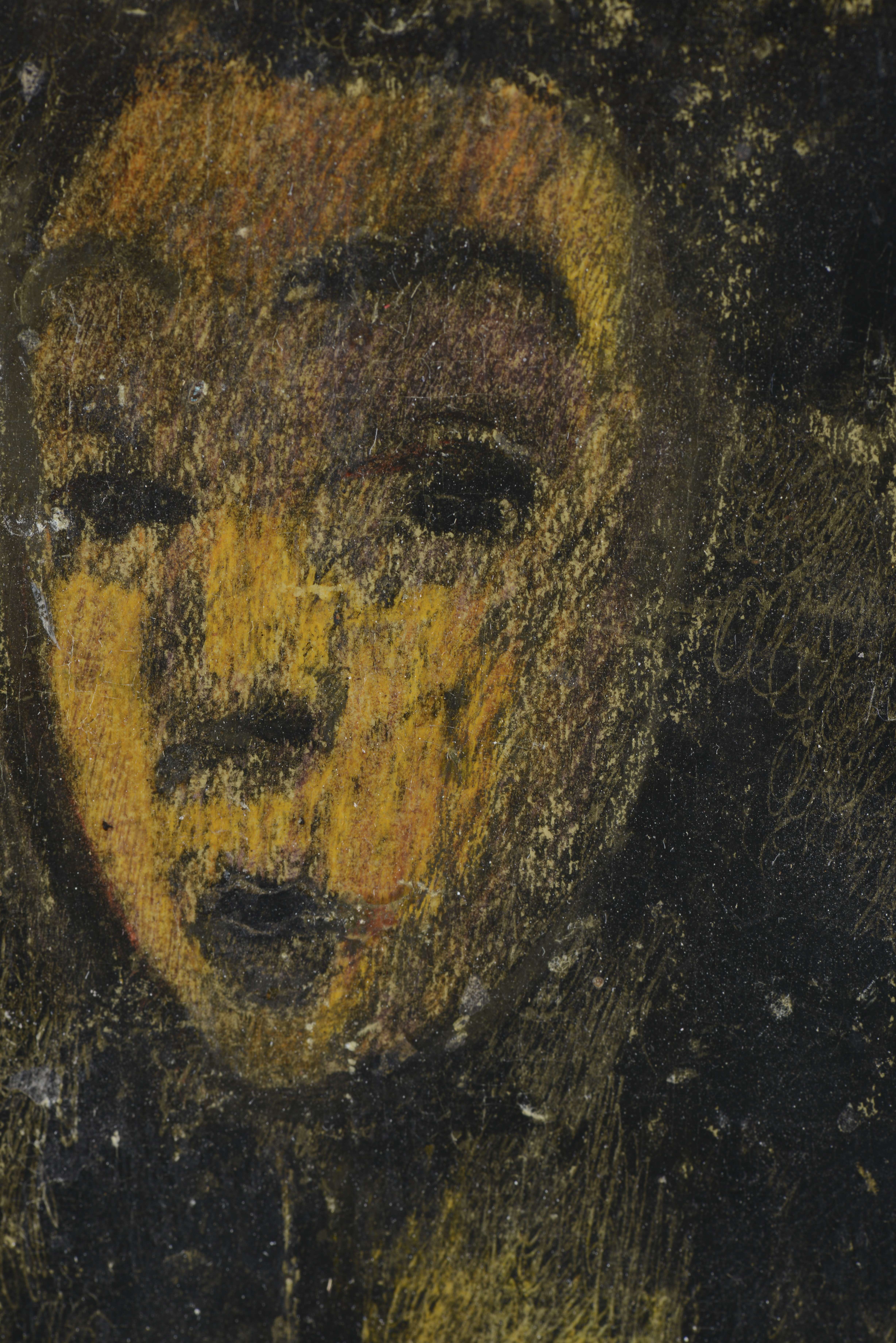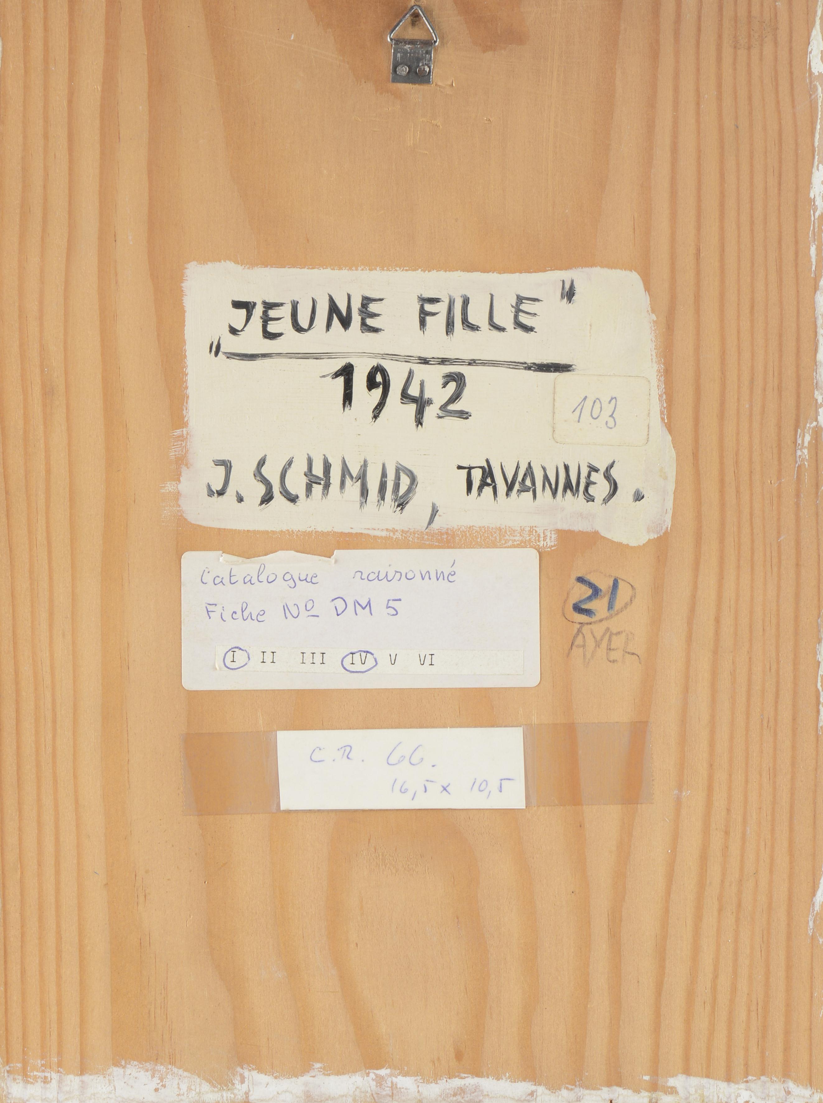 "Composition" (4), crayon gomme laqué sur papier marouflé et collé sur une plaque de bois aggloméré, titré, daté 1942 et signé Lermite - Schmid J. Au dos