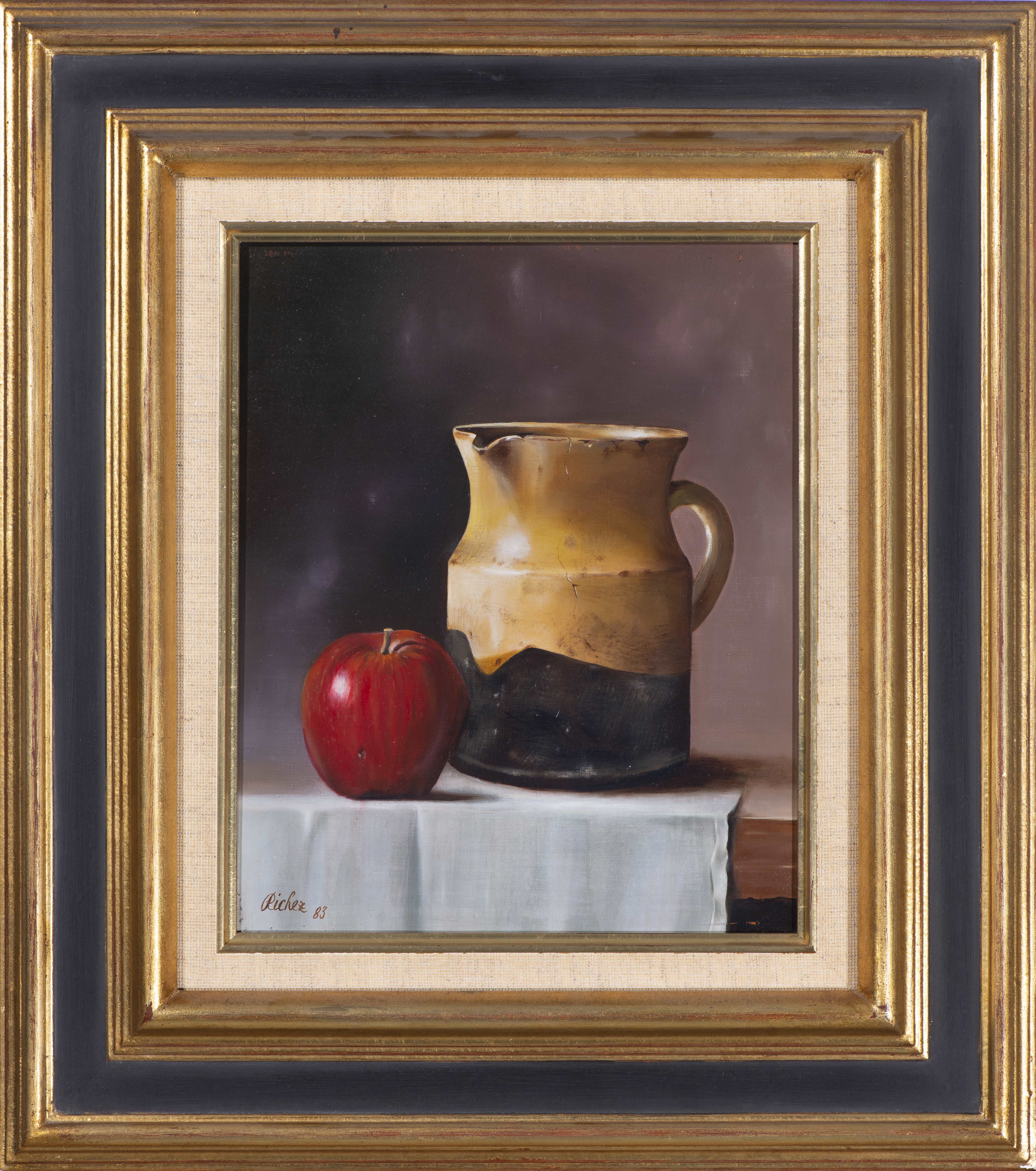 Jean Richez (né en 1929), "Nature morte à la cruche et aux pommes". Huile sur toile, sbg et datée 1983.