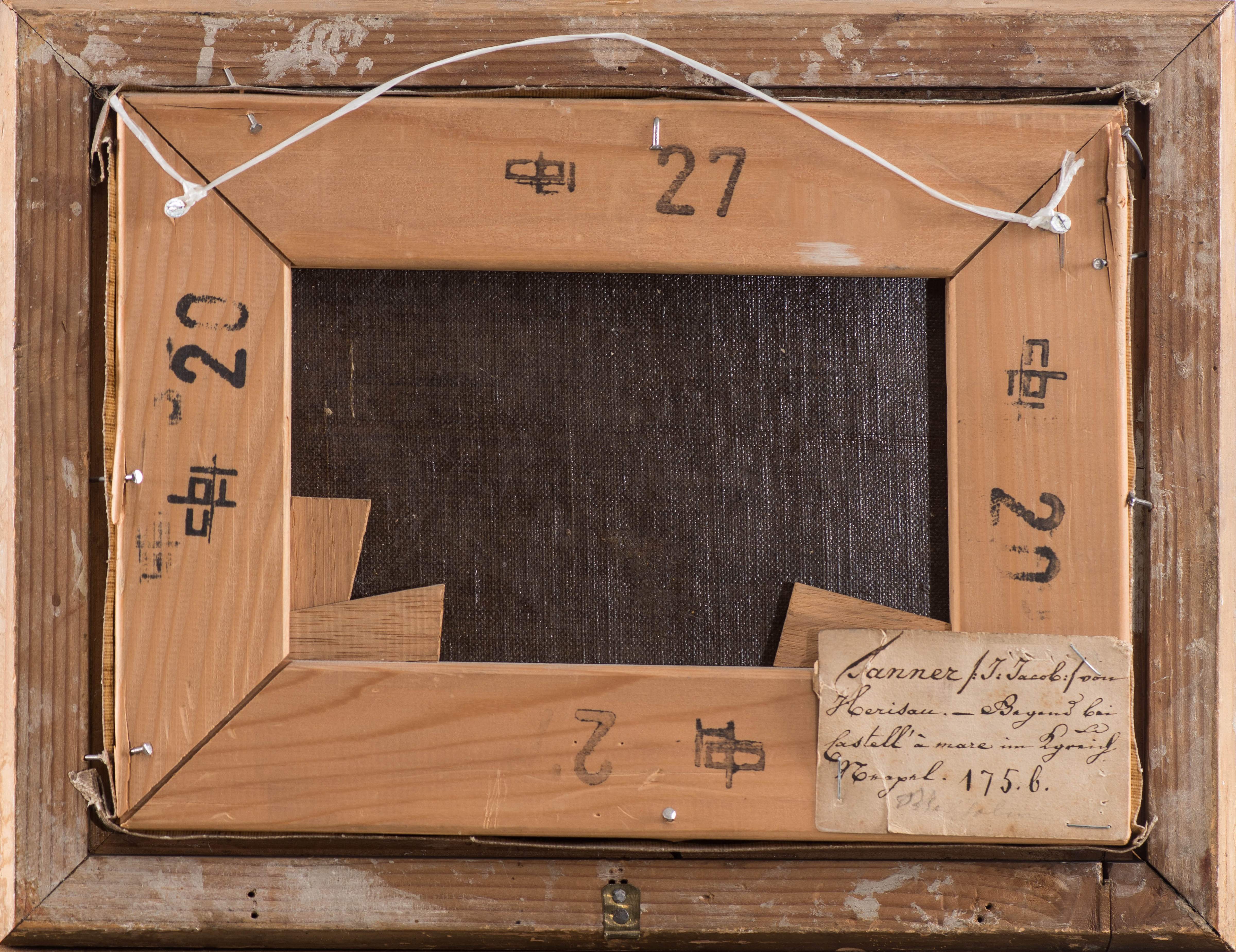 Johann Jakob TANNER (1766-1822), attr. à, "Castellammare, vue avec ânes et chasseurs " huile sur toile, billet au dos du châssis avec inscription "Tanner f: J.: Jacob: f von Herisau - Gegend bei Castell'à mare im … Neapel 175.b."