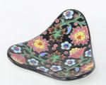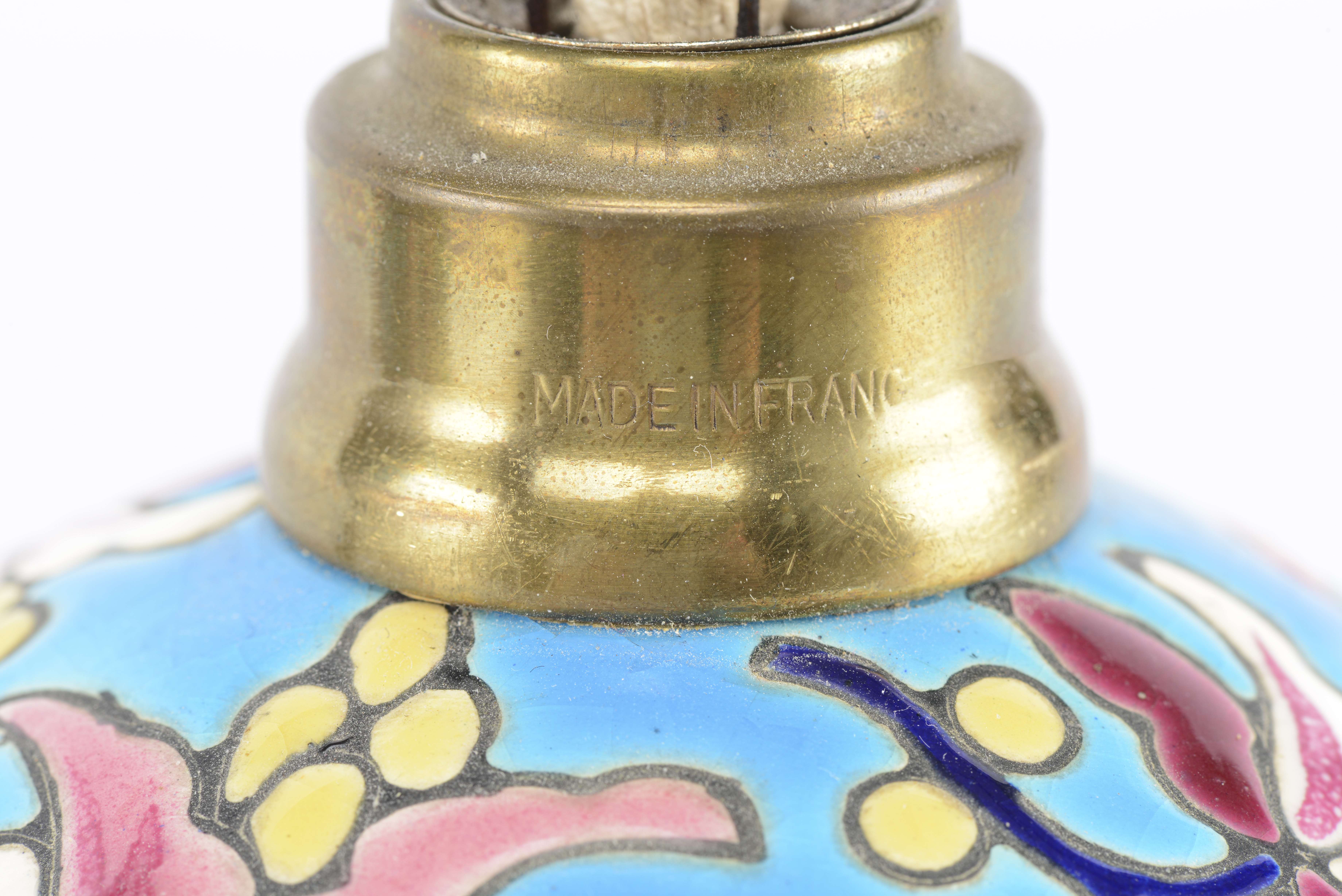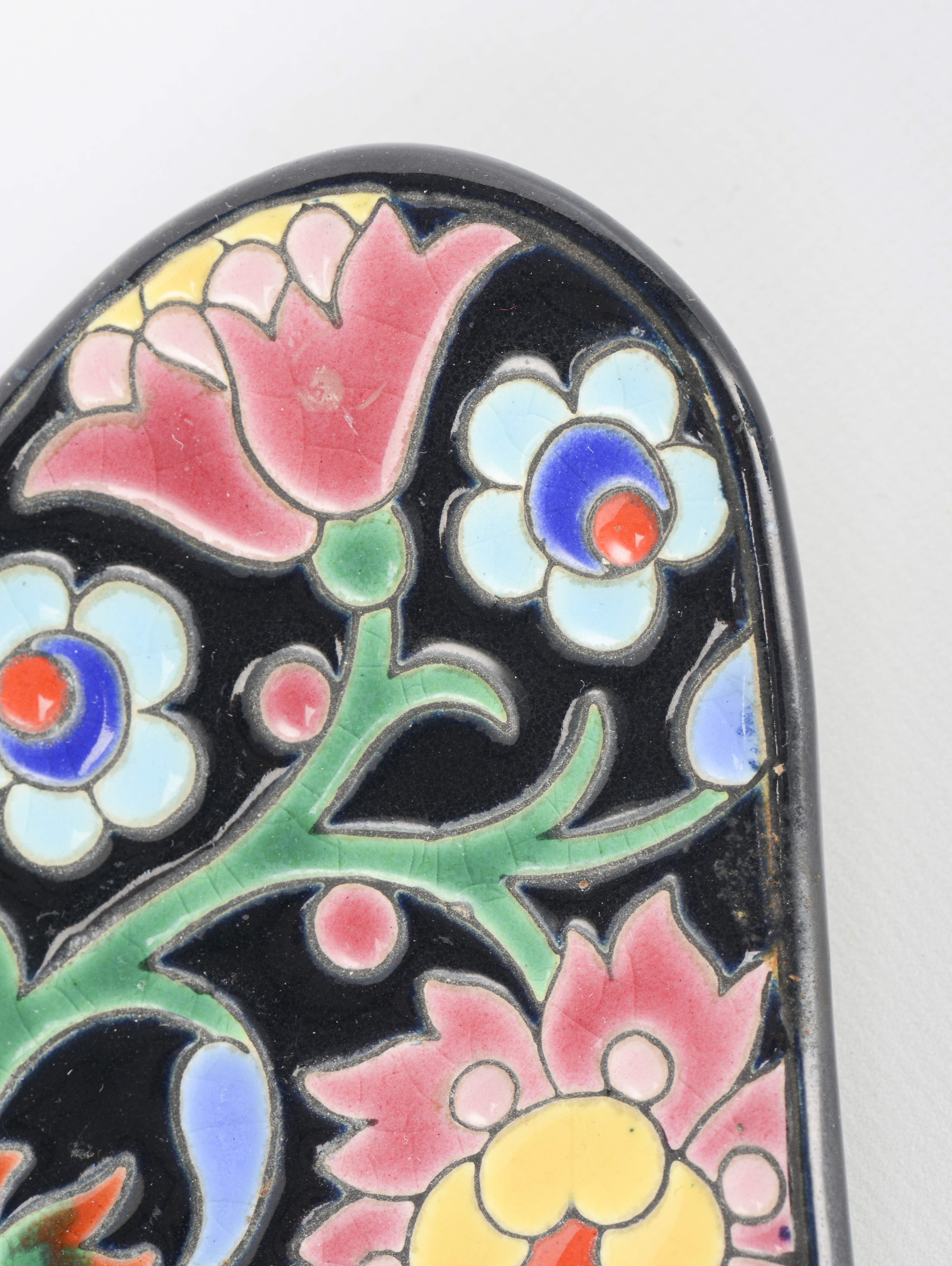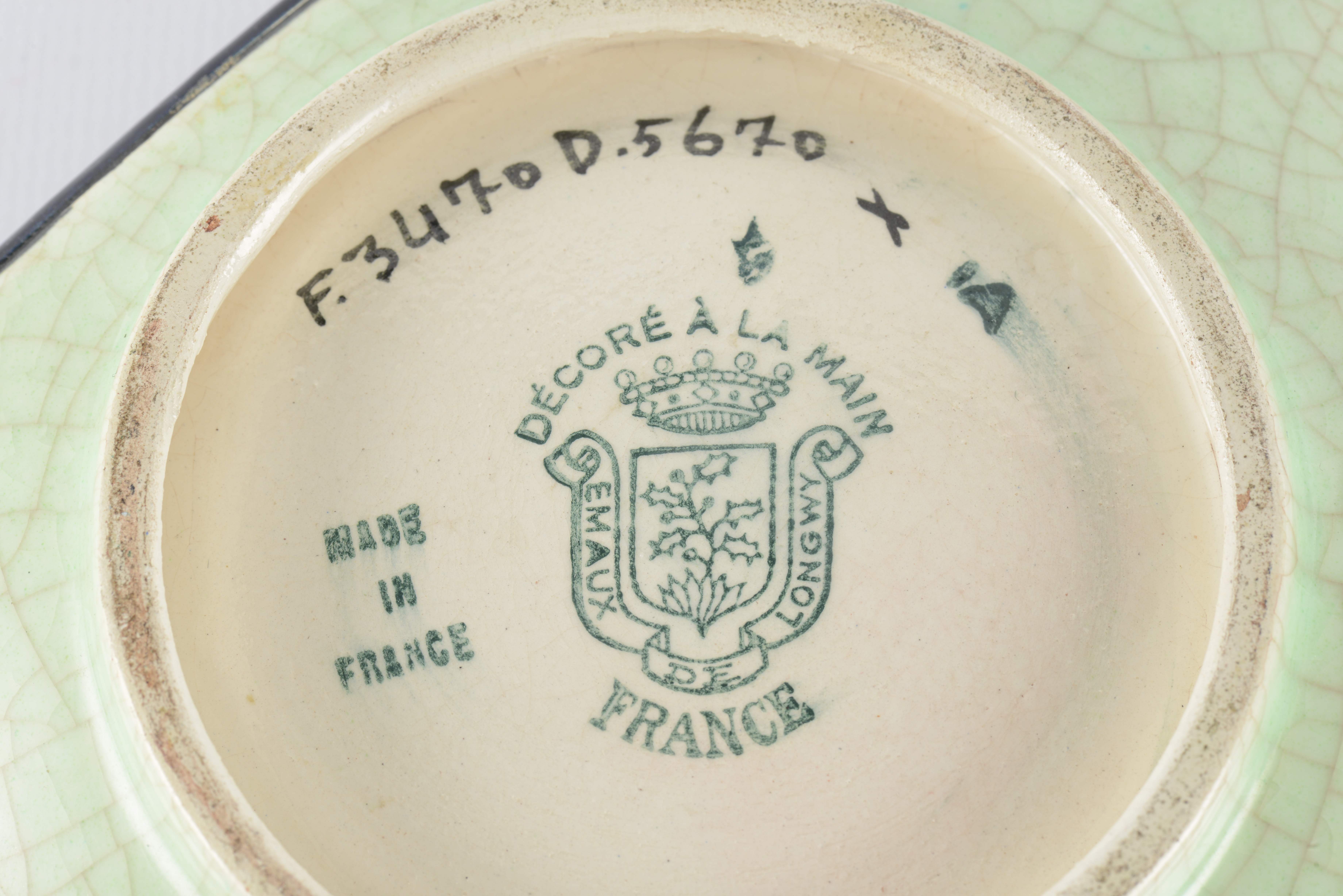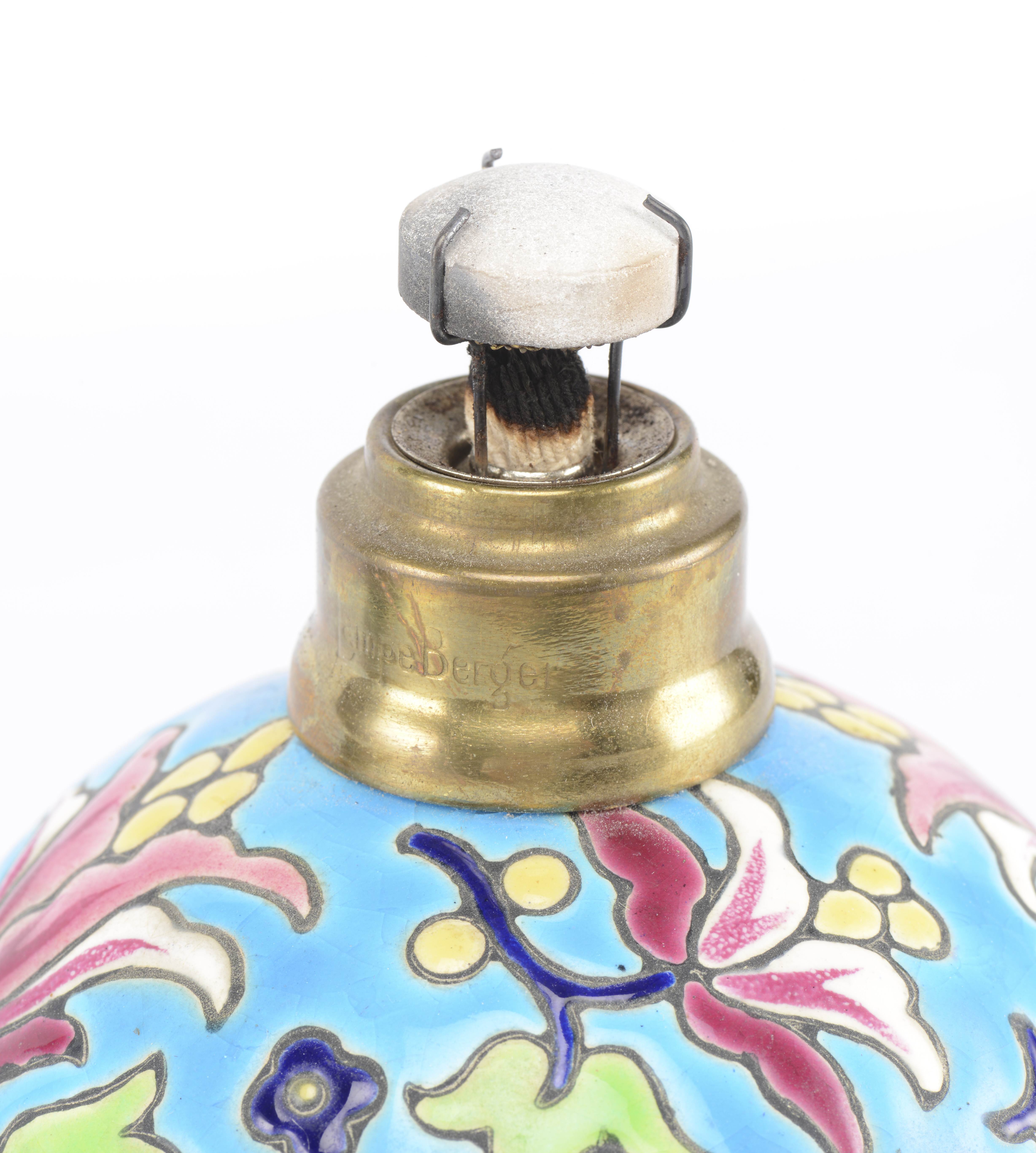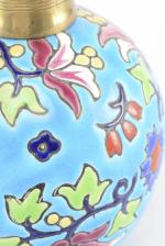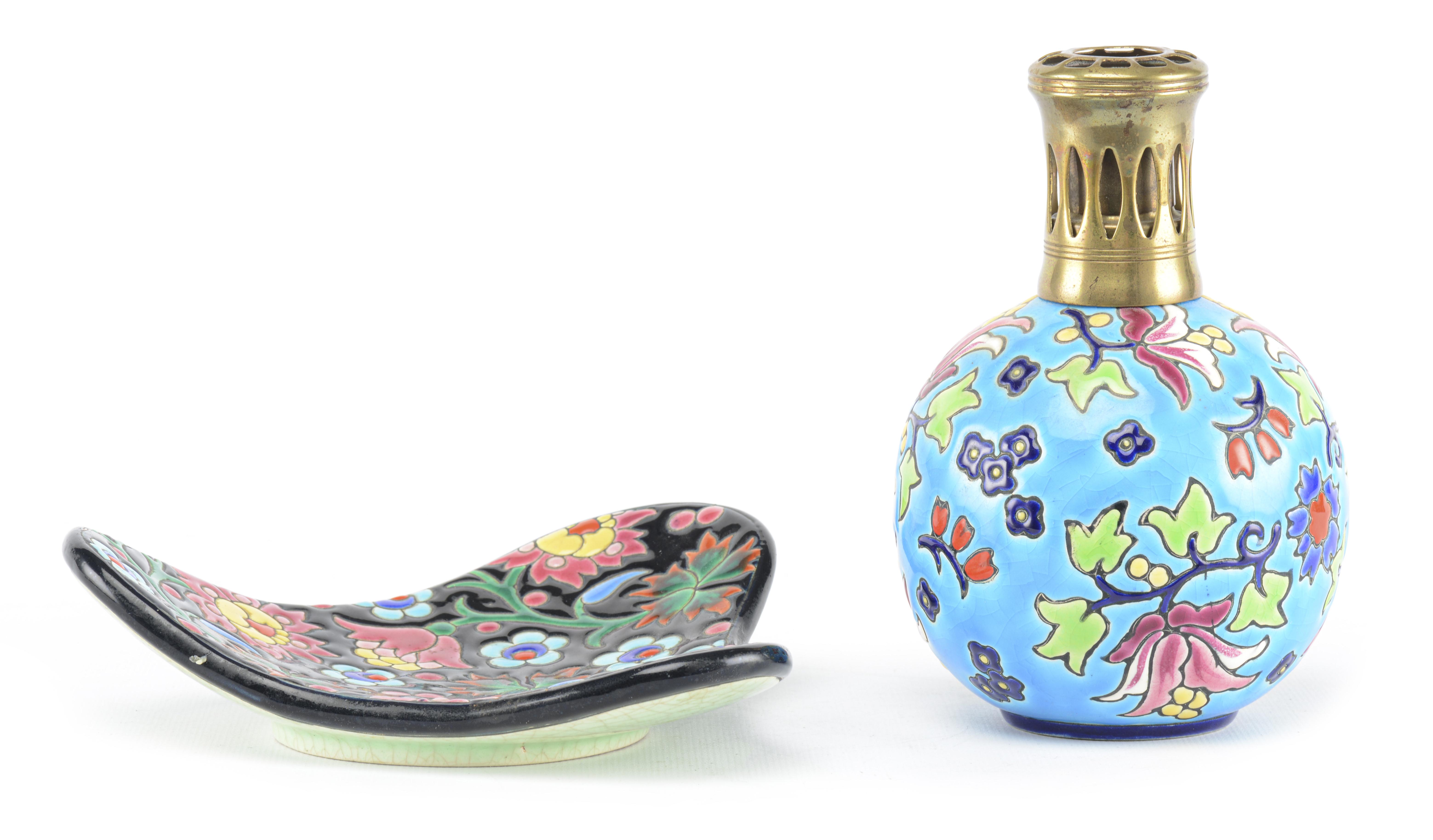 Lampe berger boule et un vide poche en faïence de Longwy à décor floral sur champ bleu et sur champ noir.