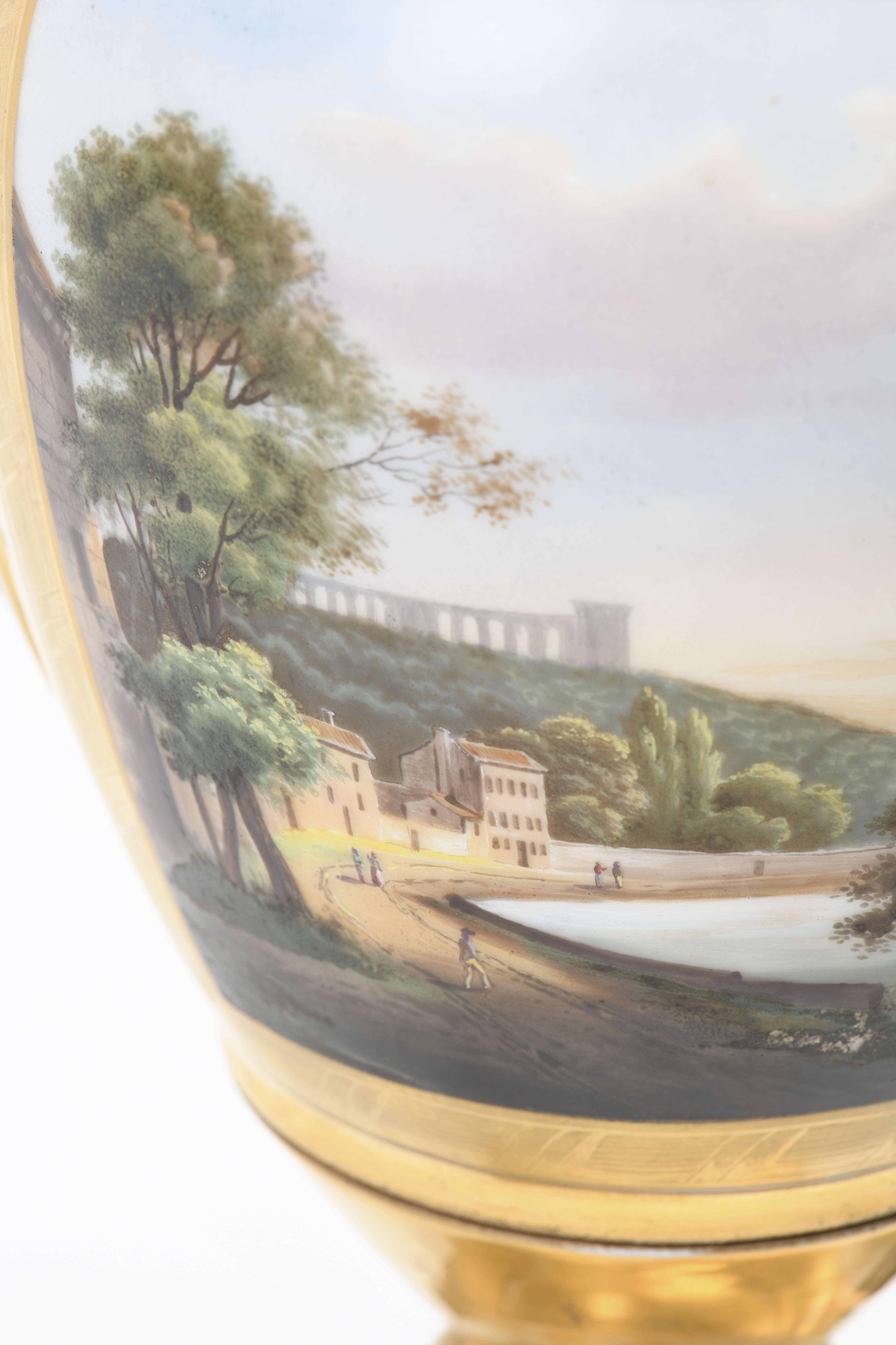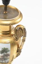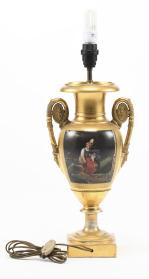 Pied de lampe de table en porcelaine de Paris de style Empire en forme d'urne à 2 anses aux angelots et 2 médaillons carrés, sur l'avers, d'une scène de femme et enfant sous l'orage dans la campagne, et sur le revers, d'un paysage de bord de lac.