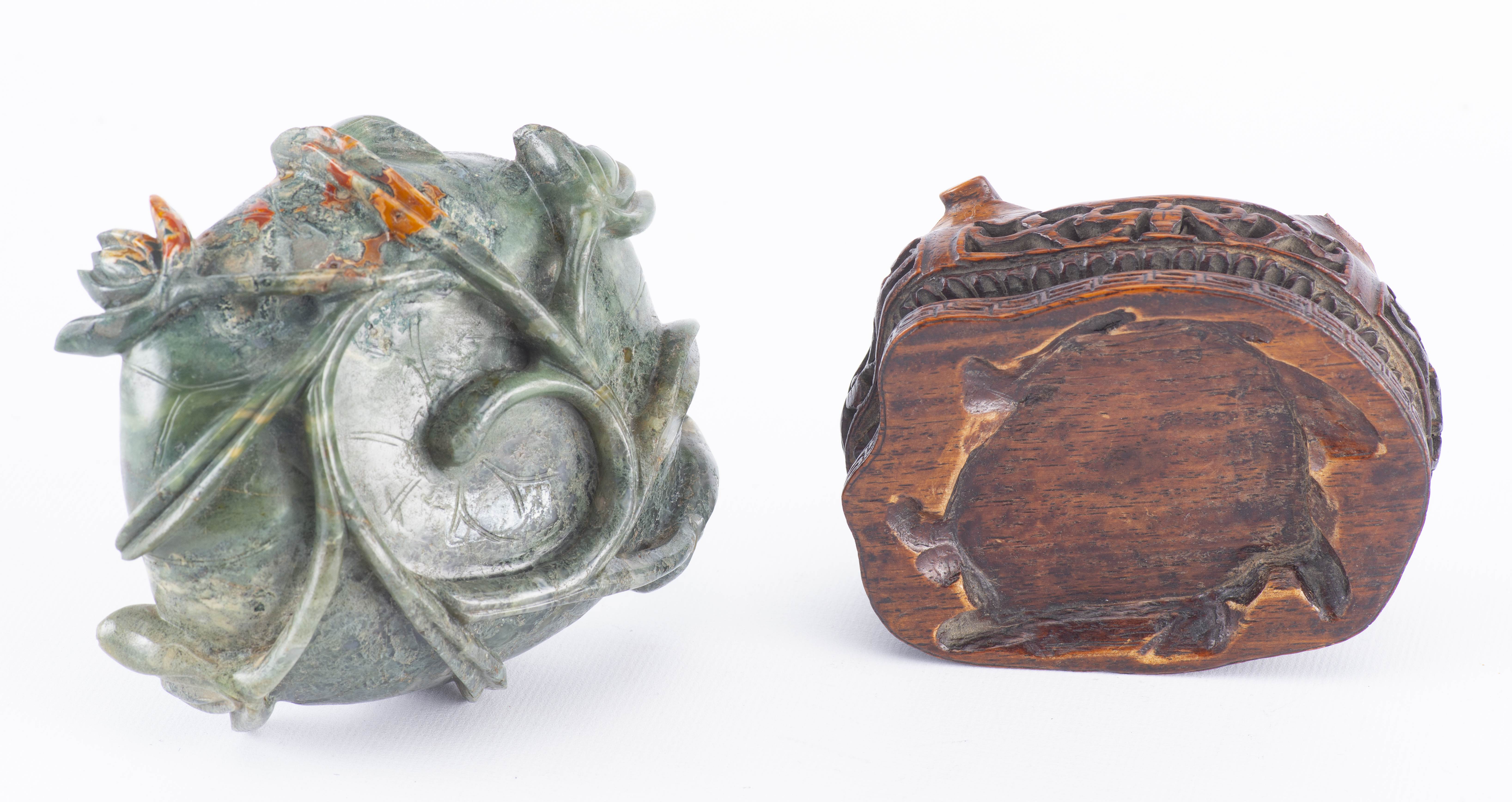 Lave-pinceau en agate verte en forme de feuille de lotus, oiseau, poisson, coquillage et boutons de fleurs sur le pourtour en relief.