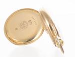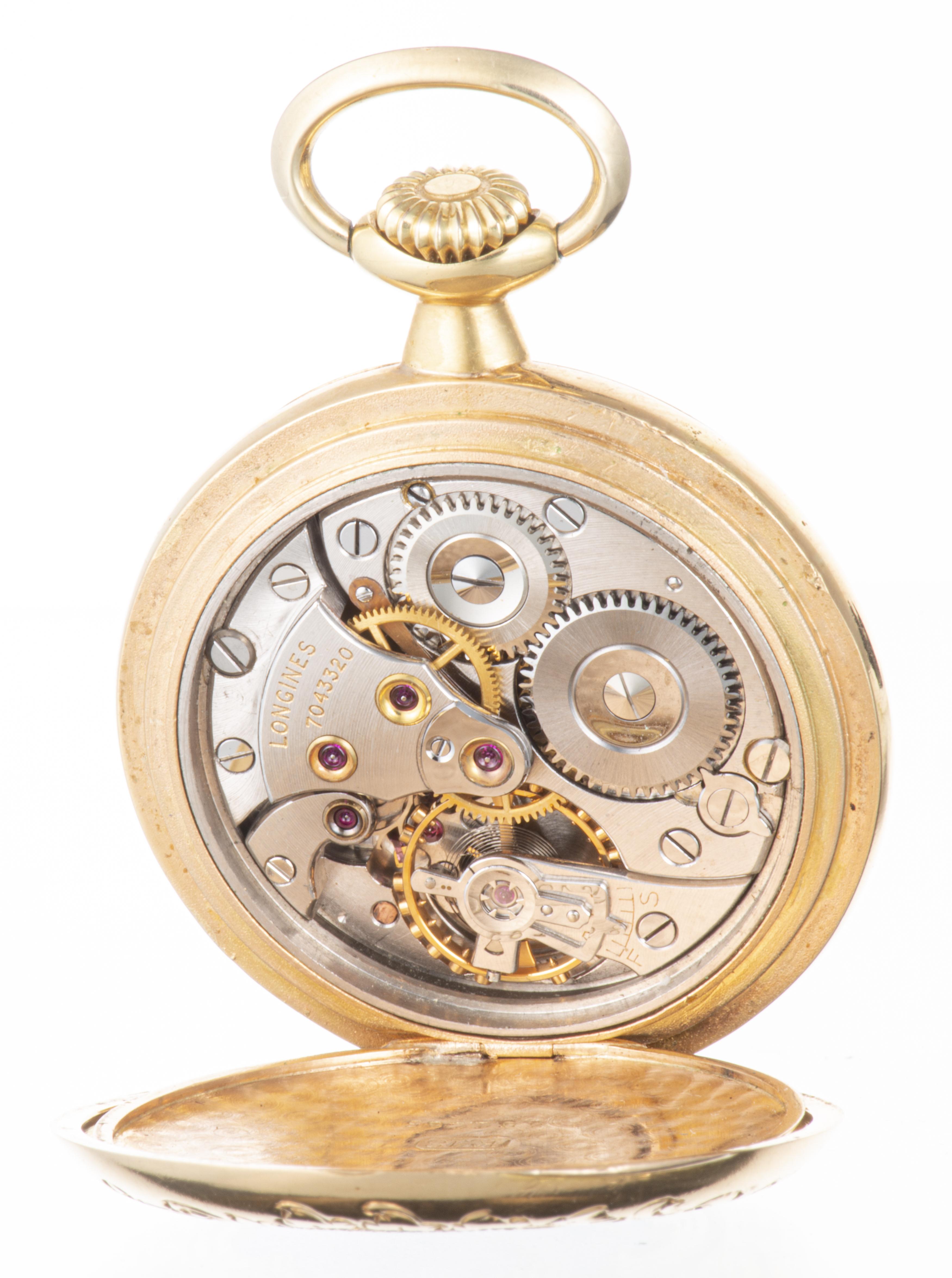LONGINES, Montre de cou en or 750, n°894485, annoté "souvenir d'amitié 1898", dos émaillé à décor de putti, cadran jaune à chiffre paire arabe