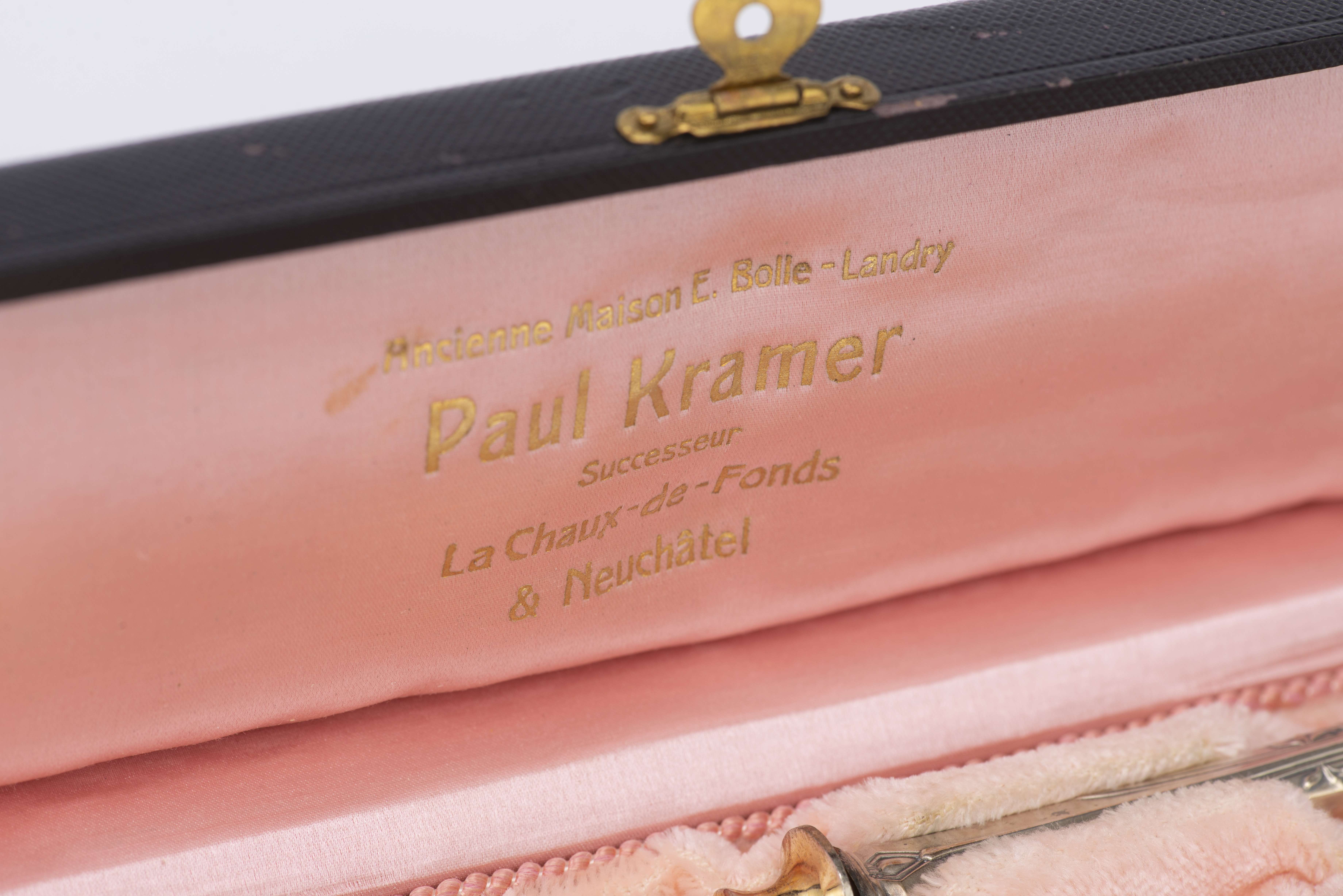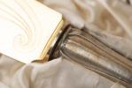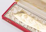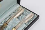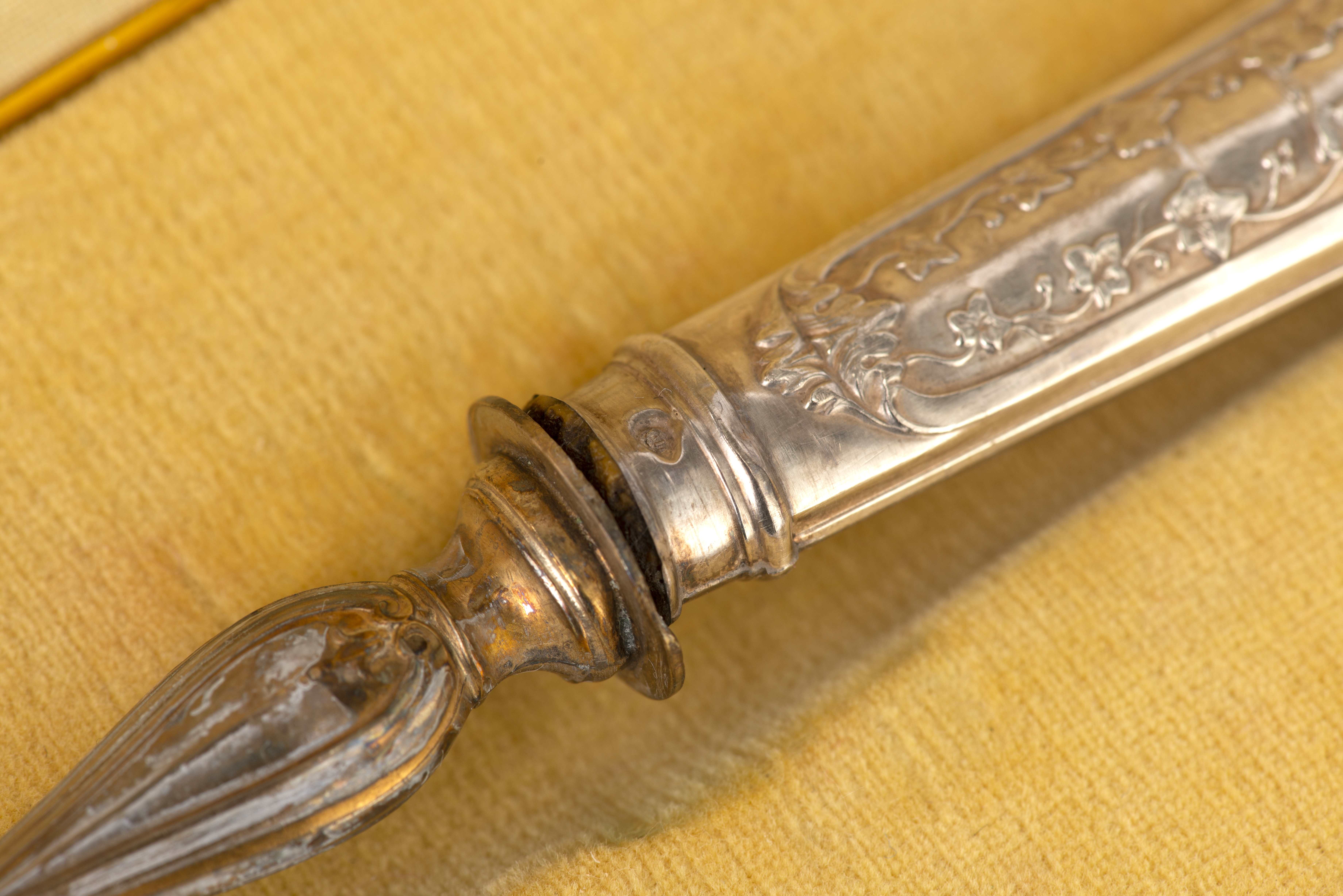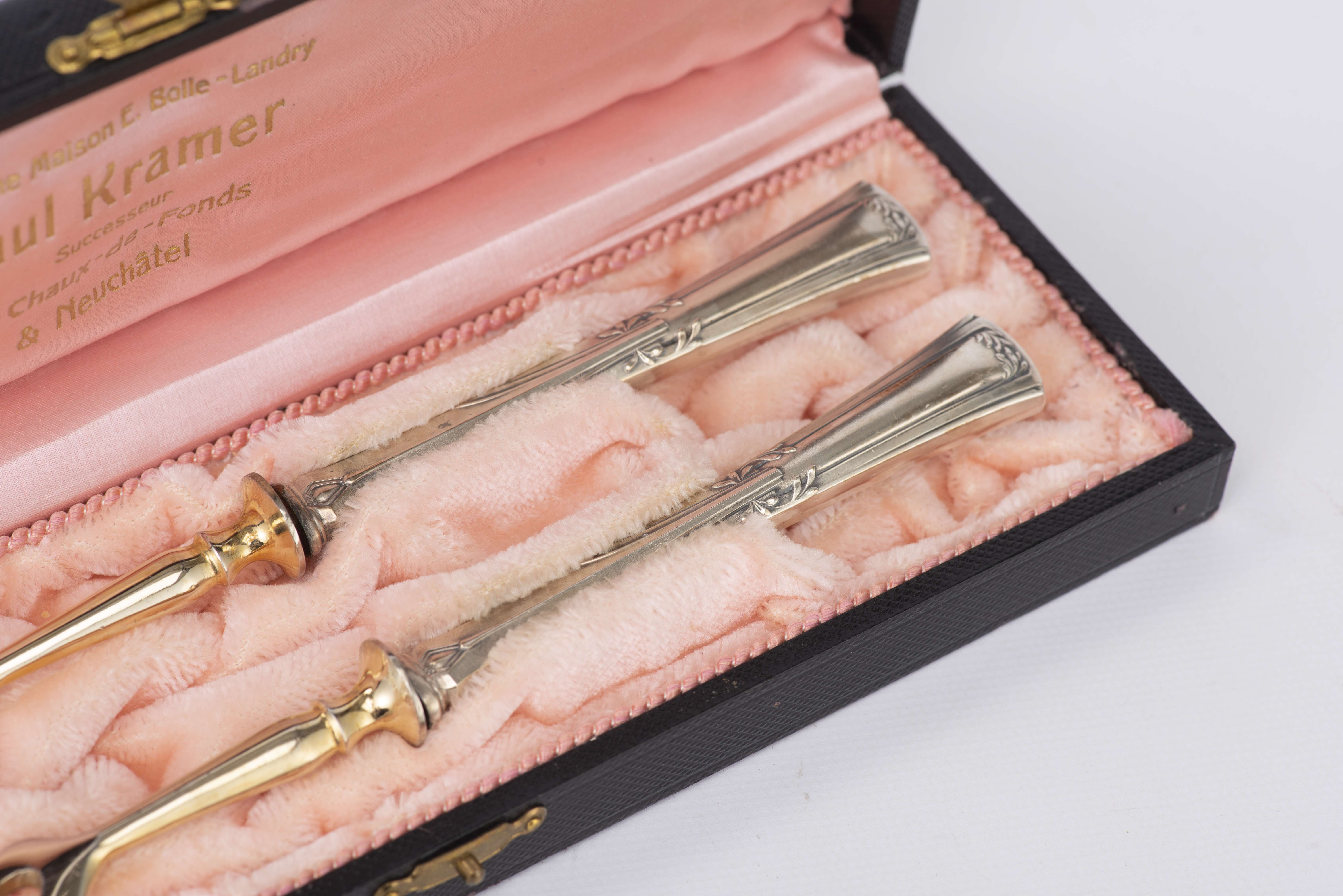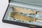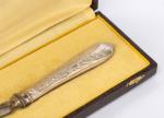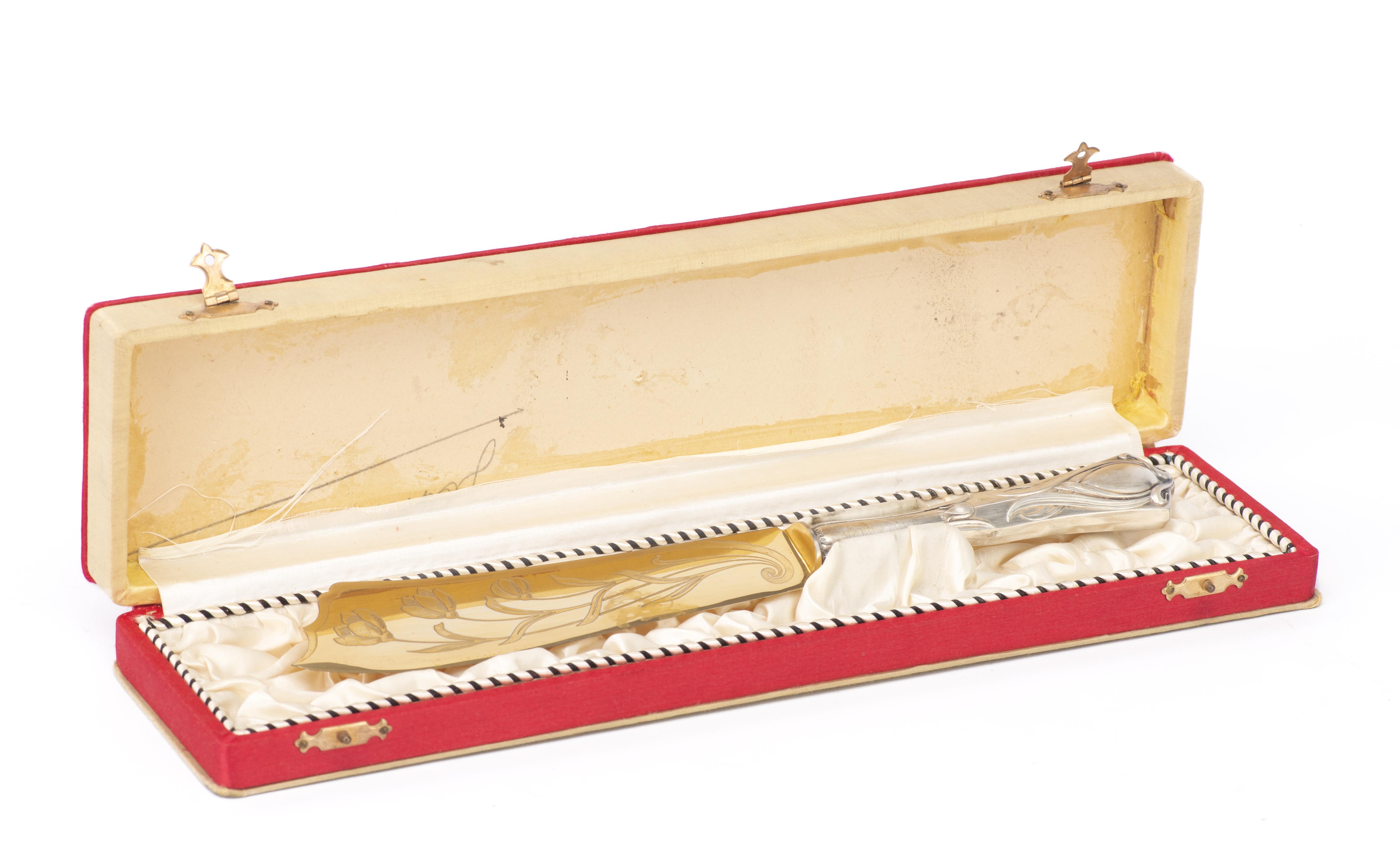 - un couteau à dessert Art nouveau à lame gravée d'un ornement floral en métal doré et manche en argent .835, dans un écrin rouge.