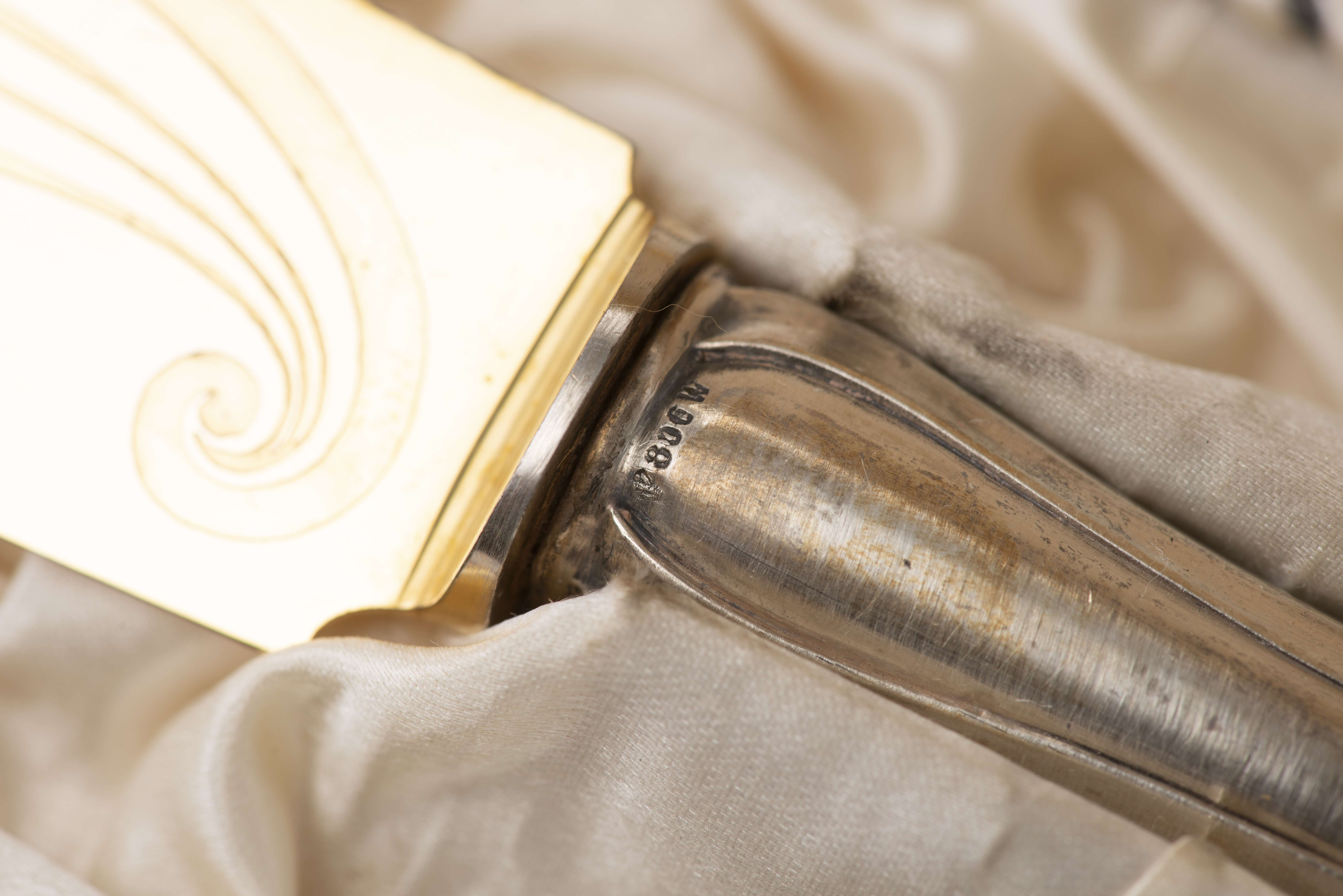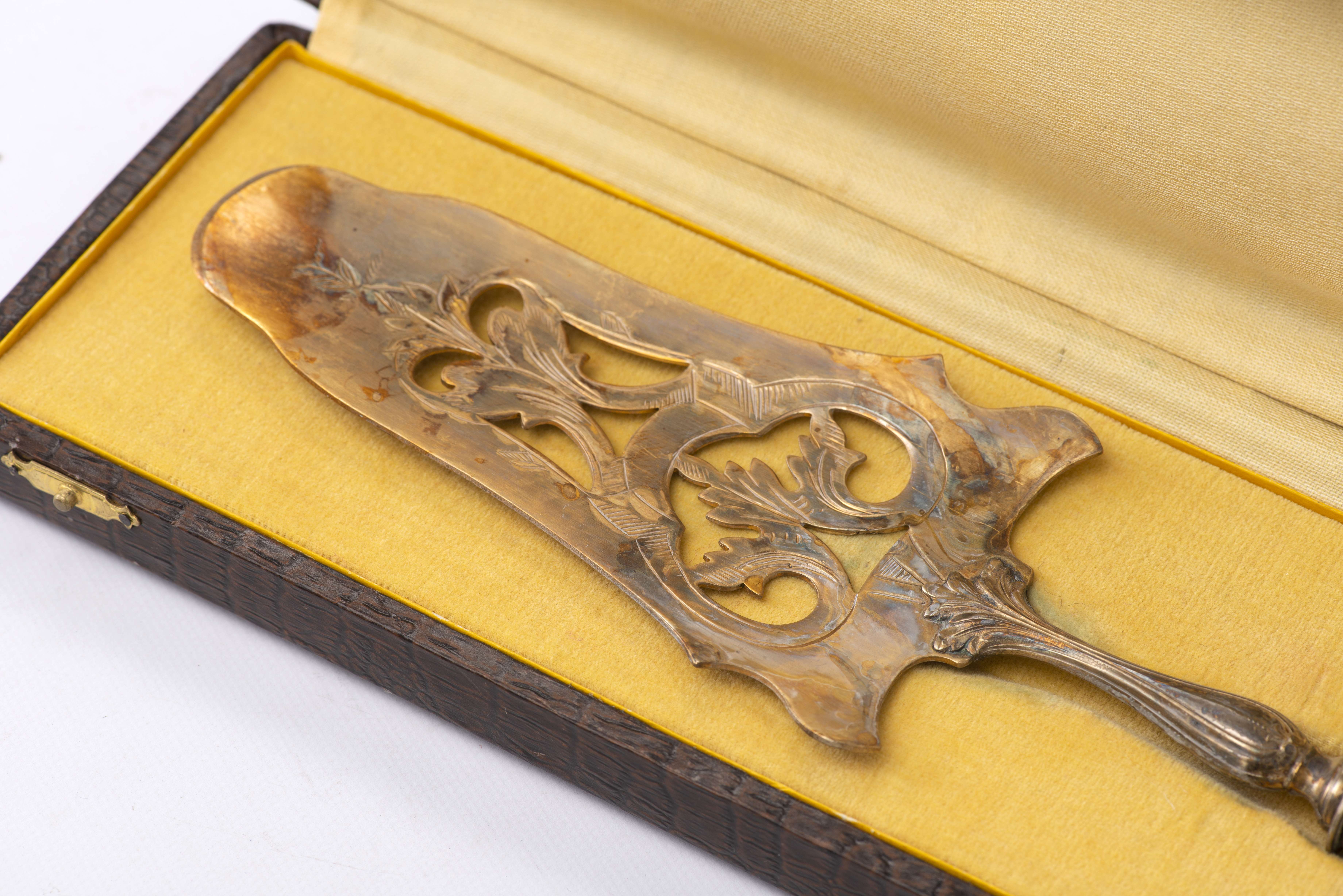 -une pelle à gâteaux en laiton avec manche fourré en argent français 1er titre.