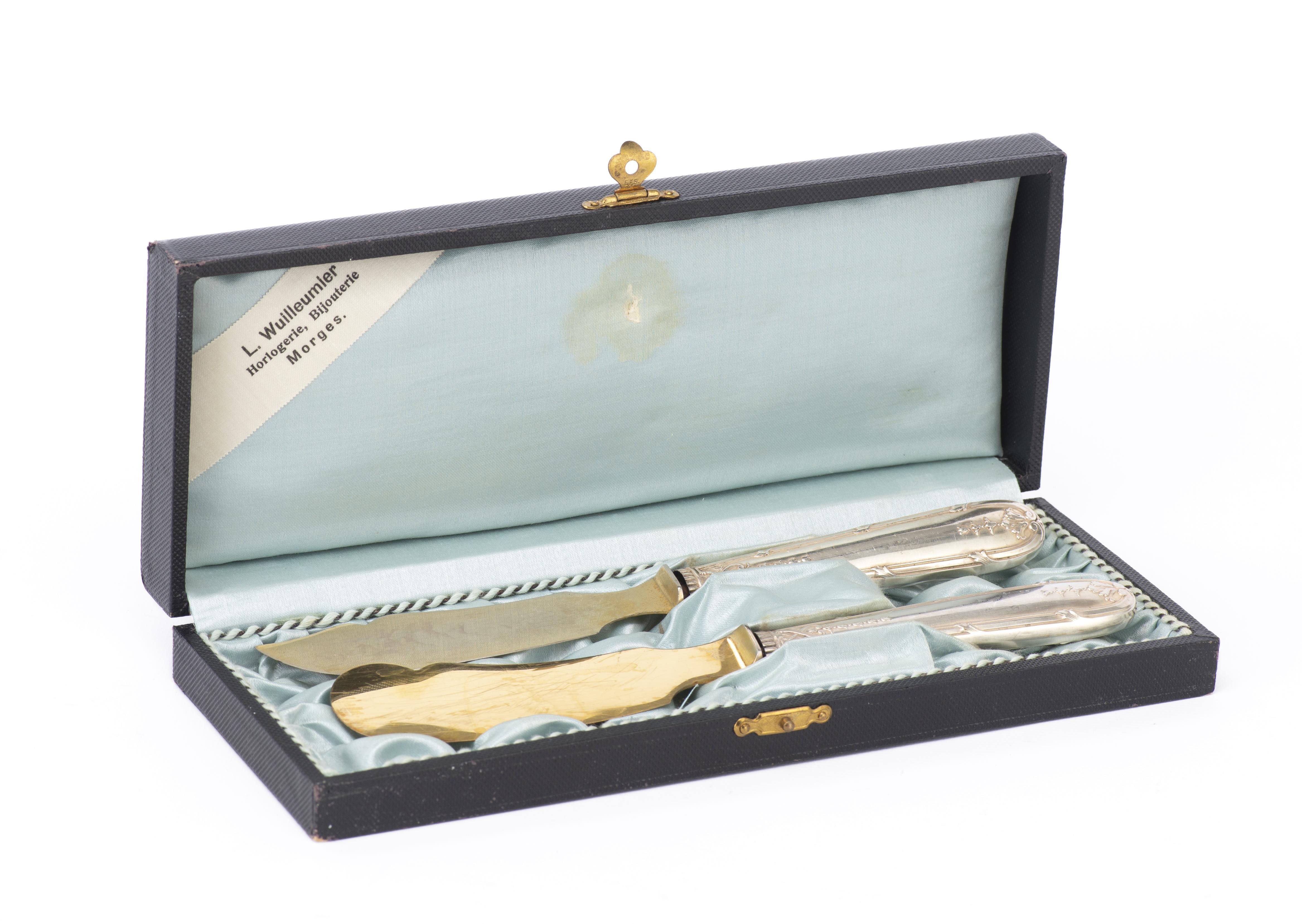 - un couteau à beurre et un à fromage à lame en métal dorée et manche en argent .800 fourré allemand (dans un écrin).