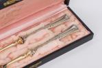 - deux fourchettes à viande froide en métal doré à manche fourré en argent .800, dans un écrin.