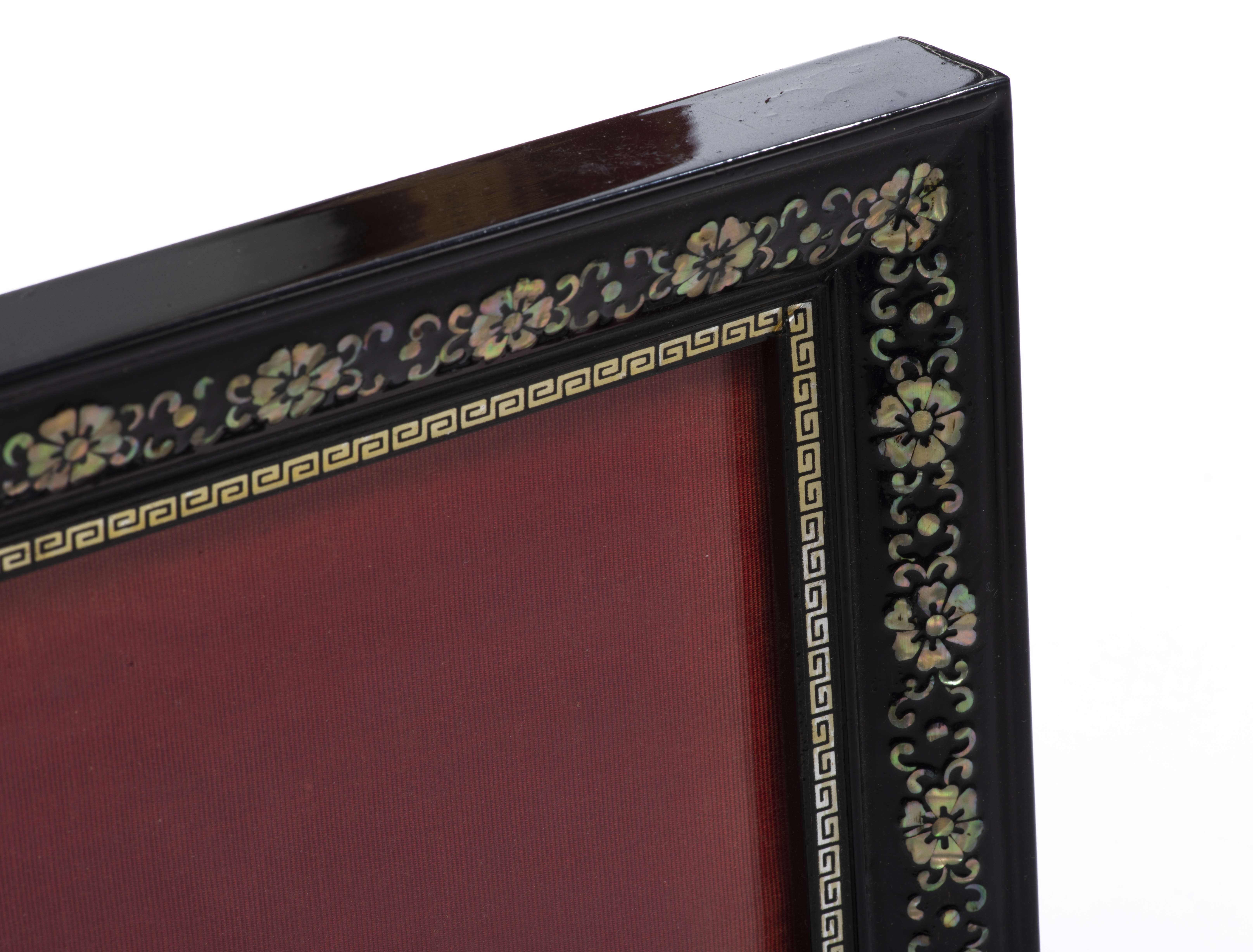 - 1 cadre en laque noire à motifs floraux incrustés en nacre noire, 14x10 cm