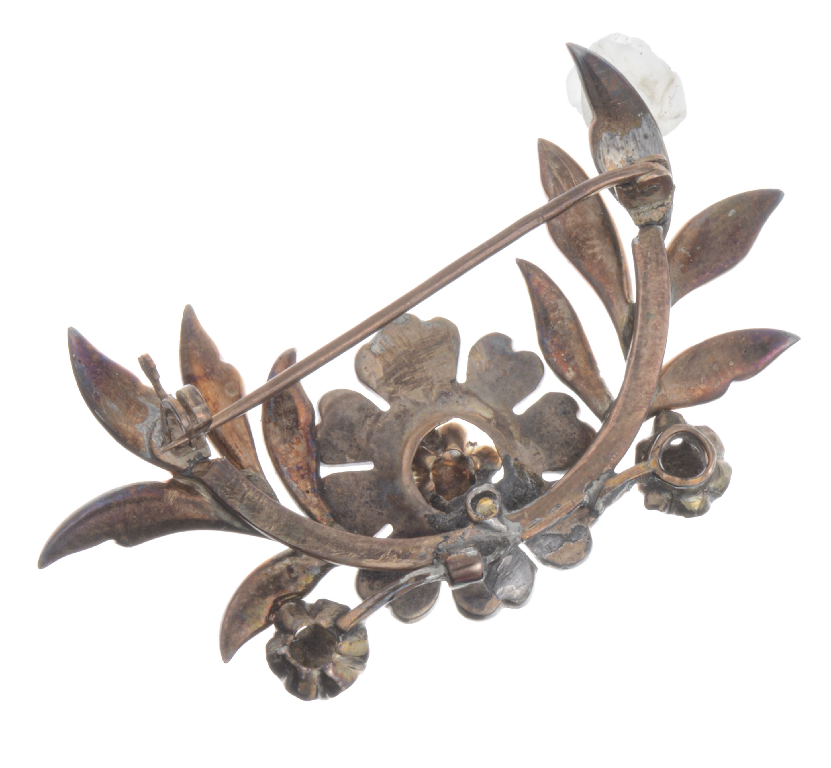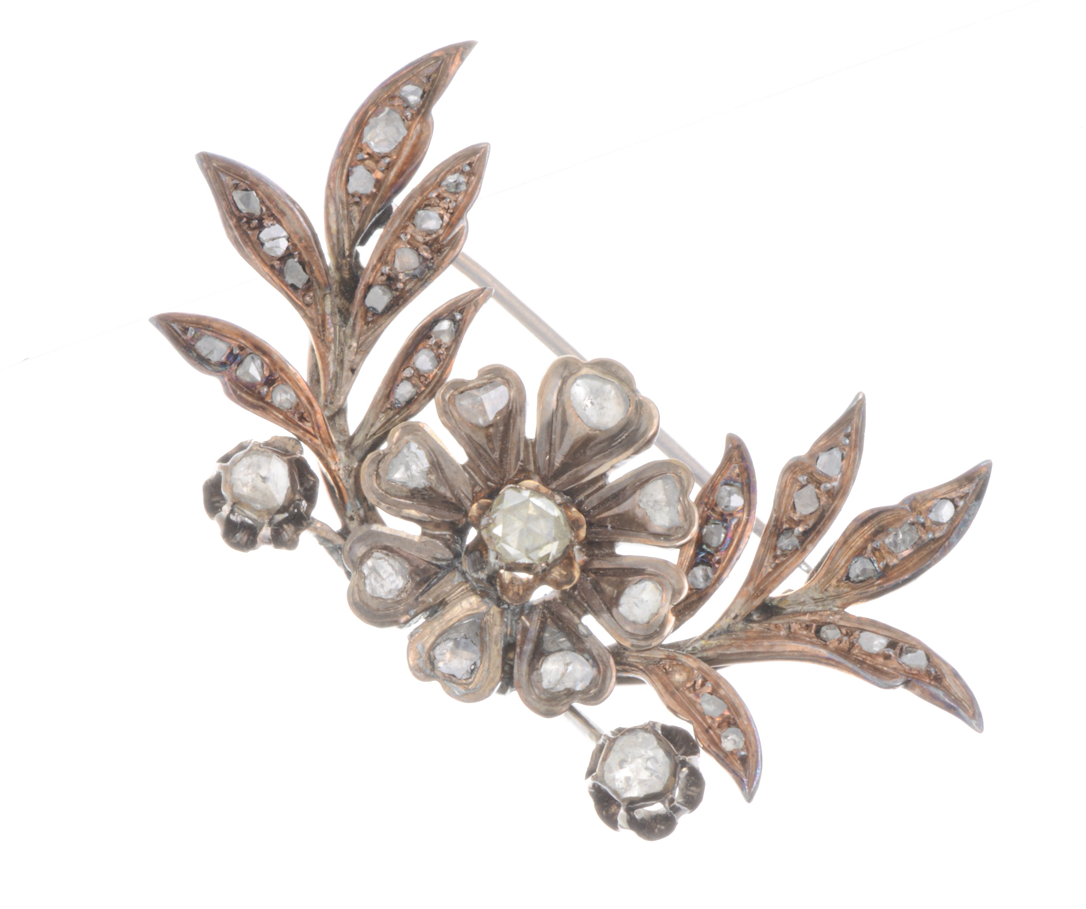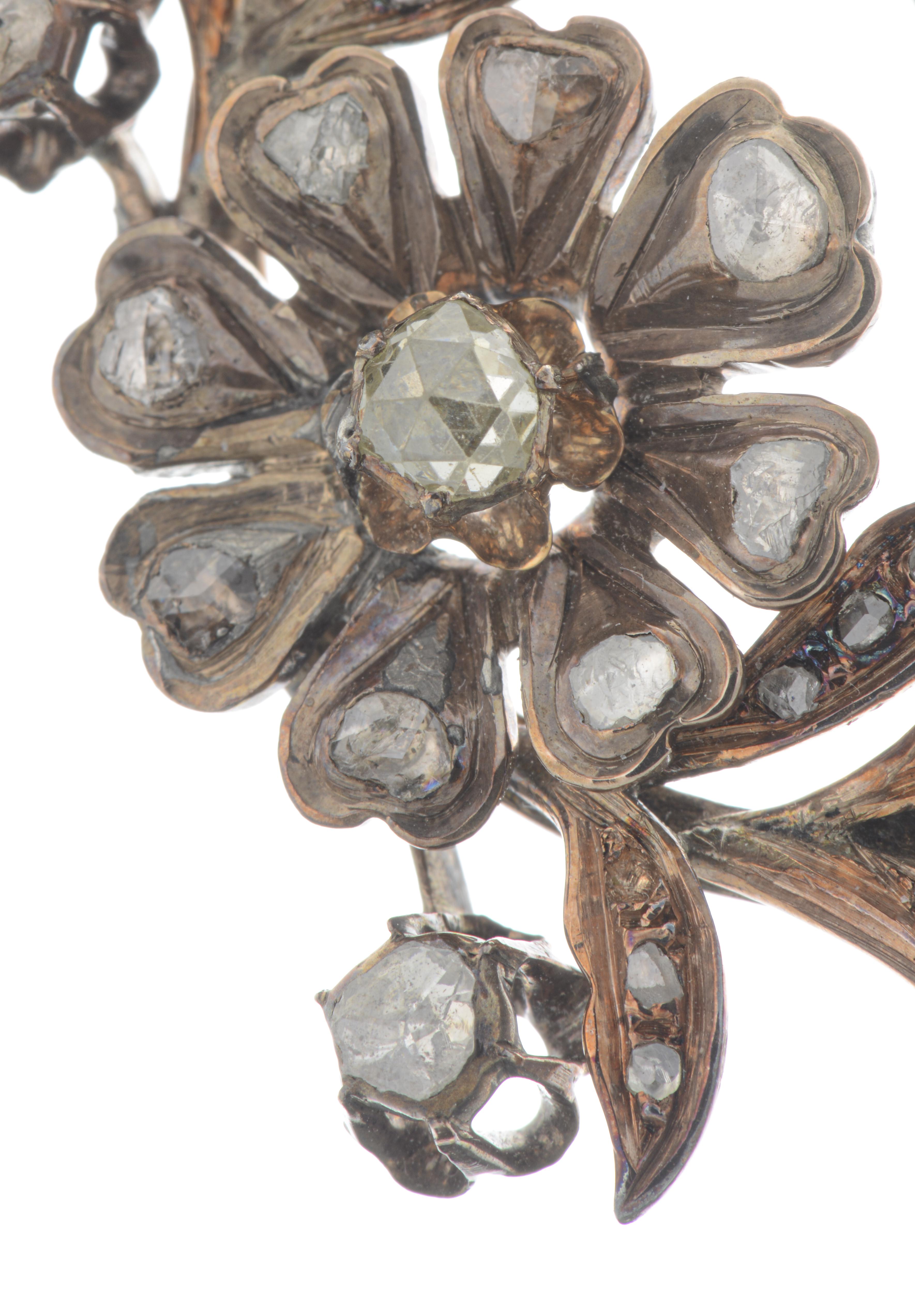Lot de deux broches en or, Fleur et Nœud en or à bas titre avec 5 diamants de taille ancienne et des tailles rose pour un total de 2 cts.