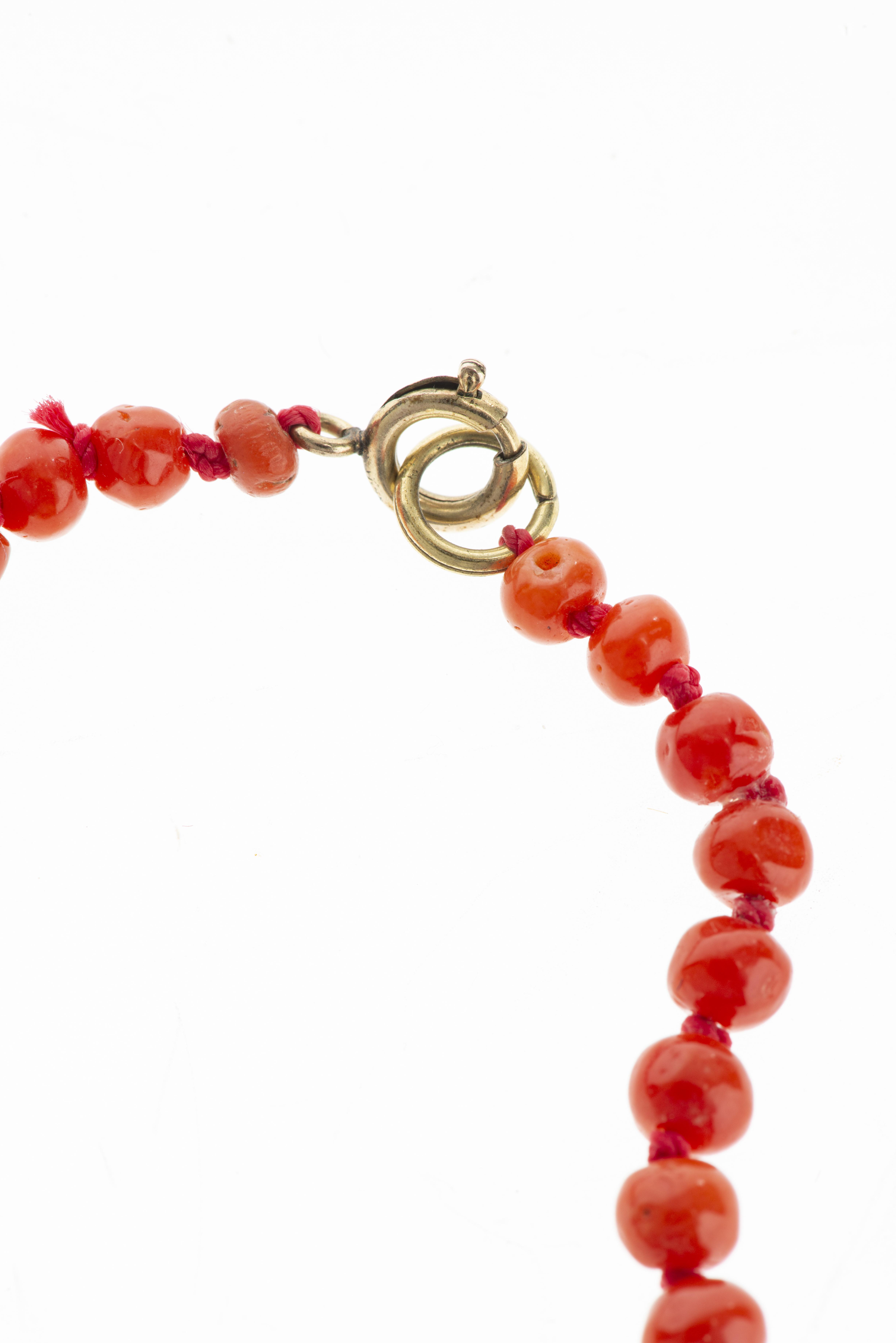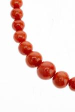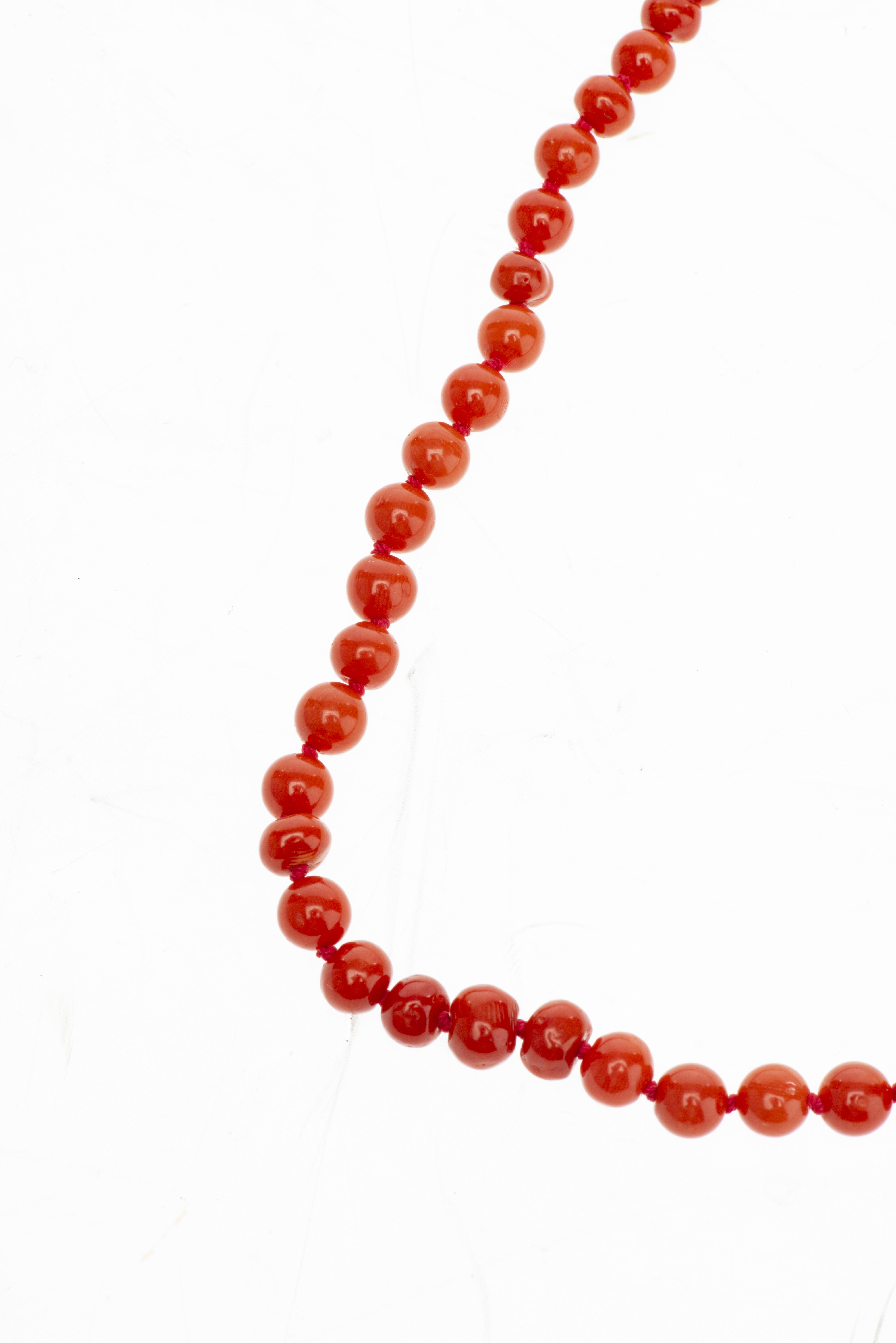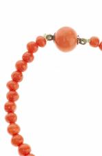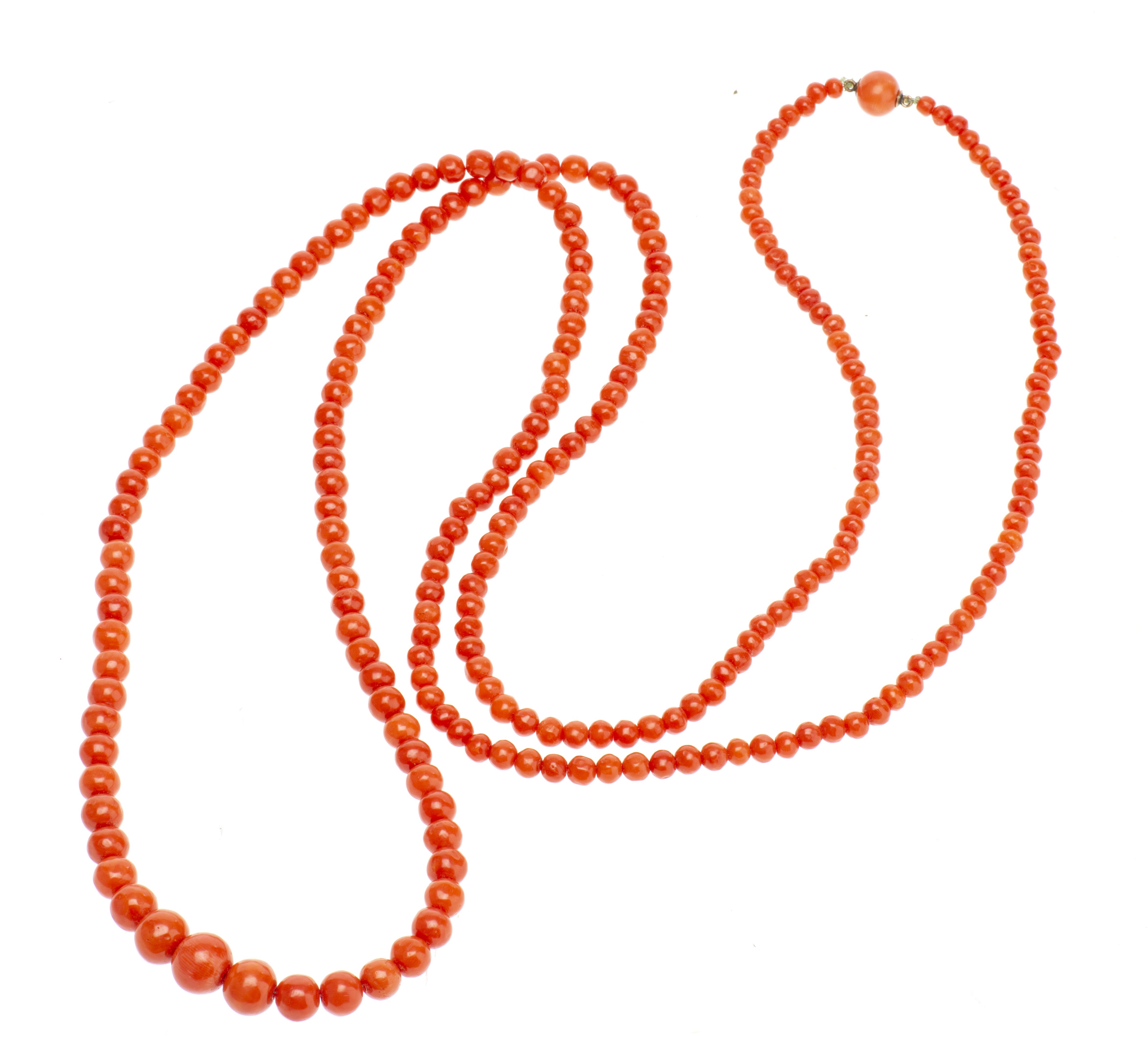 Lot de deux colliers en corail comprenant un sautoir en chute avec fermoir boule et un collier de corail en chute avec un fermoir.