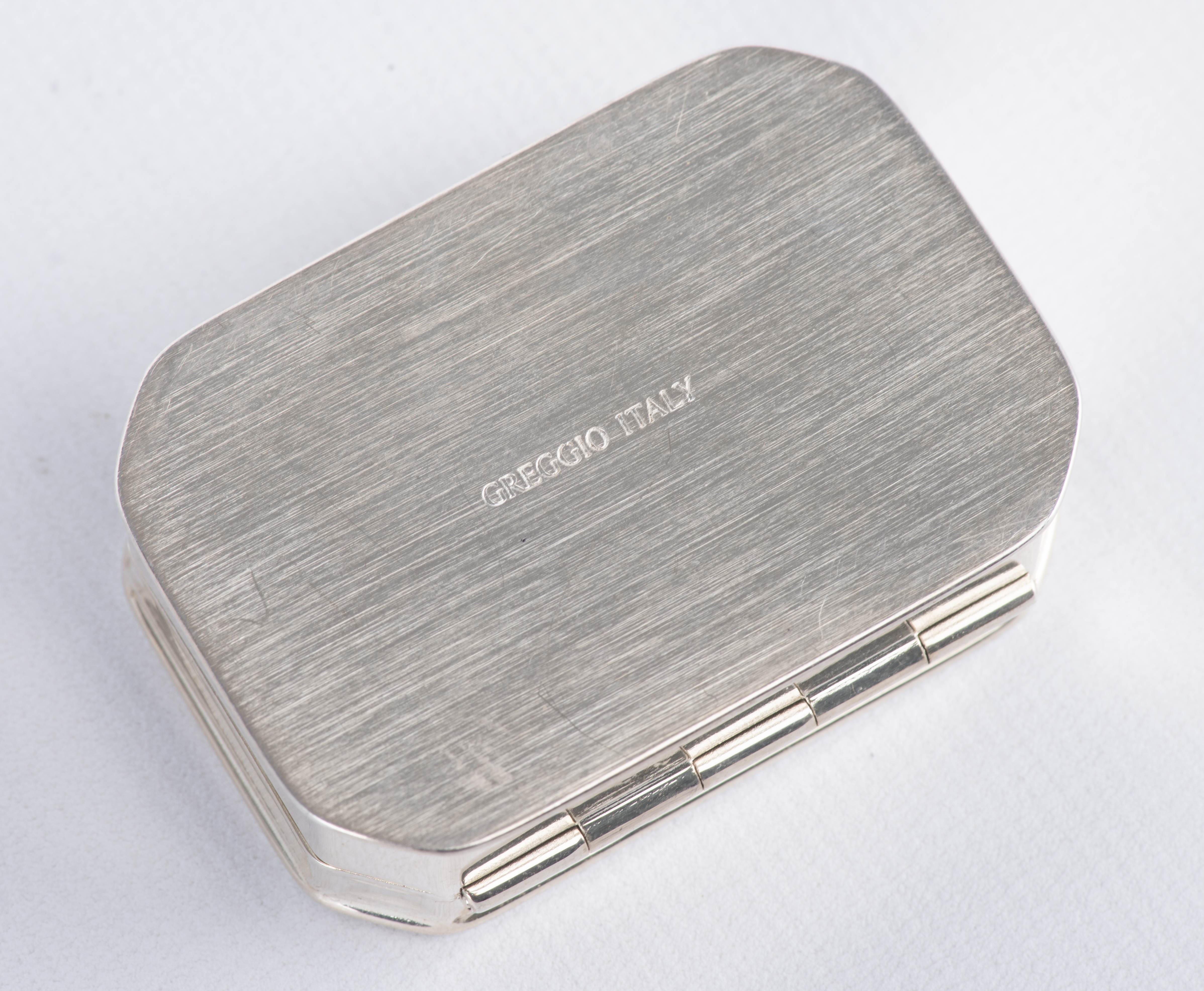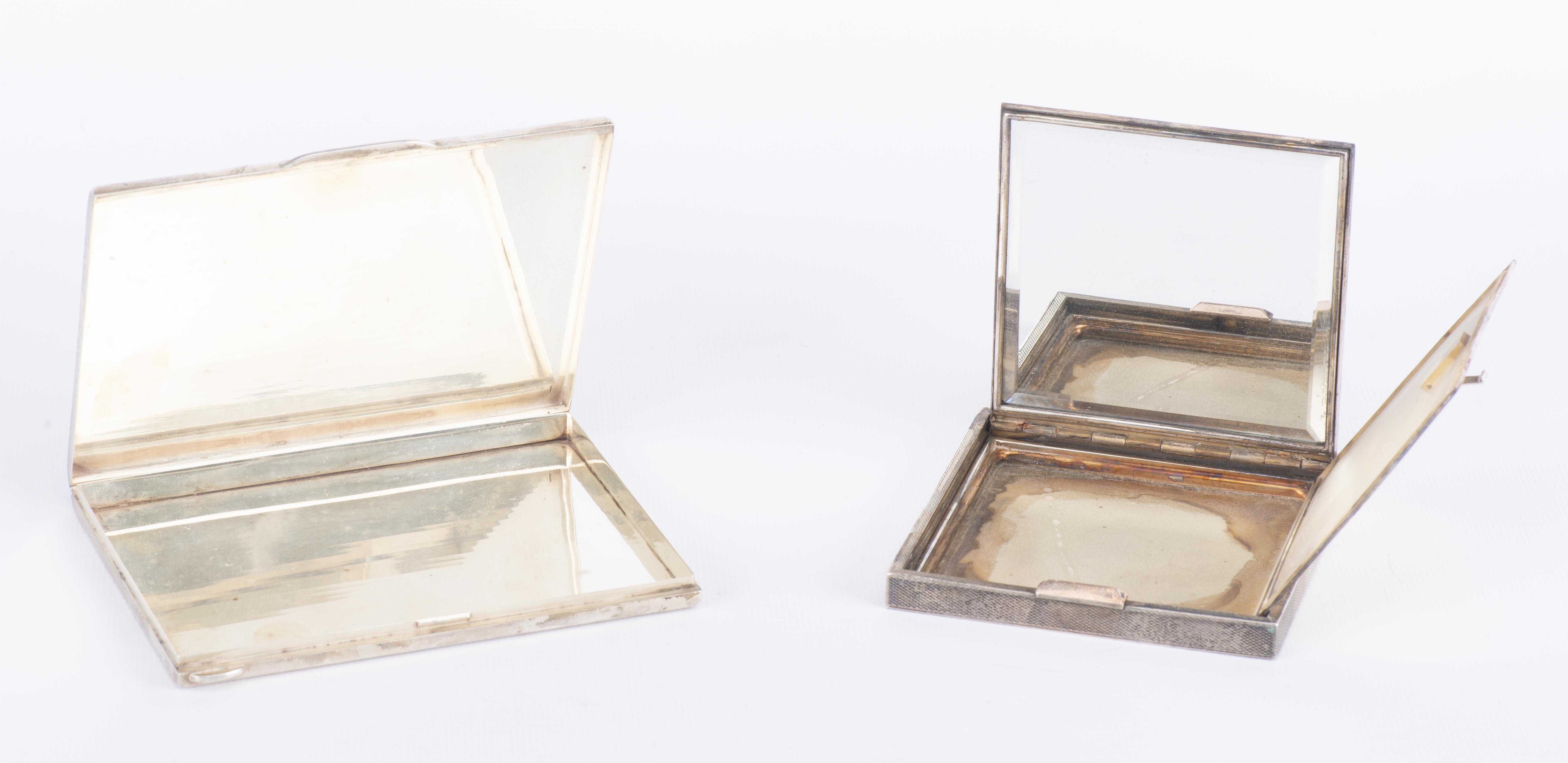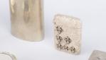 - poudrier carré en argent anglais 925 avec son étui en cuir, doté d'un miroir intérieur. H. 1x9x9 cm