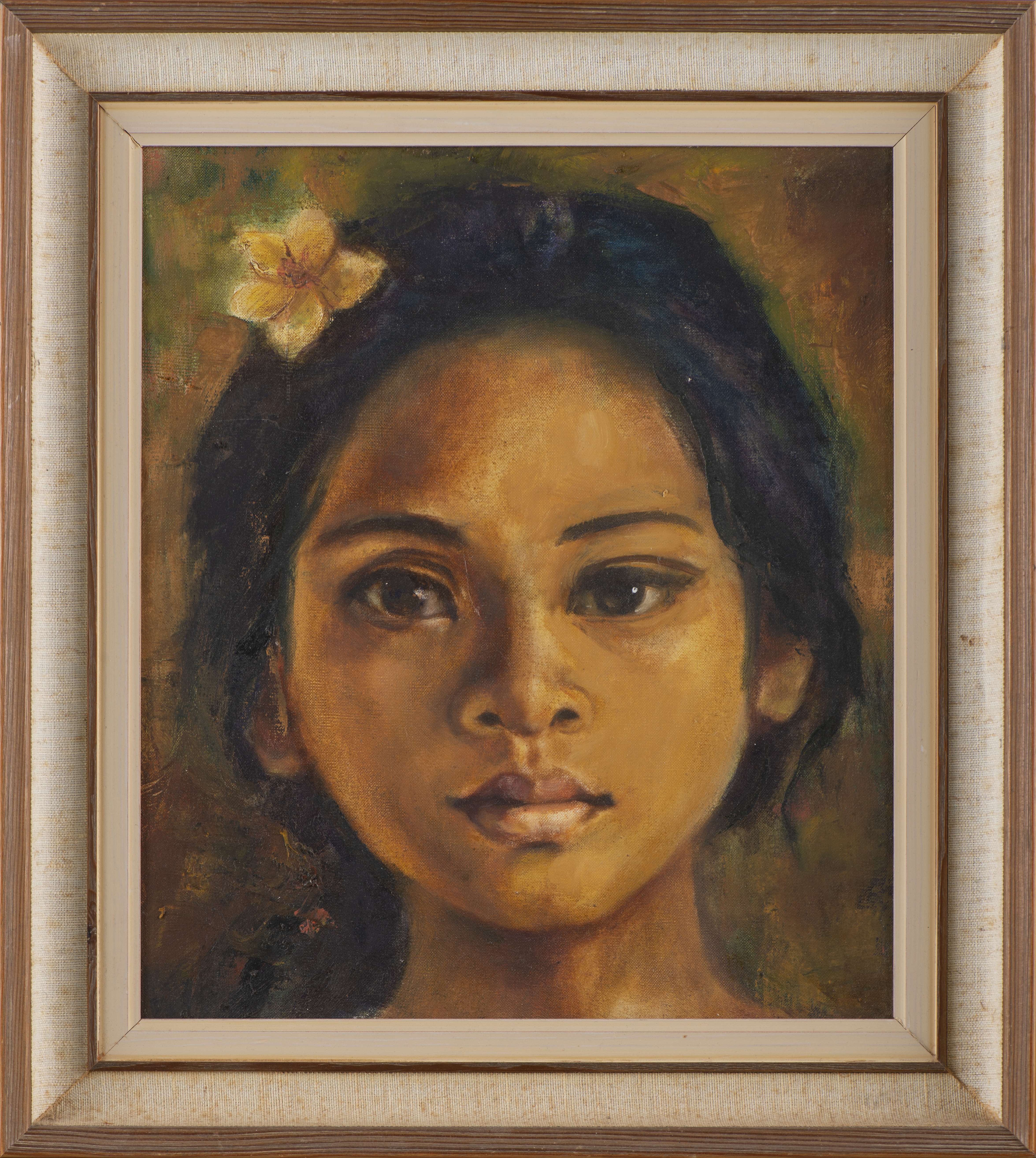 -"Jeune fille et sa fleur de frangipanier", huile sur panneau, non signé.