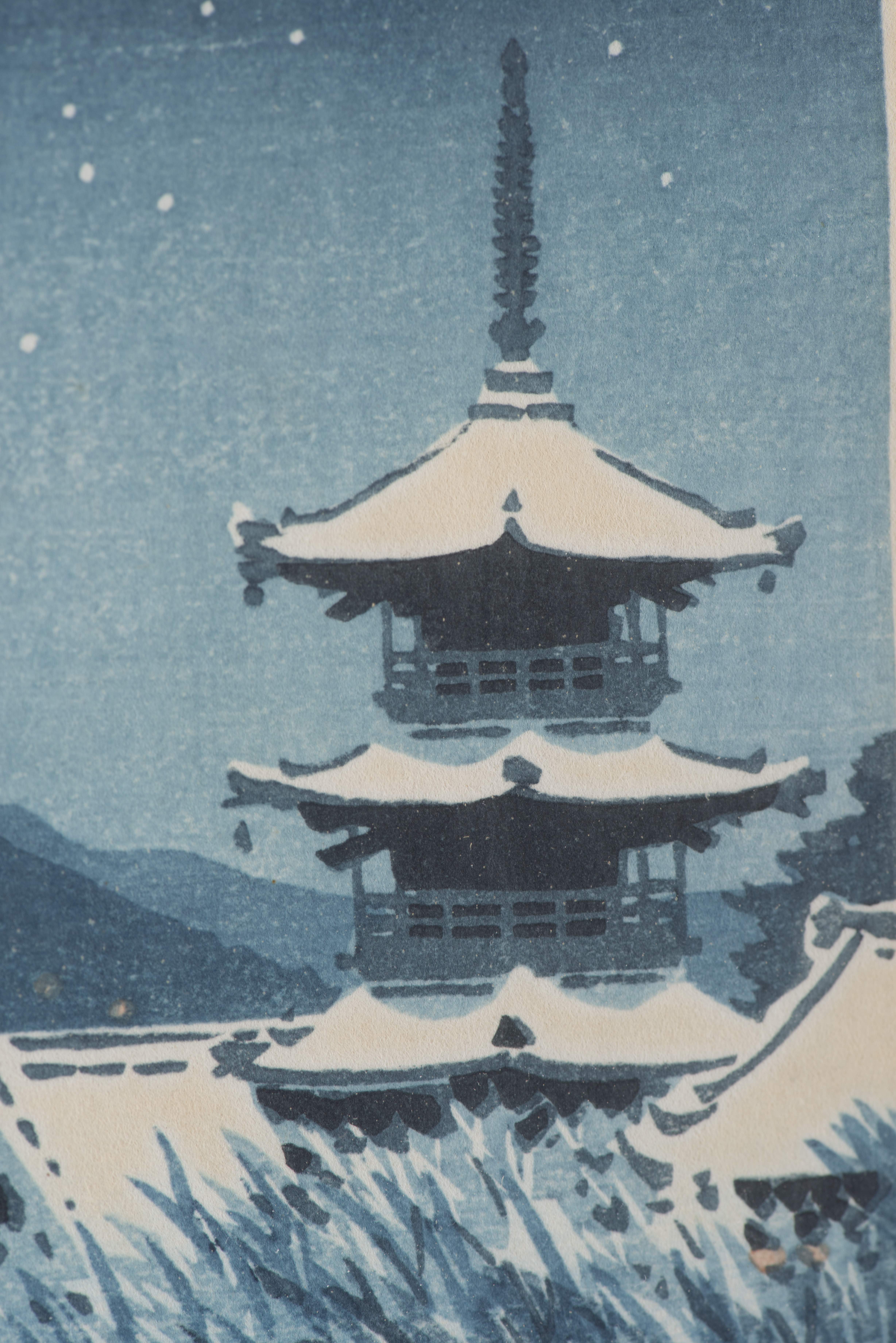 - Eisui "L'entrée du temple en hiver", format Oban avec cachet rond en bas à gauche et un cachet rouge en bas à droite sous la signature. 36x24 cm.