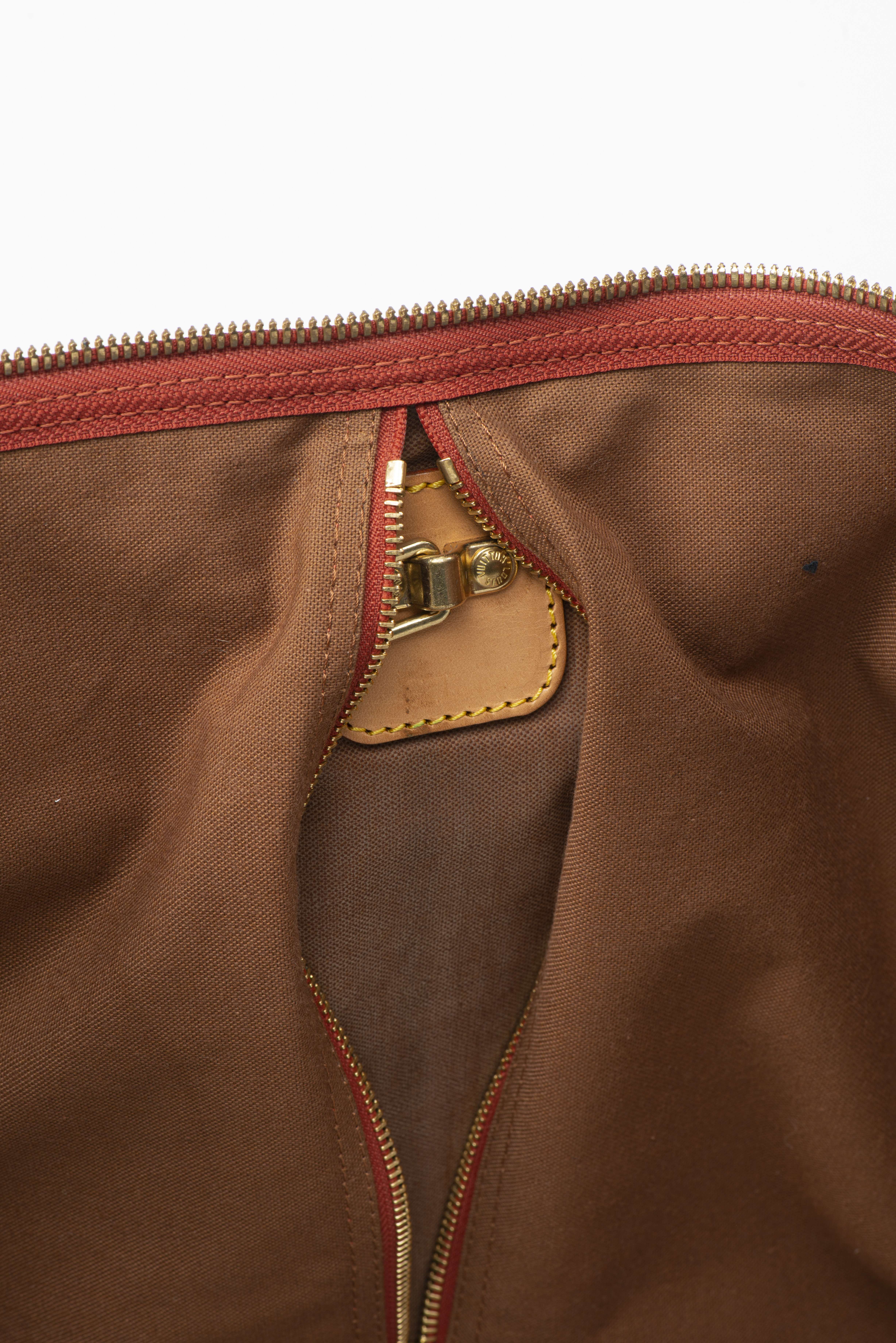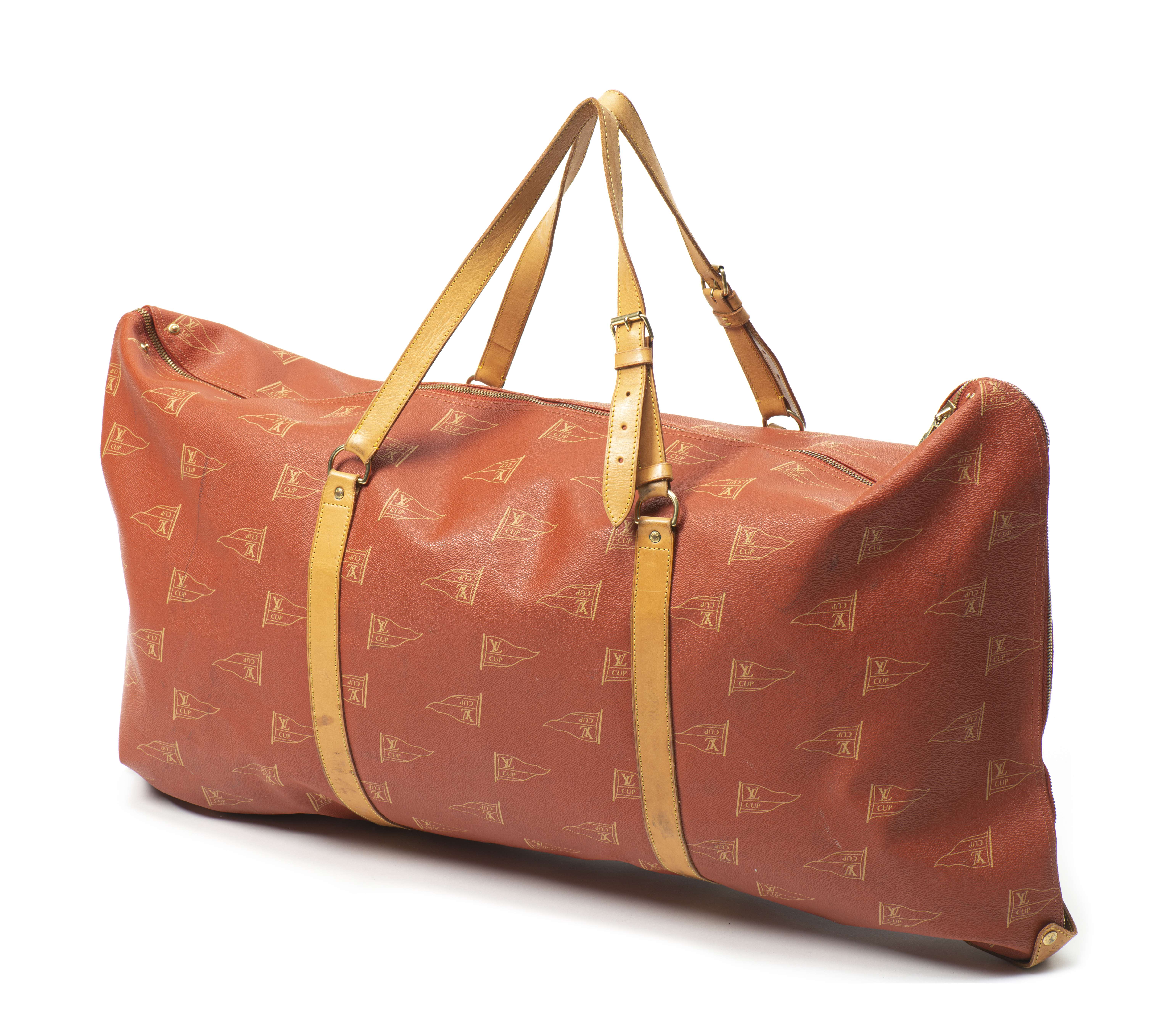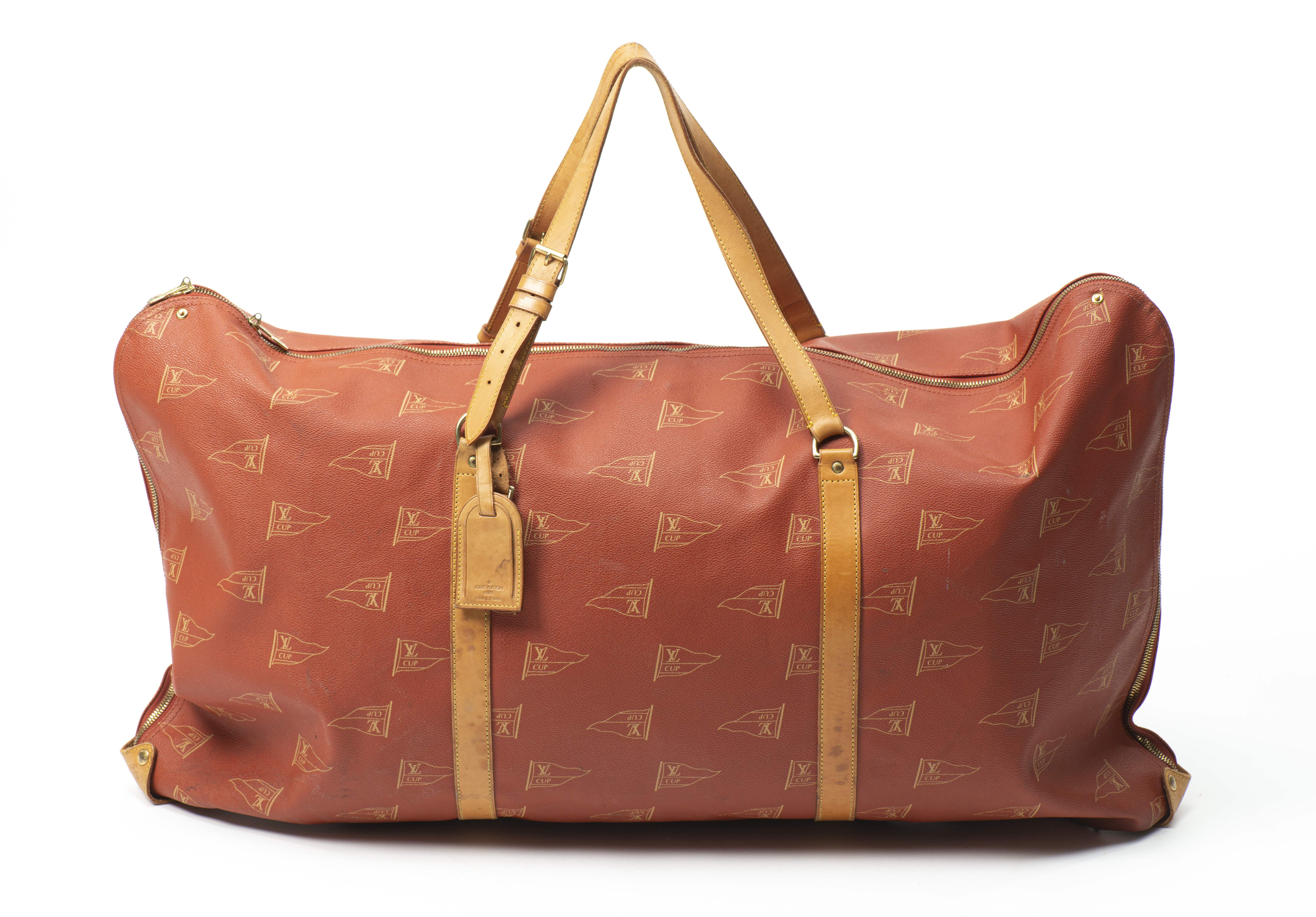 Louis Vuitton, for the America's Cup, 1995, édition limitée. Porte-habit en cuir naturel et toile enduite rouge argile imprimée à décor de fanions, garniture en laiton doré, fermeture à glissière, double anse enveloppante modulable.