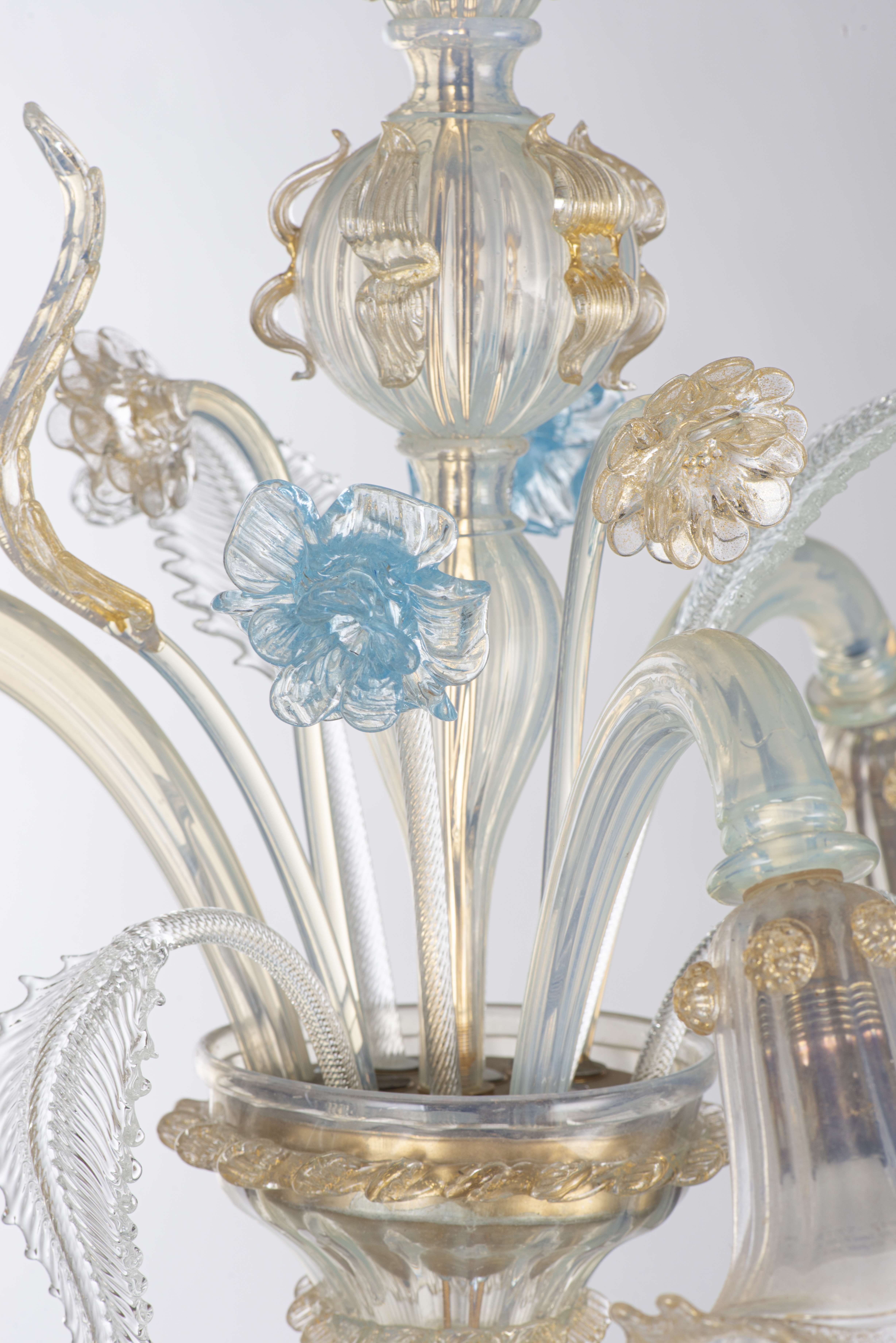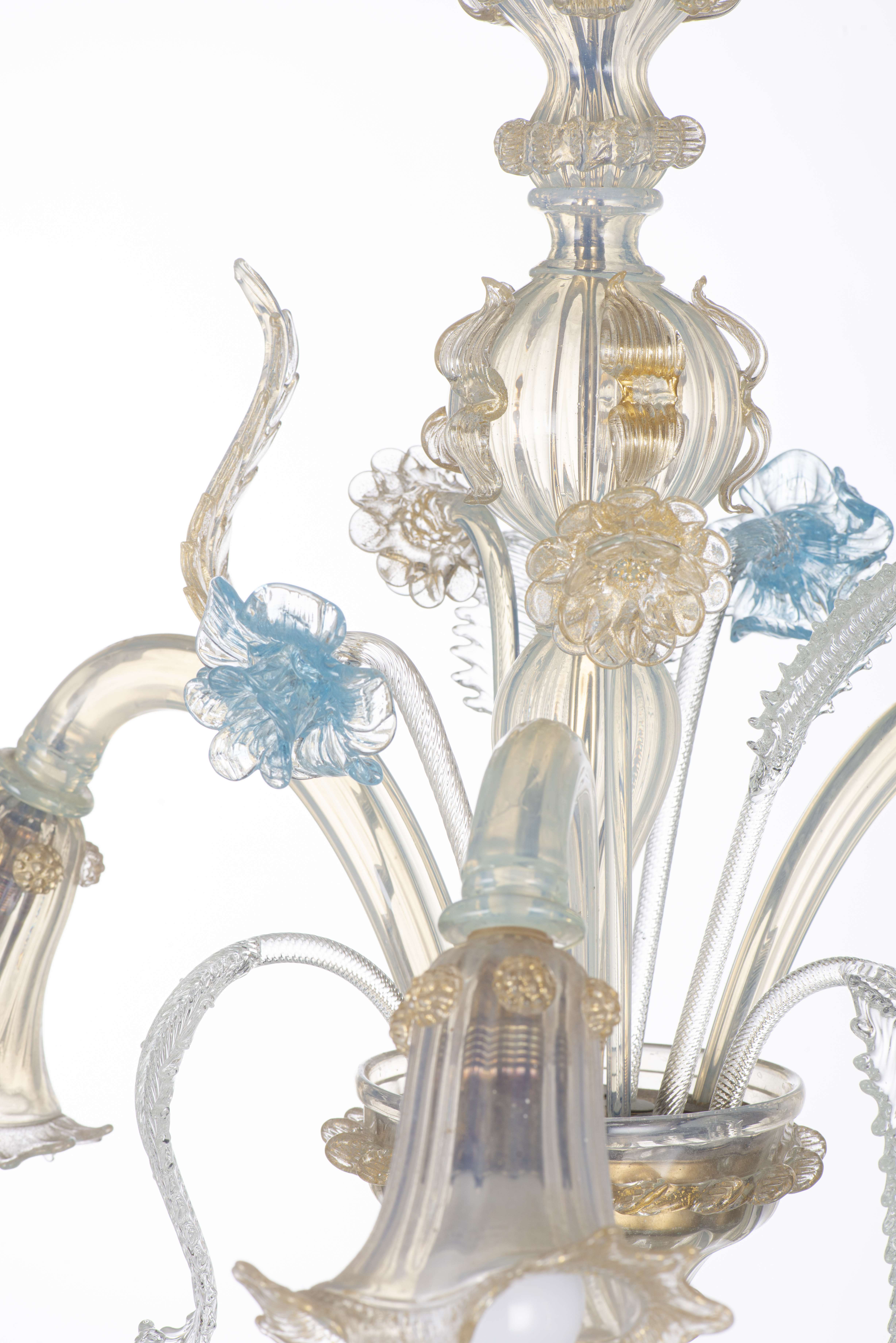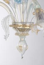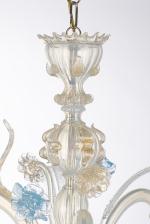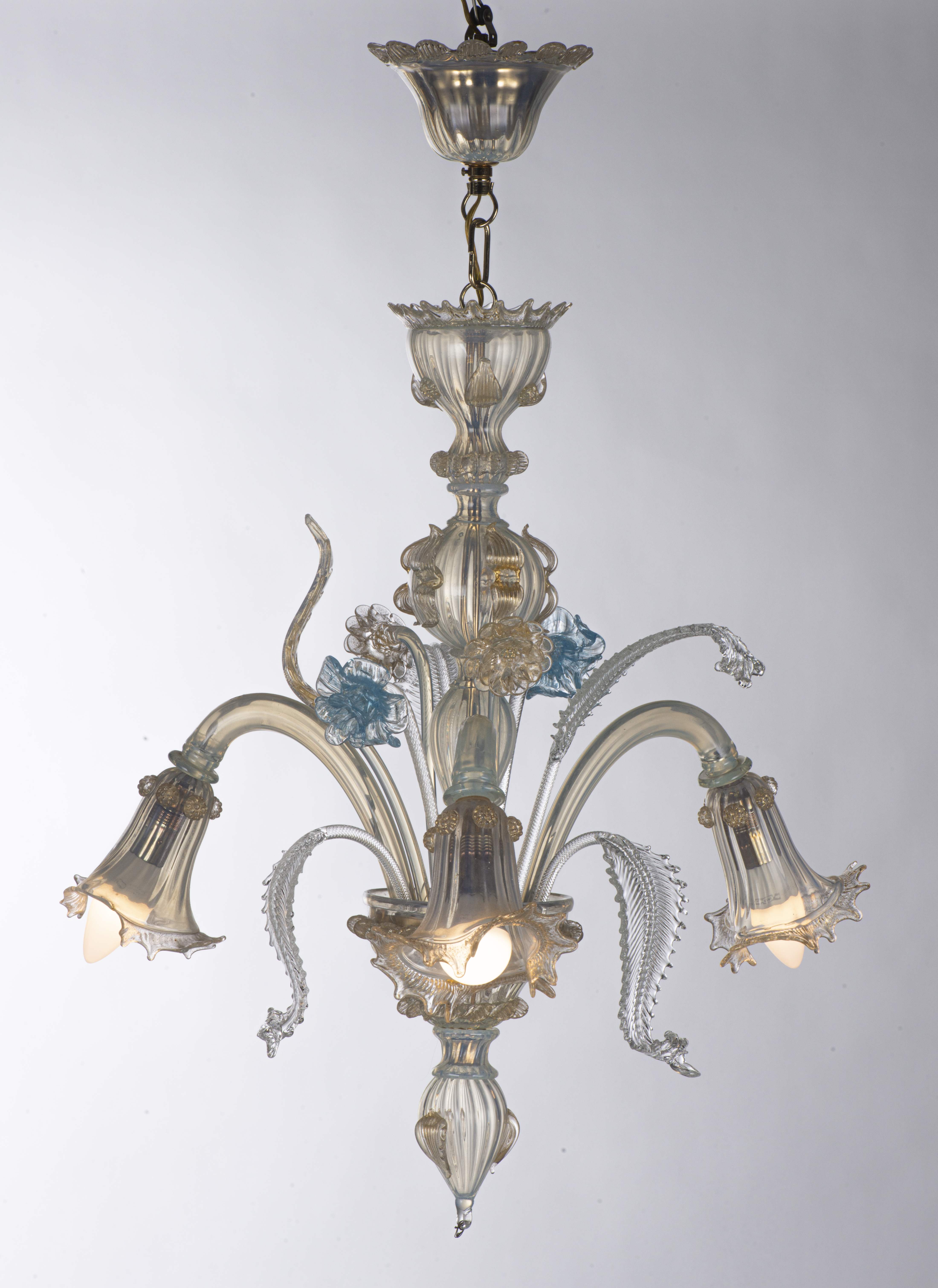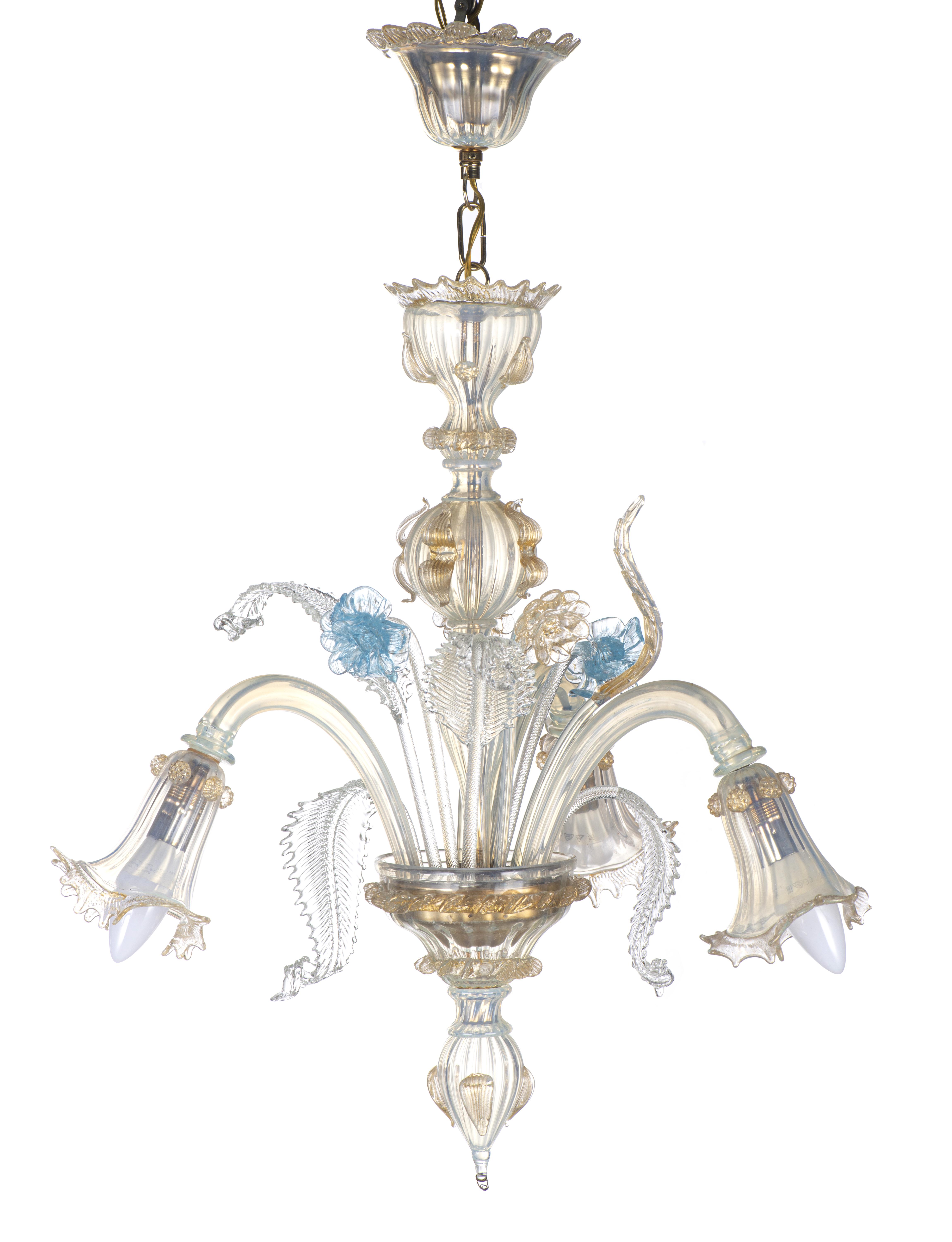 Lustre à trois feux en verre de Murano attribué à Barovier & Toso, à décor de fleurs et feuilles avec teintes de bleu et or.