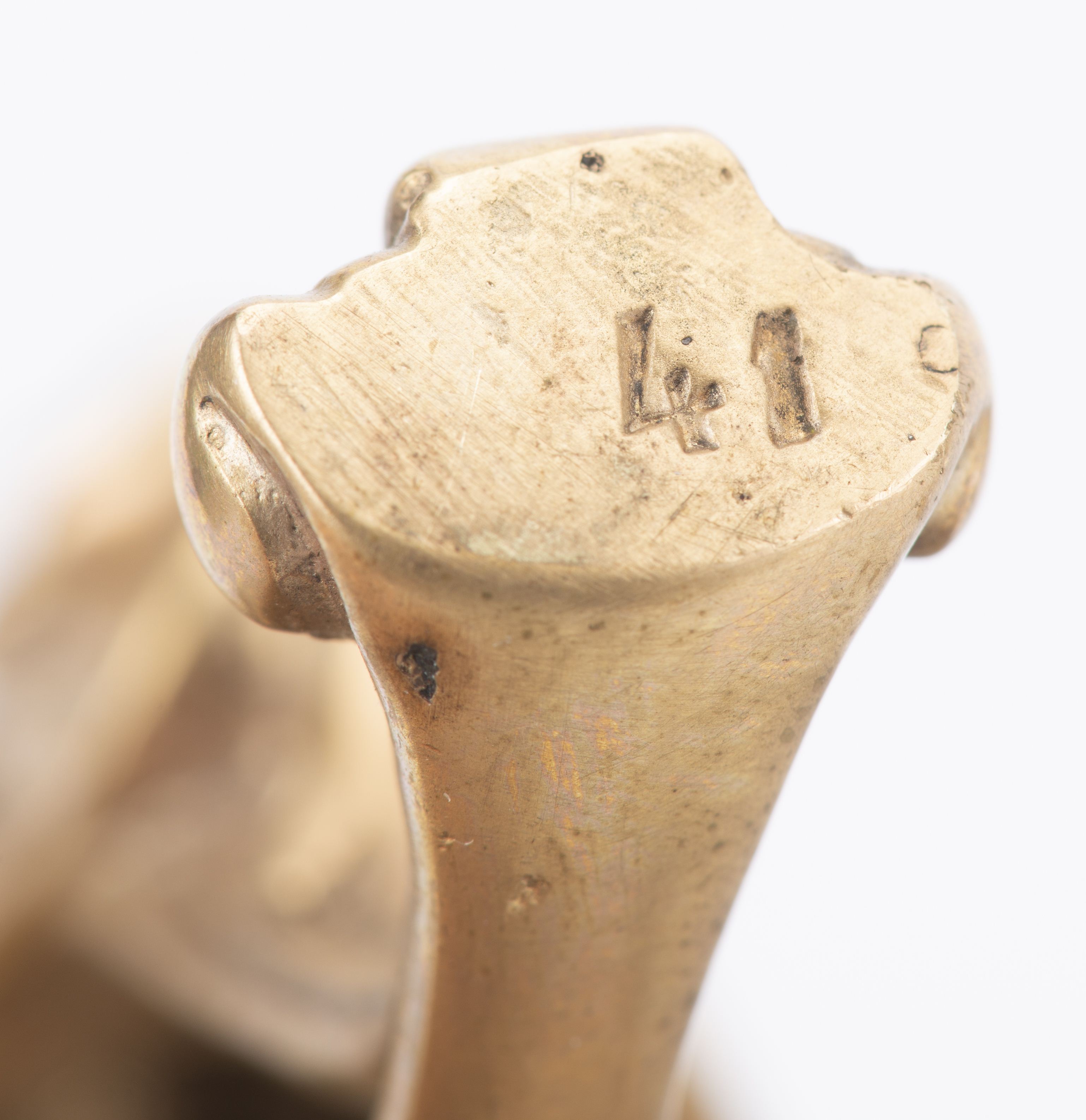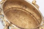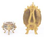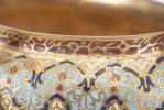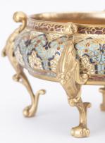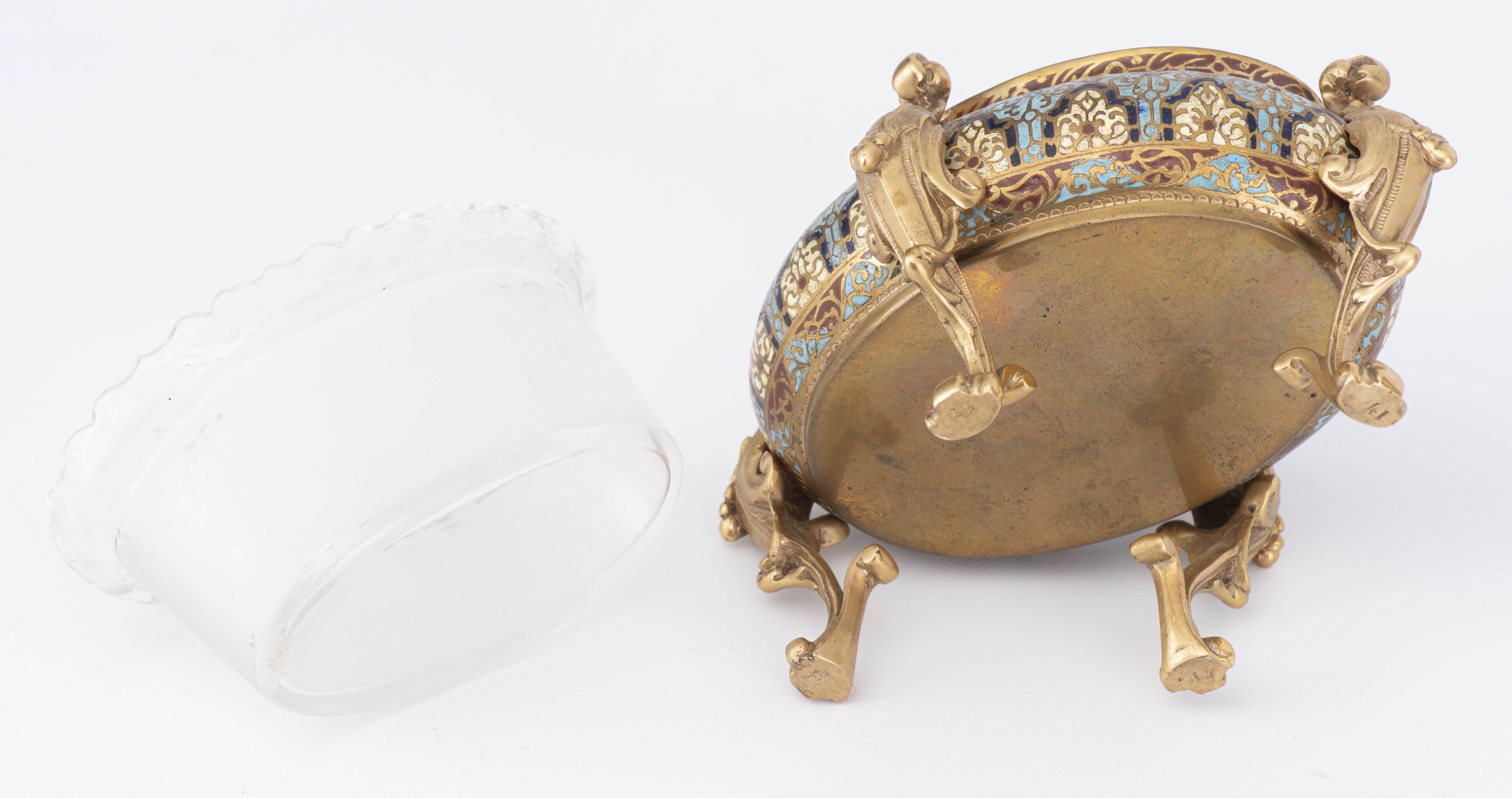 On y joint une grande salière ovale sur pied en bronze doré à décor d'émaux cloisonnés, intérieur en verre partiellement mati, ns.