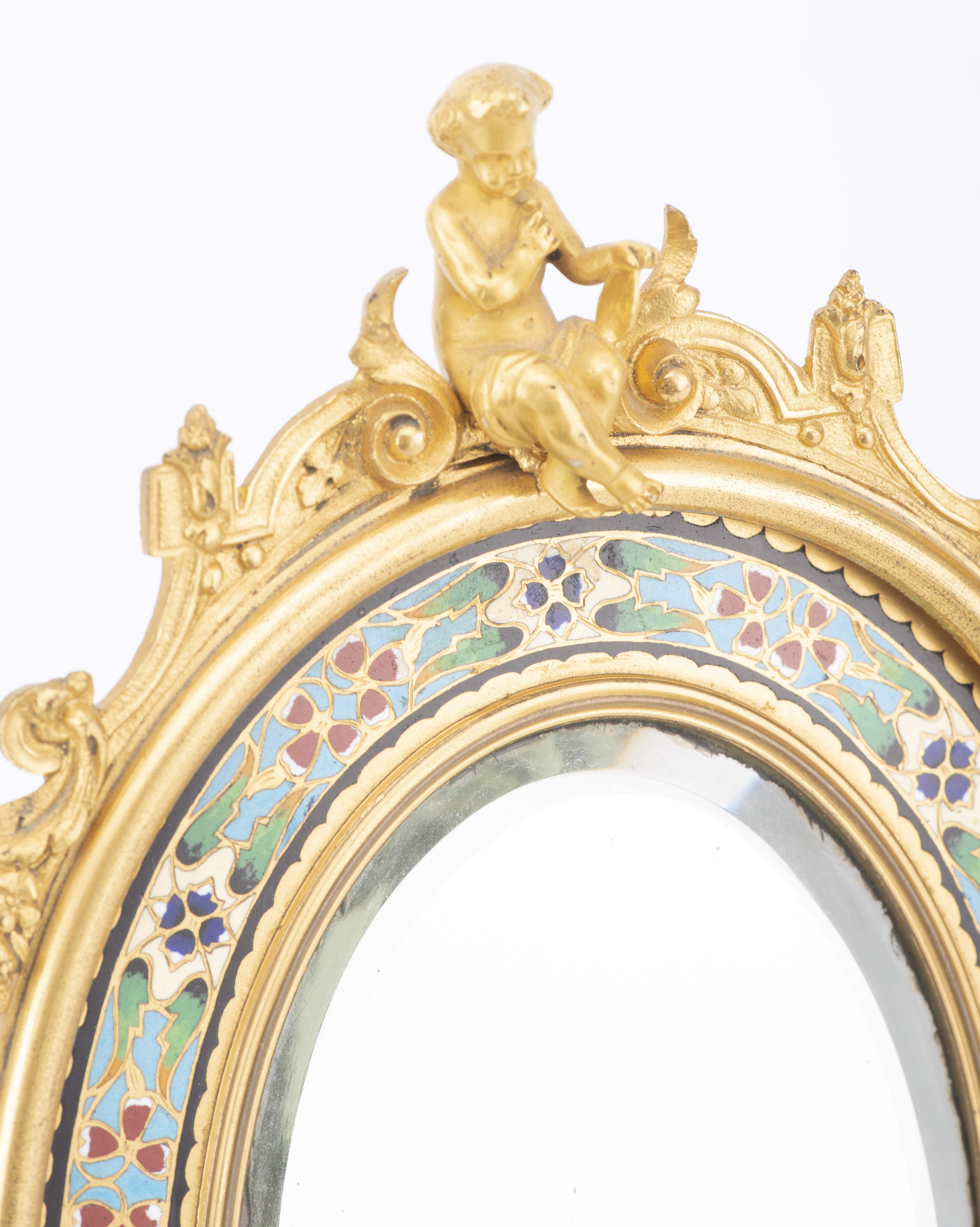 Maison Alphonse Giroux, miroir de toilette ovale en bronze doré à décor d'émaux cloisonnés dans son entourage ornemental surmonté d'un petit chérubin, signé "Mon. Alph Giroux Paris".