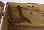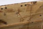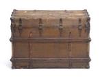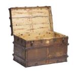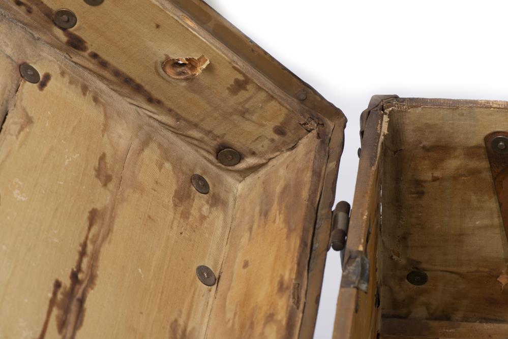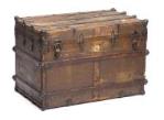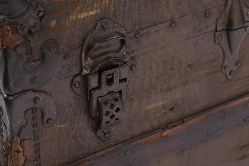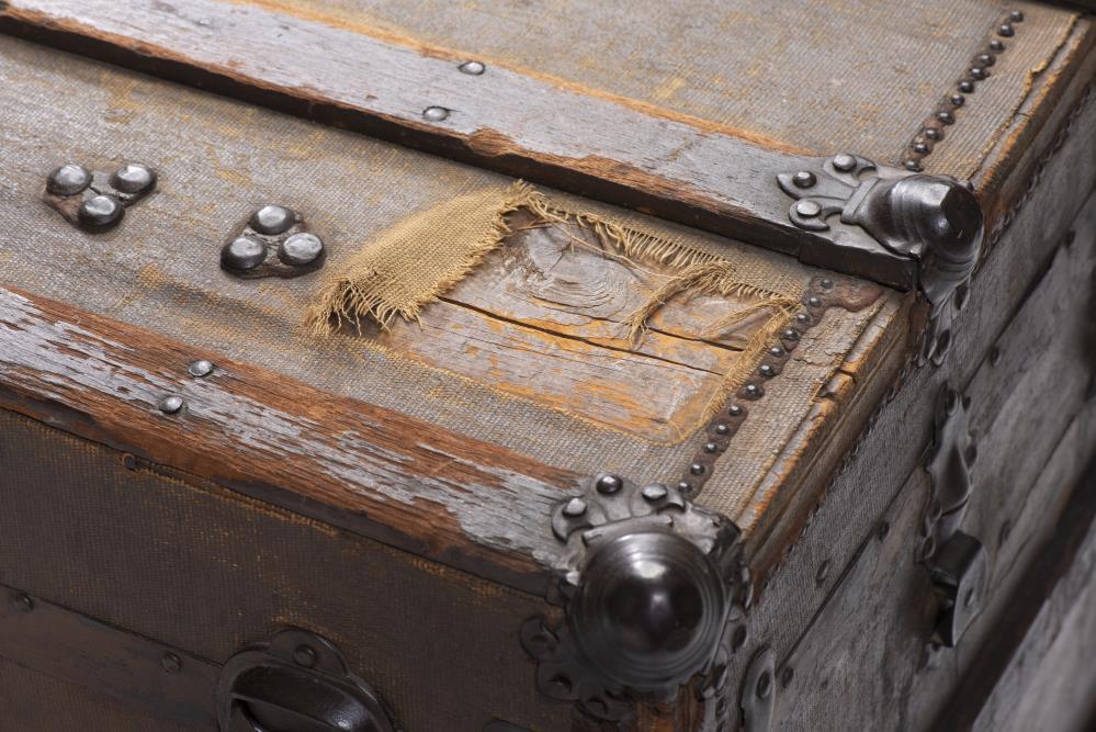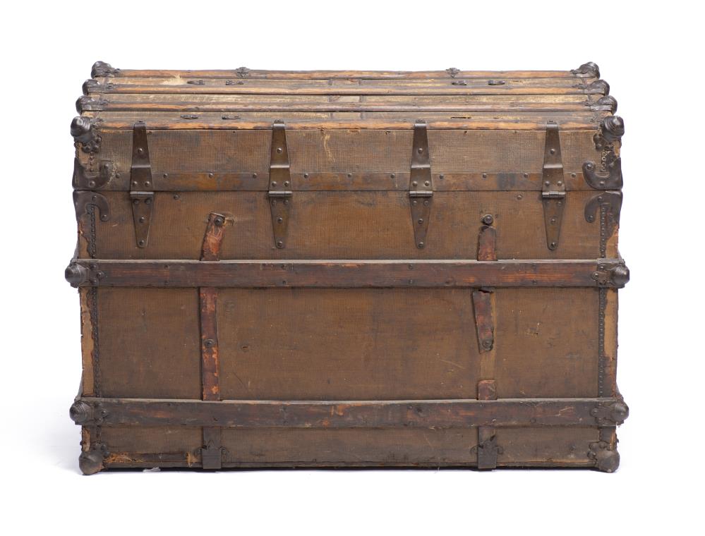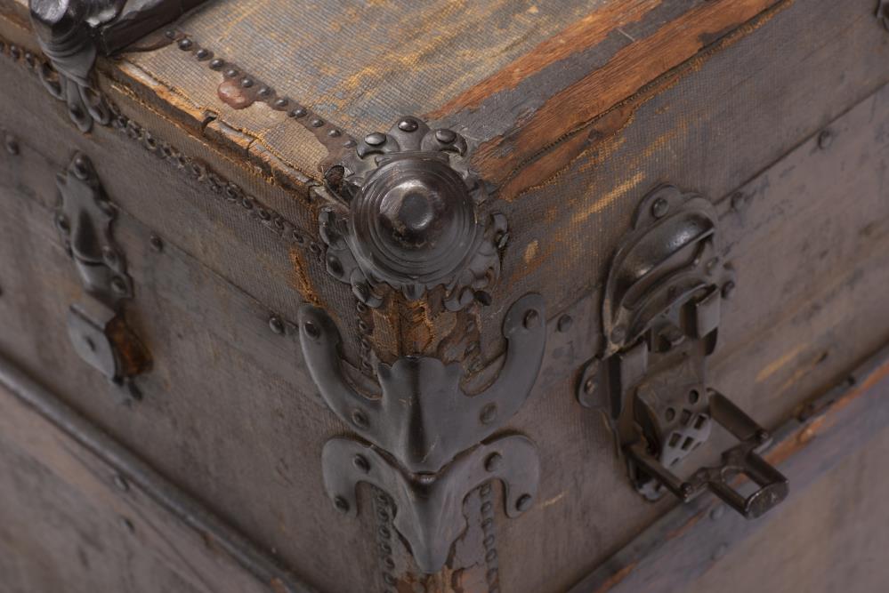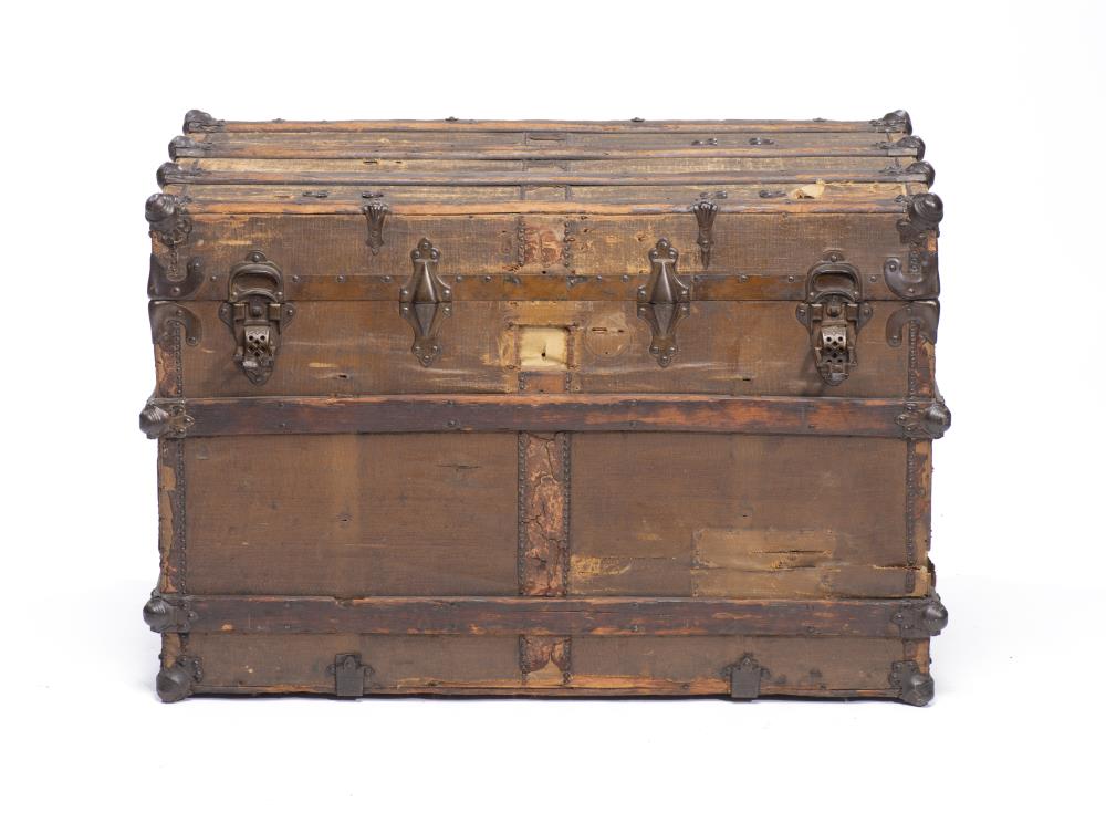 Malle ancienne en bois recouverte de toile cirée et cuir