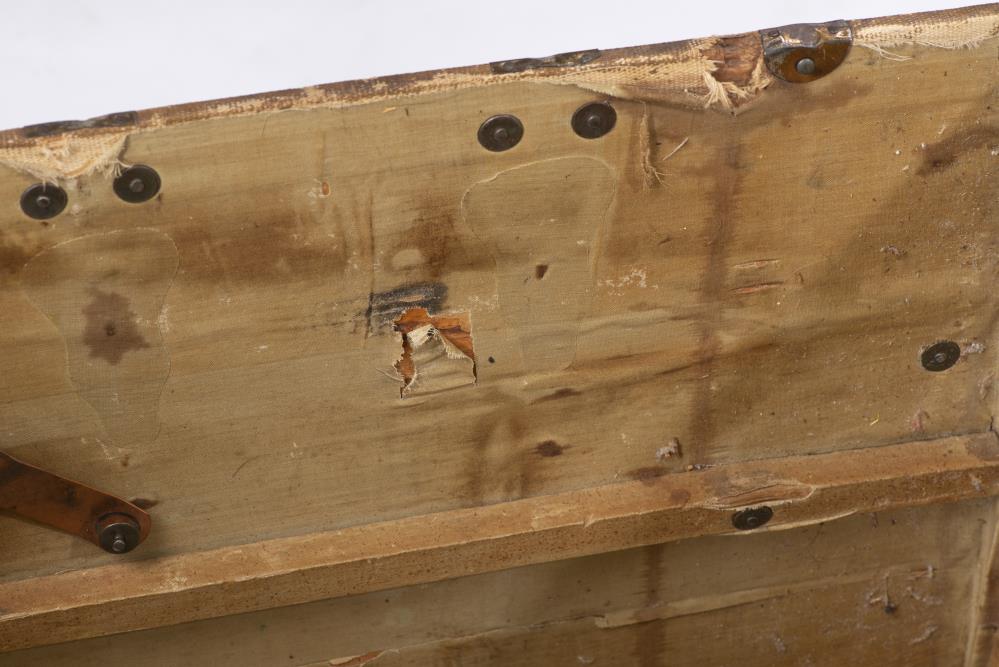 Malle ancienne en bois recouverte de toile cirée et cuir.