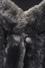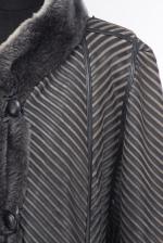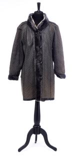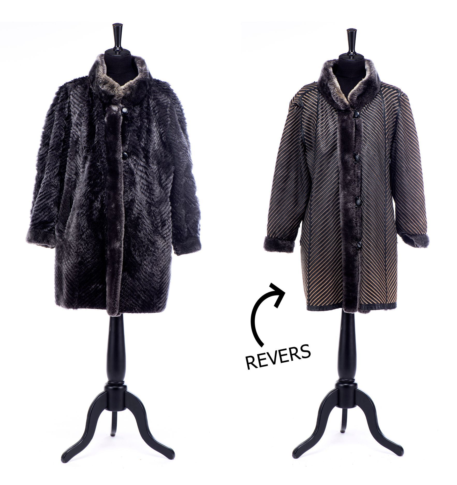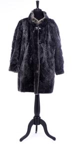 Manteau mi-long synthétique bleu-gris réversible, 4 boutons de fermeture.
