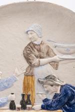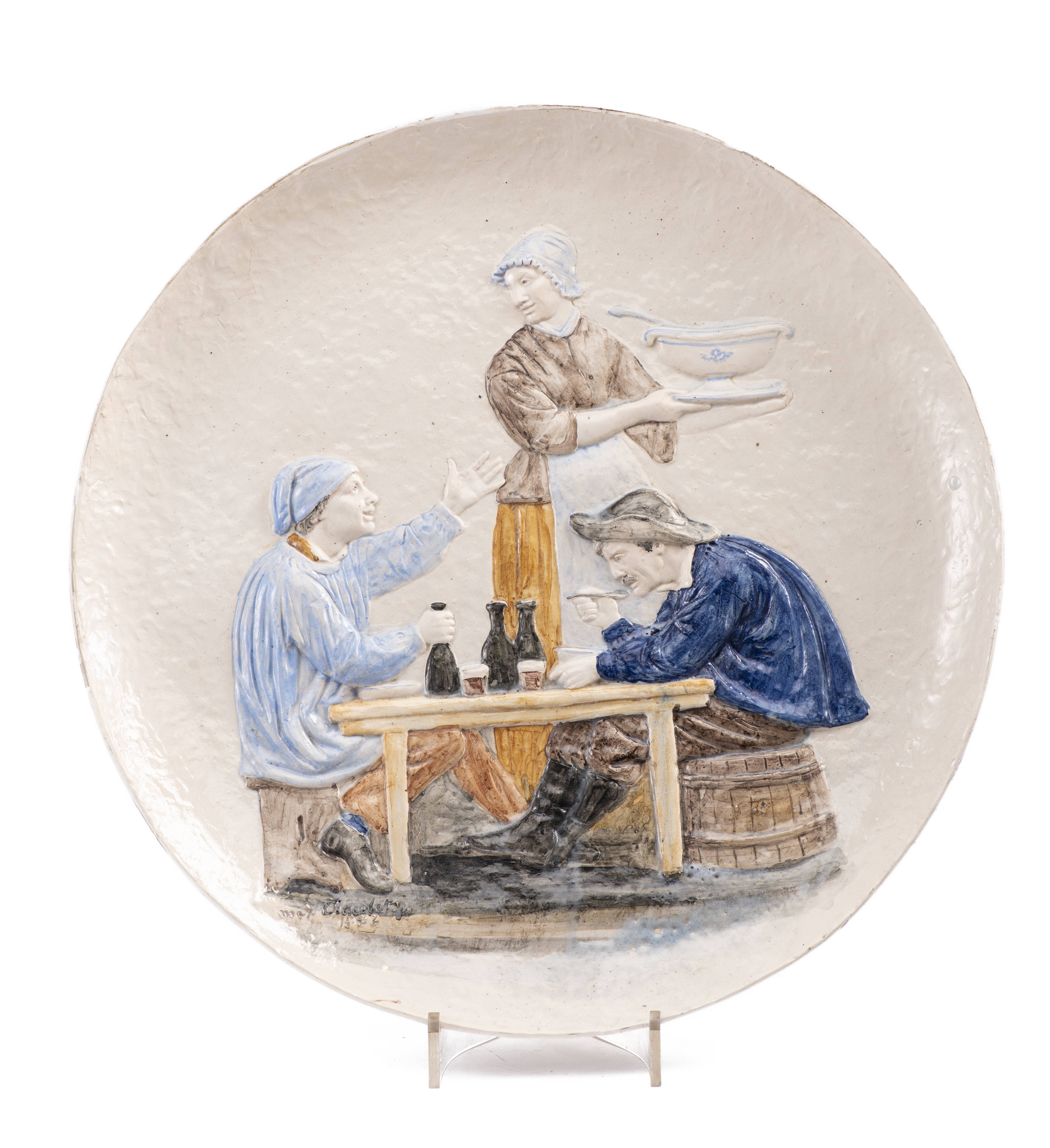 Max CLAUDET(1840-1893), "Paysans jurassiens". Plat en céramique émaillée sbg et daté 1882.