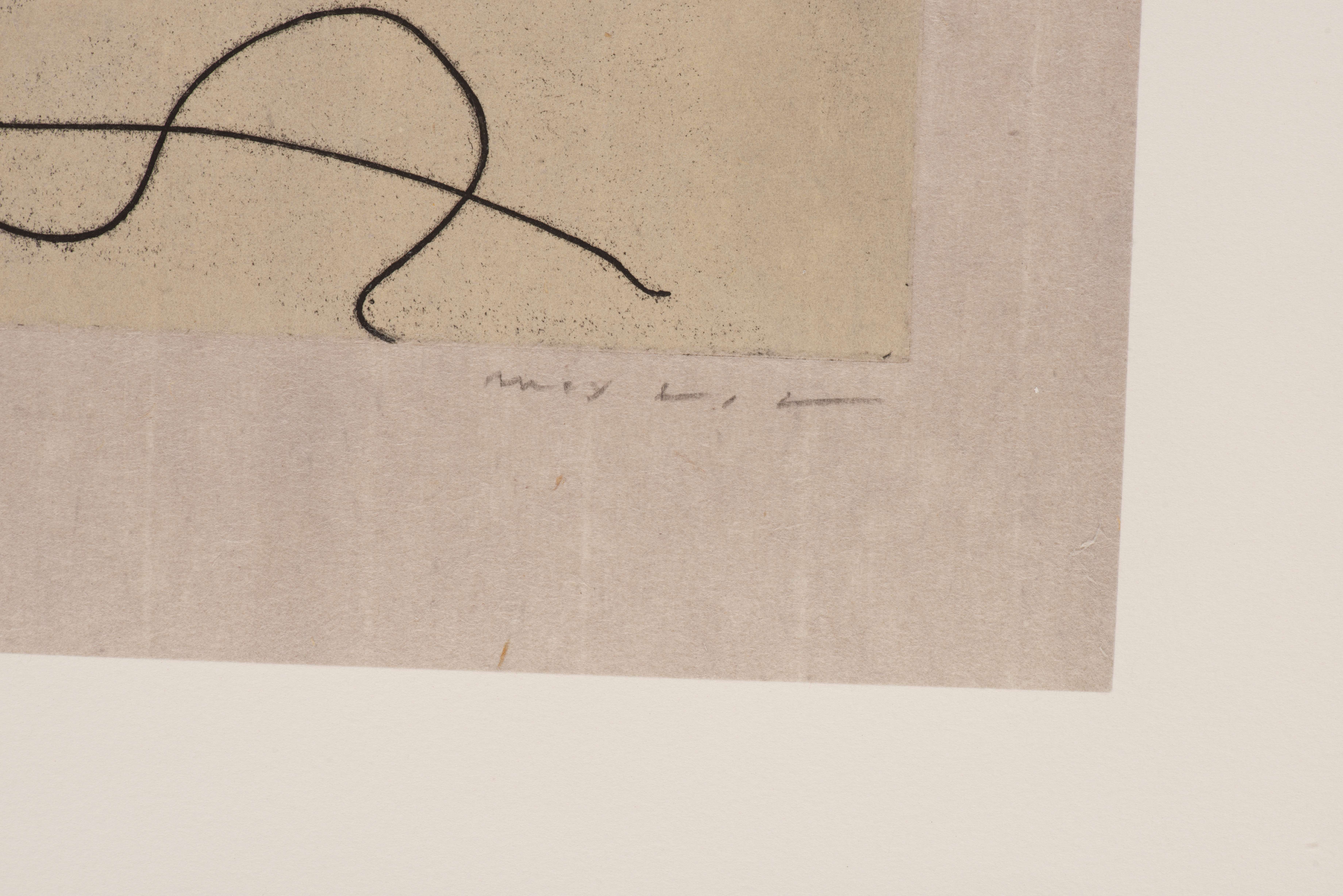 Max ERNST (1891-1976) "Ohne Titel" 1972, cat. num 224 de la série des "Oiseaux en péril" Eau-forte et aquatinte en noir et jaune brun sur papier Japon collé sur Vélin d'Arches gris num 66/100 et signé au crayon en bas à droite. Toutes marges. Georges Visat, Paris, éditeur et imprimeur