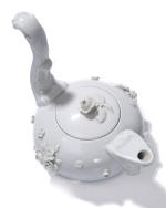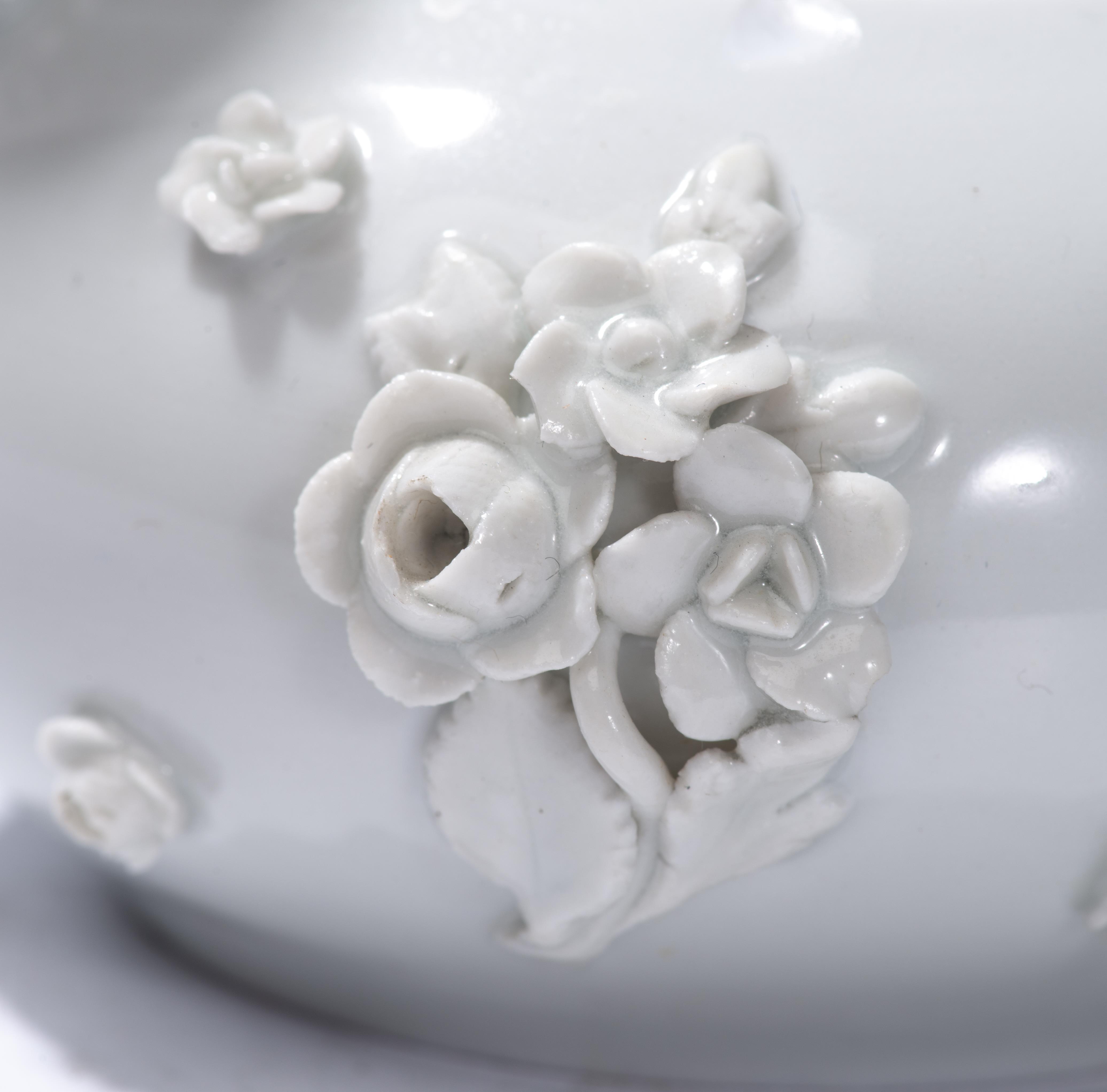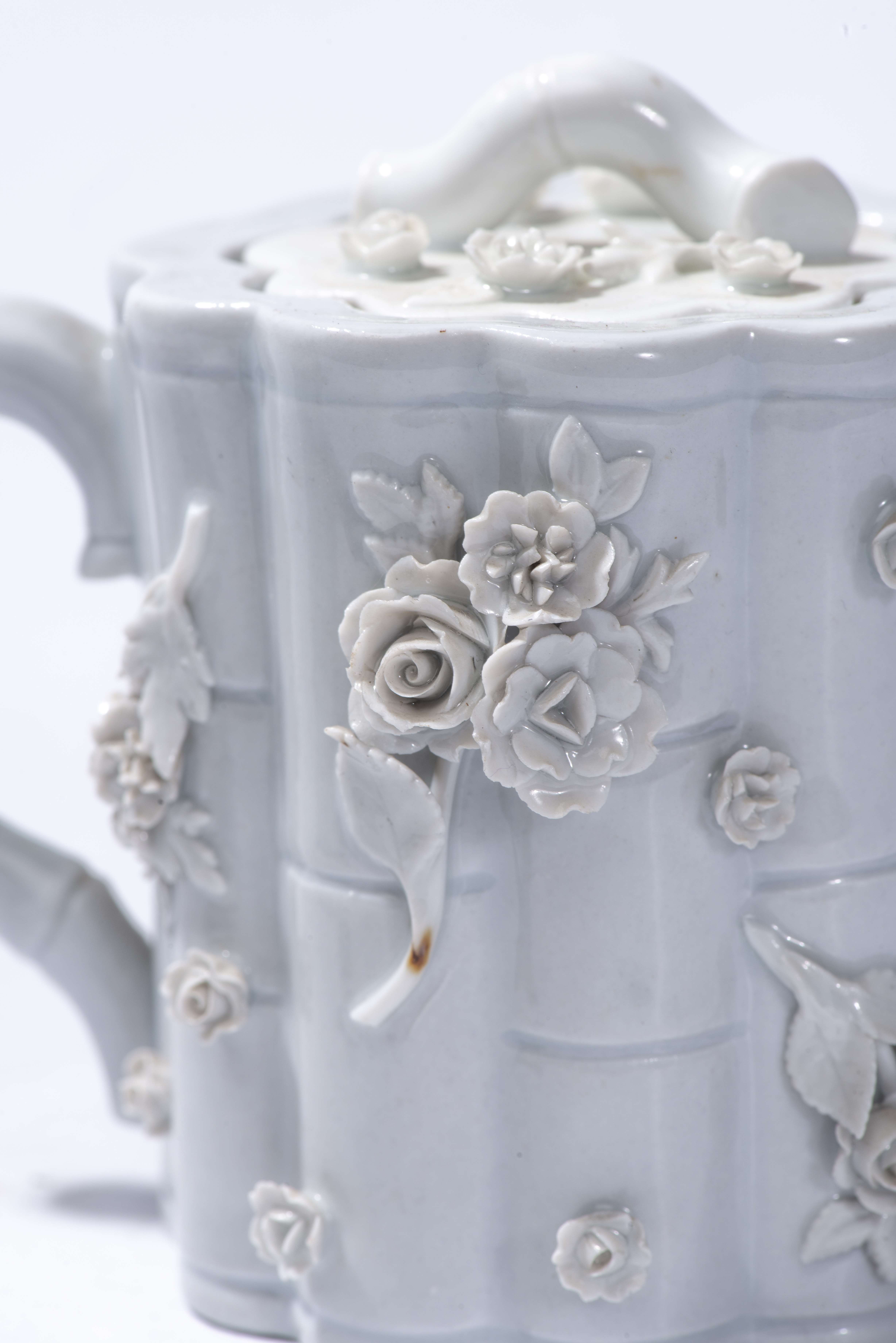 Meissen, deux théières imitant les blancs de Chine à décor en appliqué de roses et de branches de bambou.