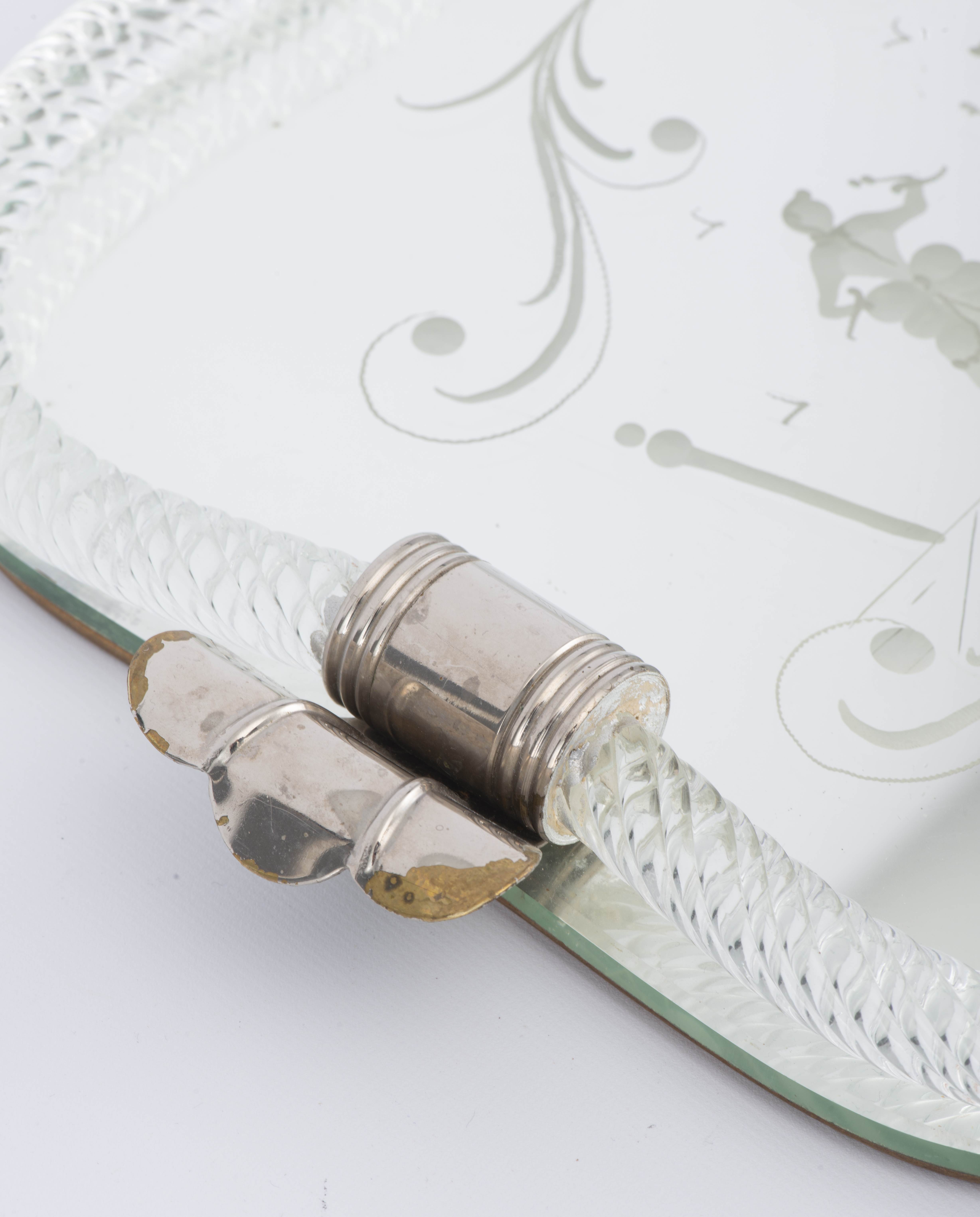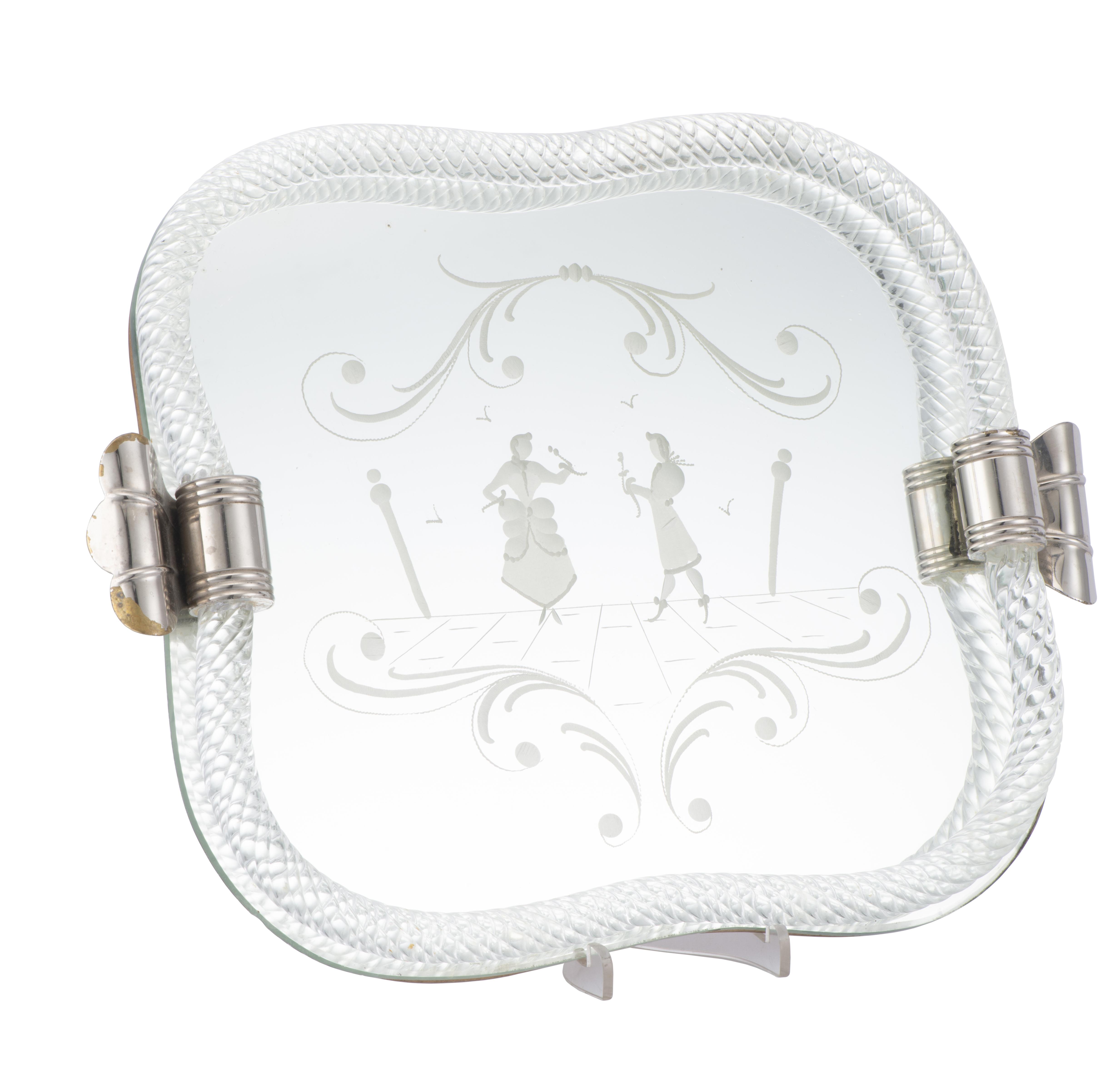 Milieu de table en verre de Venise à anses en métal argenté et bordure de verre vers 1950.