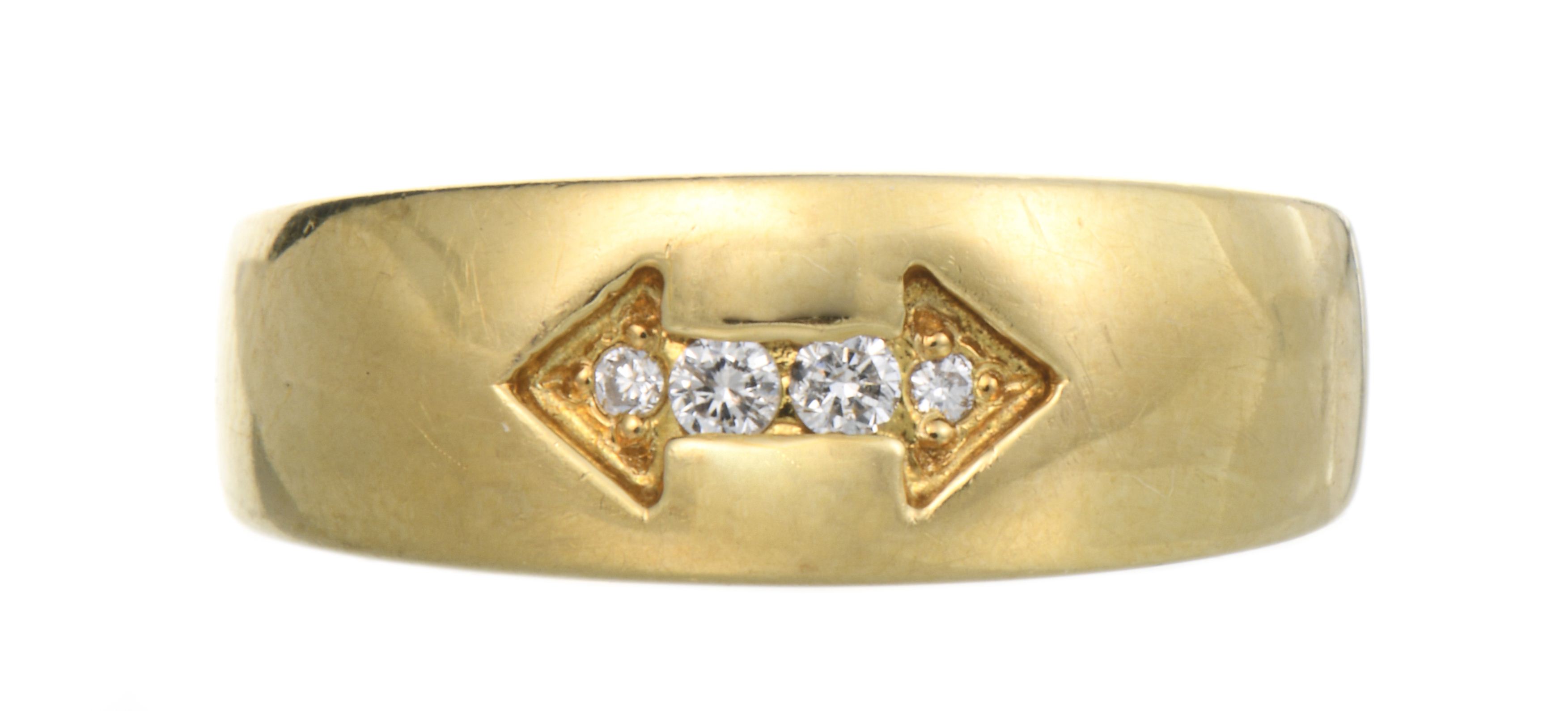 Mini-bague en or jaune .750 avec quatre diamants sertis à griffe pour un total de 0.04 ct en forme de double flèche.