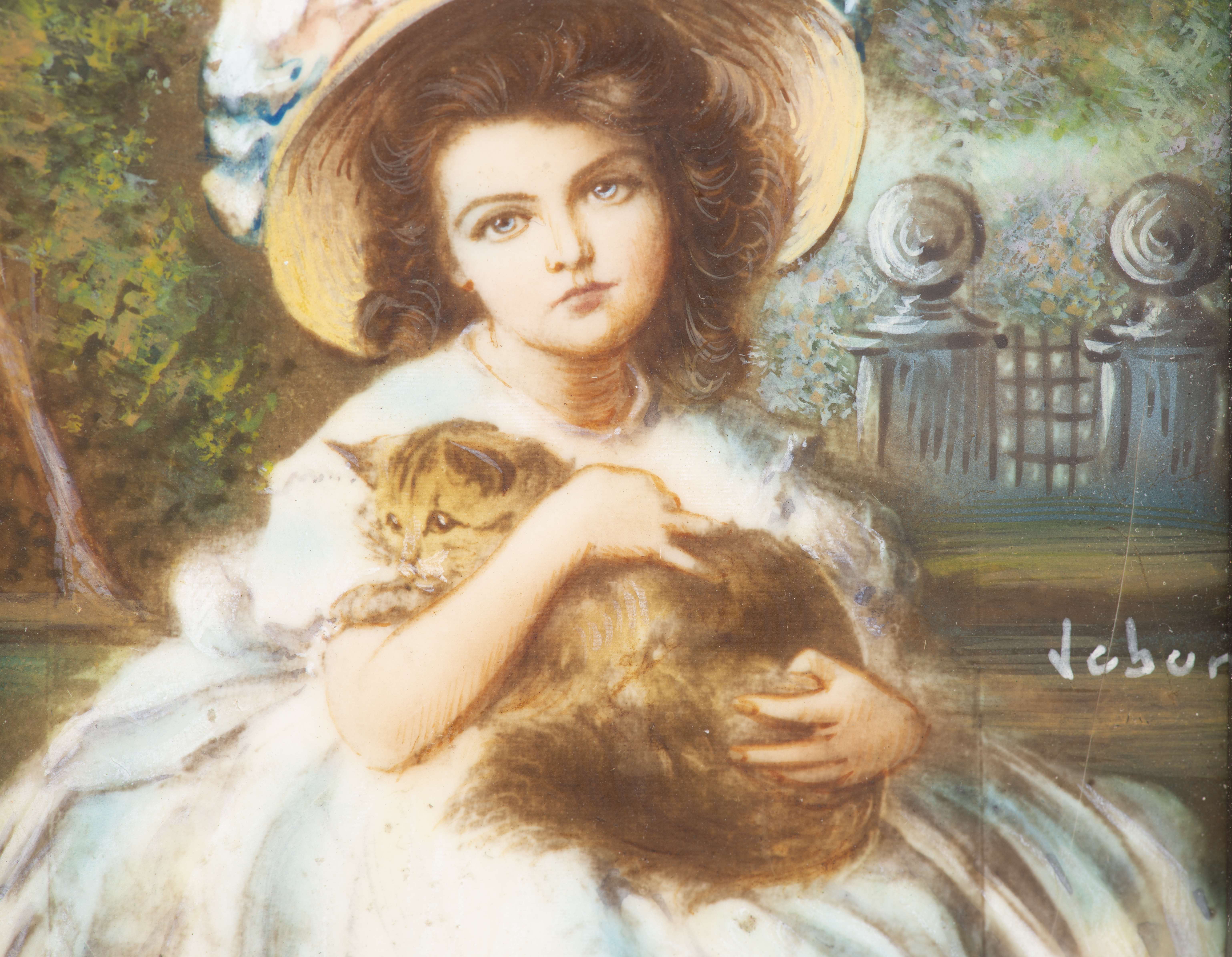 Miniature sur ivoire "Petite fille au chat" signé au milieu à droite.