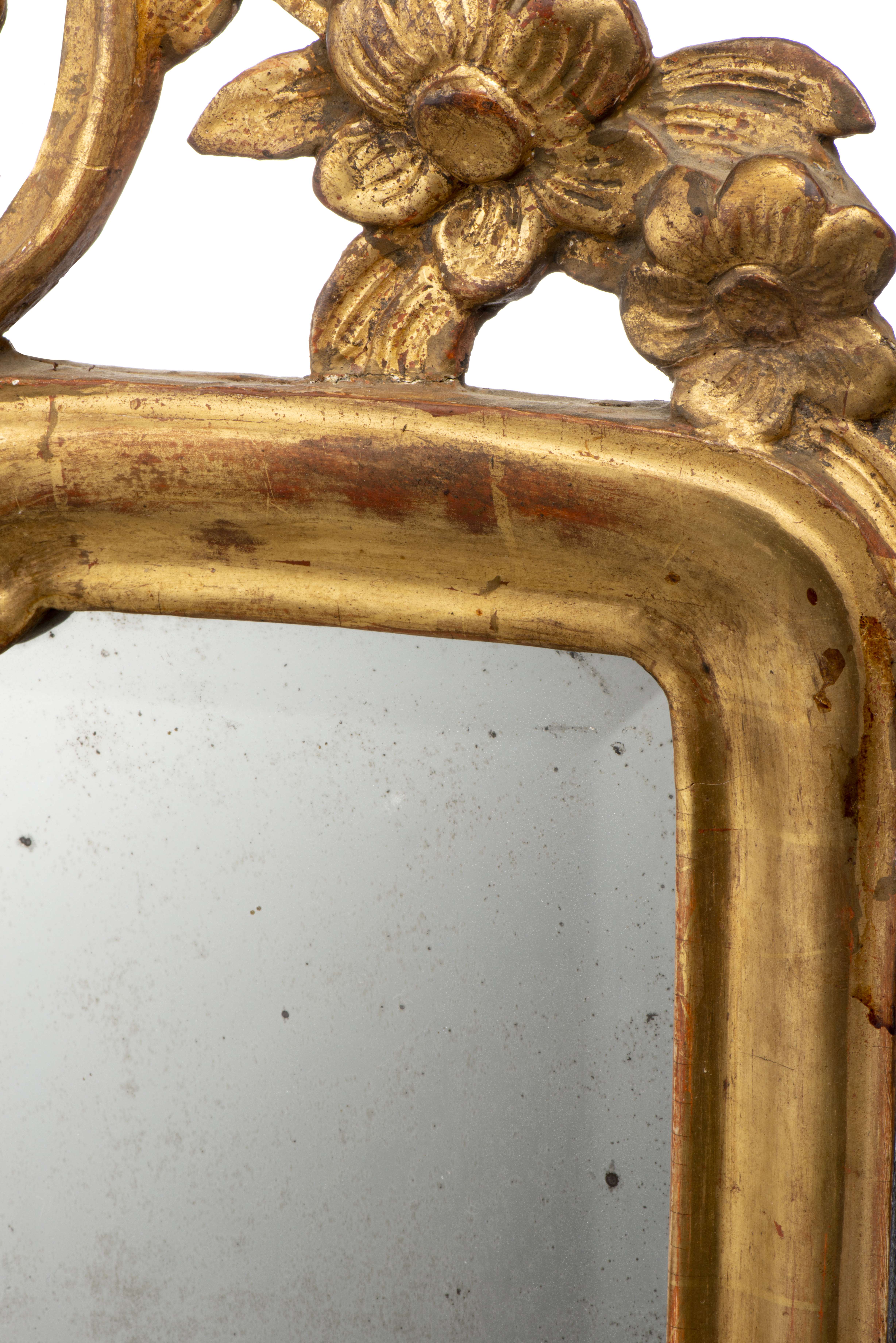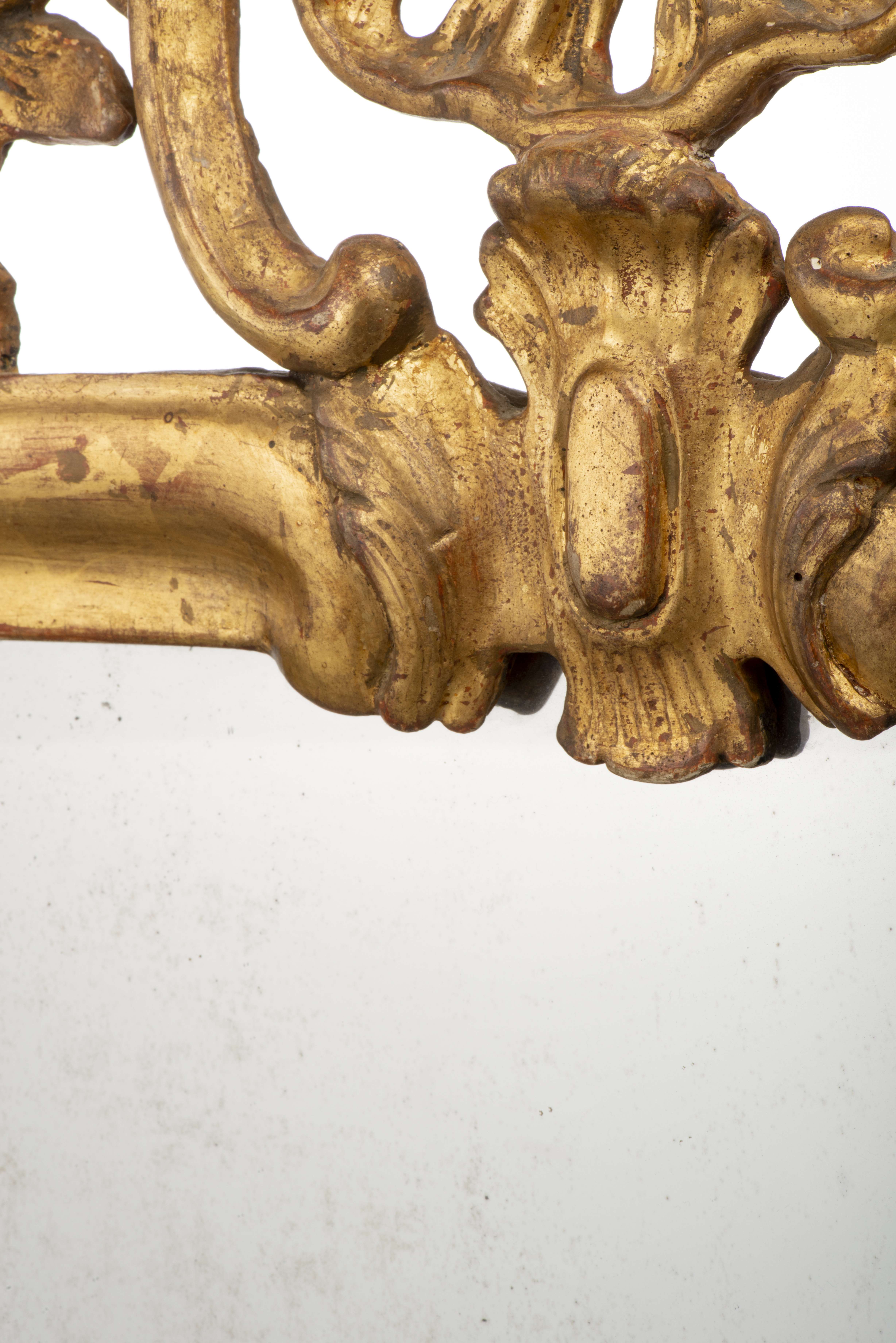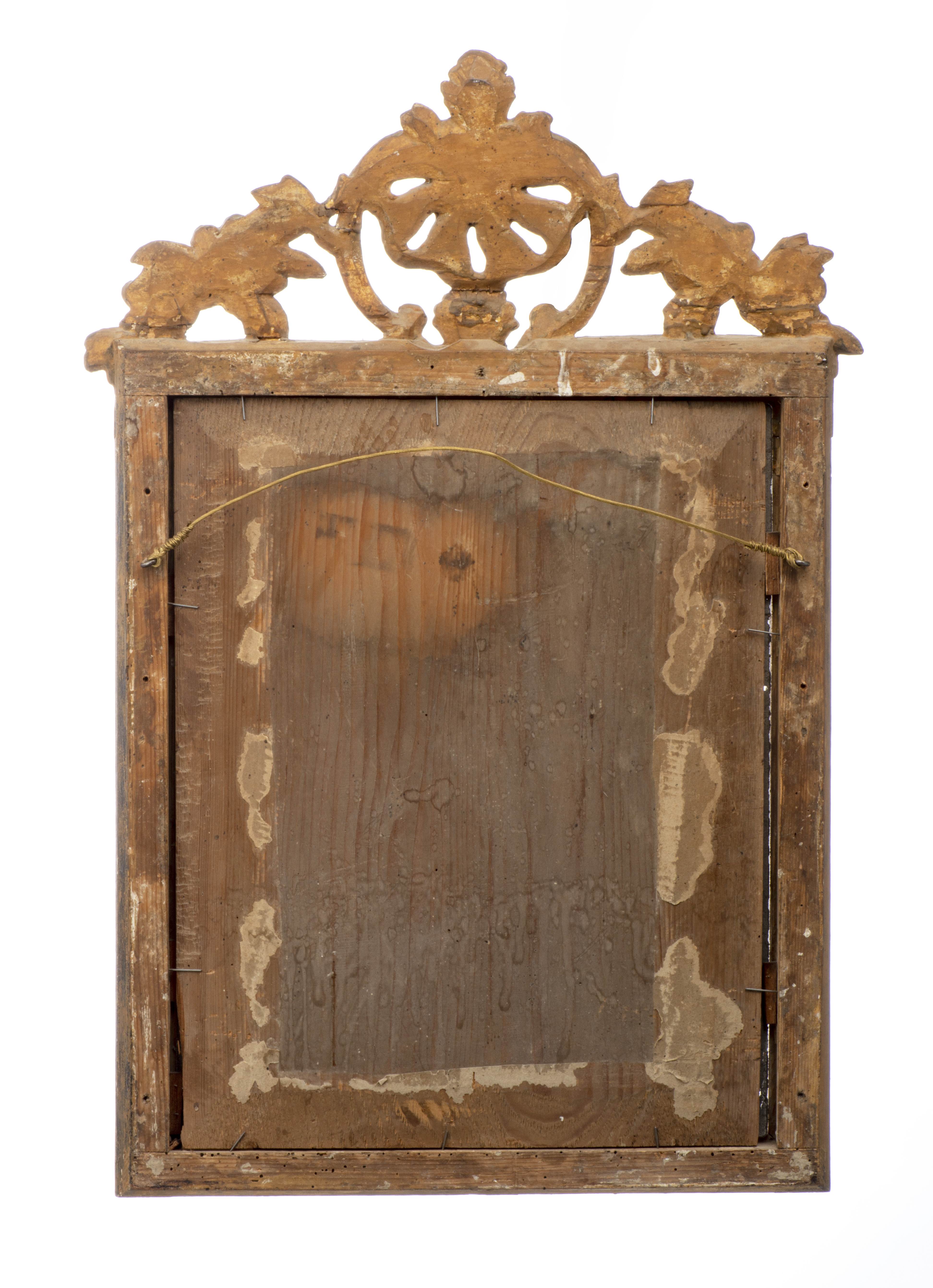 Miroir bernois attribué à Funck, glace d'origine au mercure biseautée, bois et stuc doré, fronton ajouré à décor d'ornements et fleurs, XVIIIe.