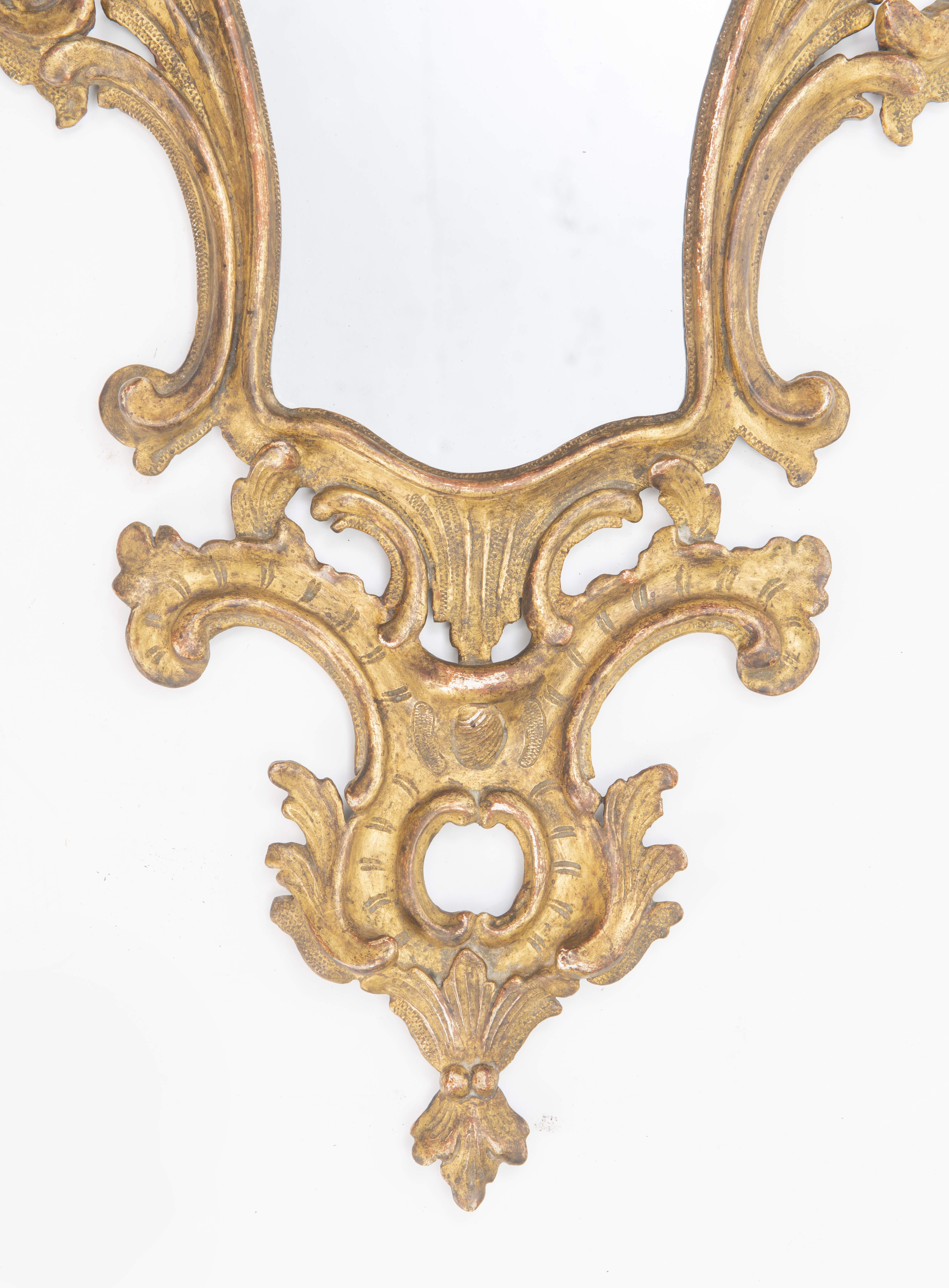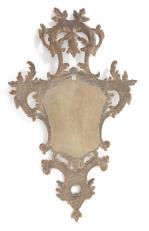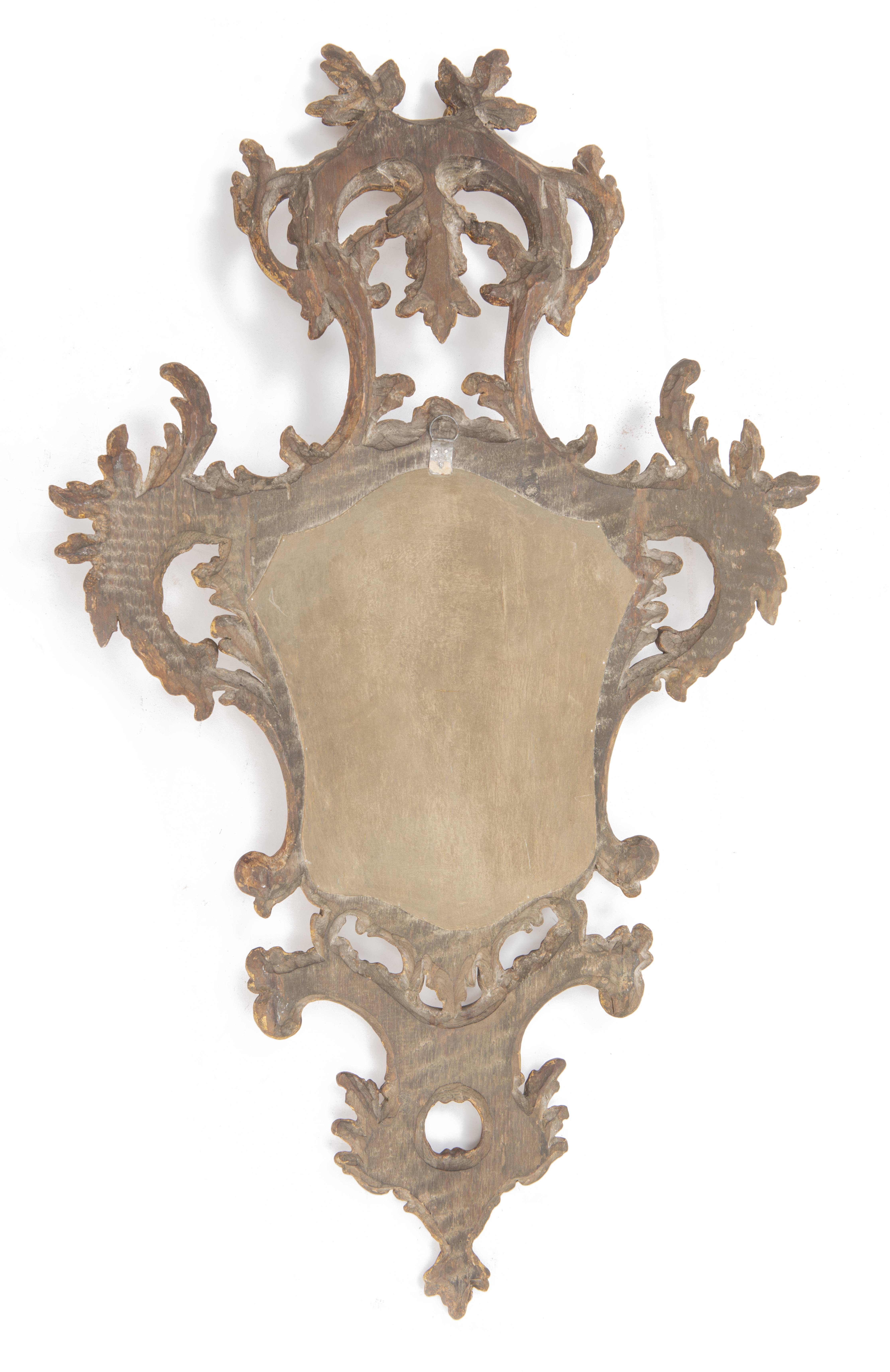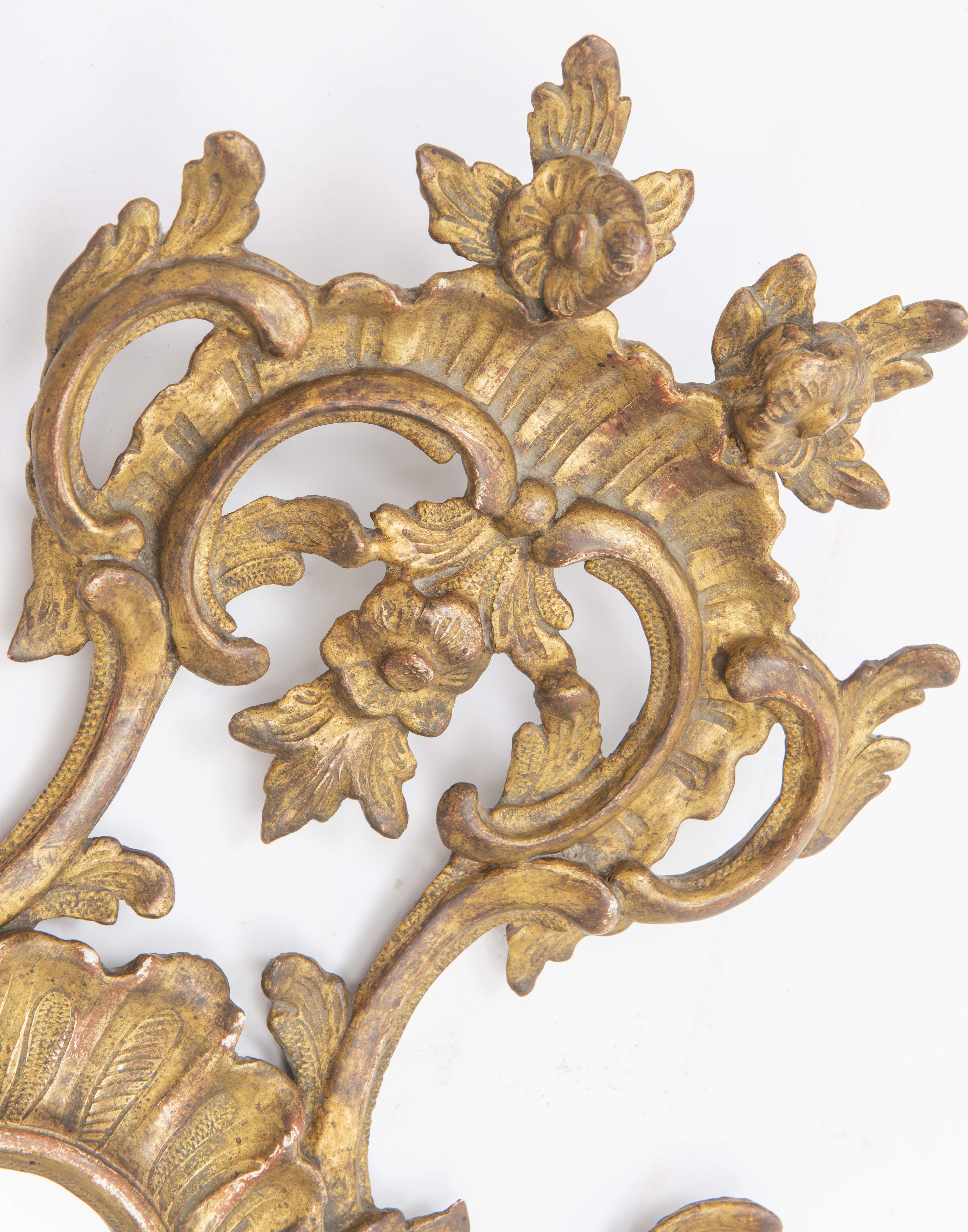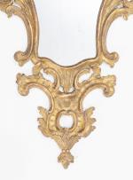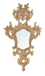 Miroir de style rocaille en bois et stuc doré à large fronton, décor de coquilles et fleurs.