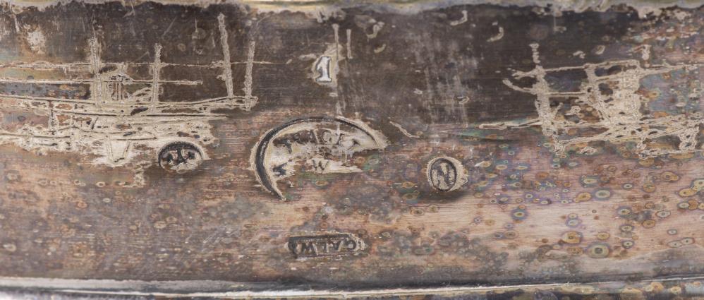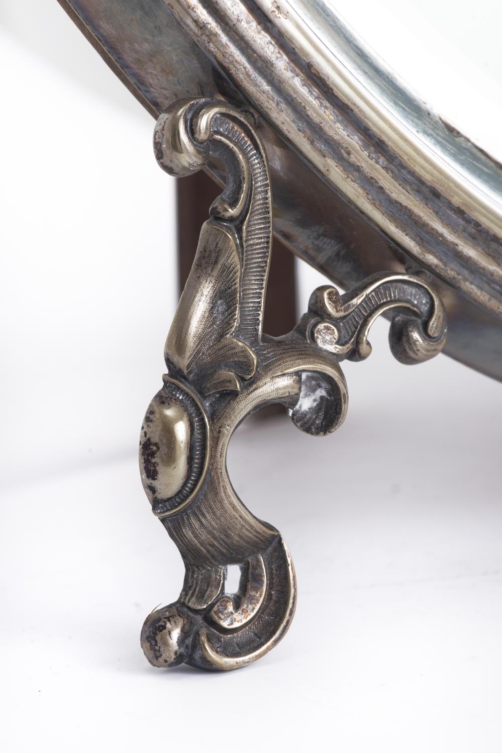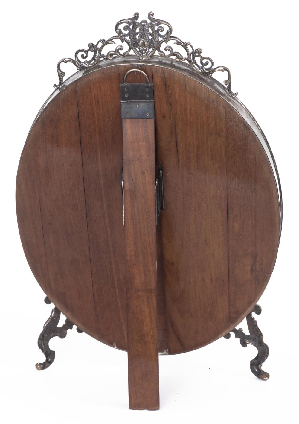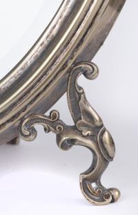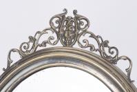 Miroir de table ovale de style baroque à encadrement en métal argenté, fronton à la grappe de raisin, glace biseautée.