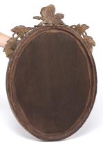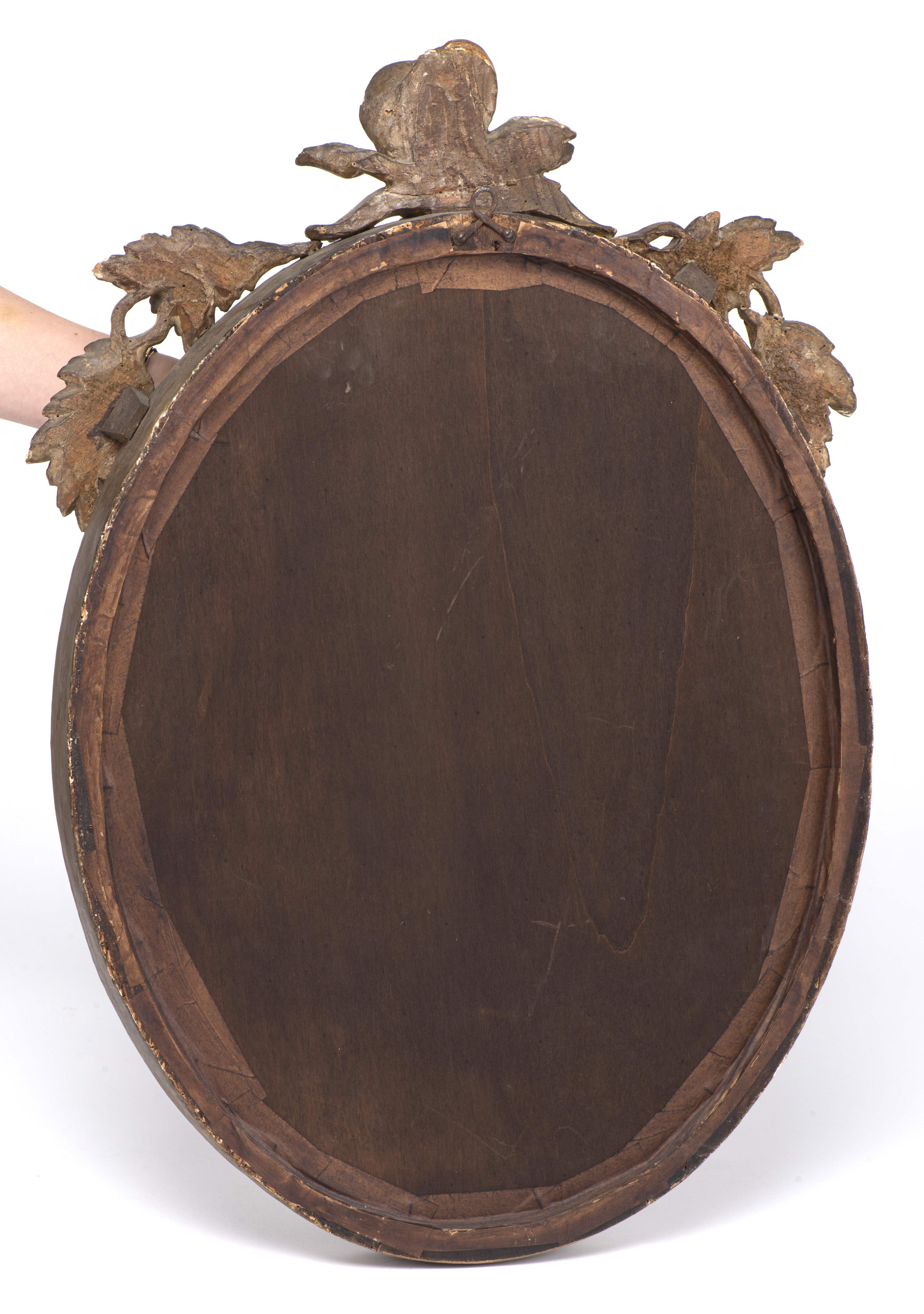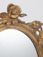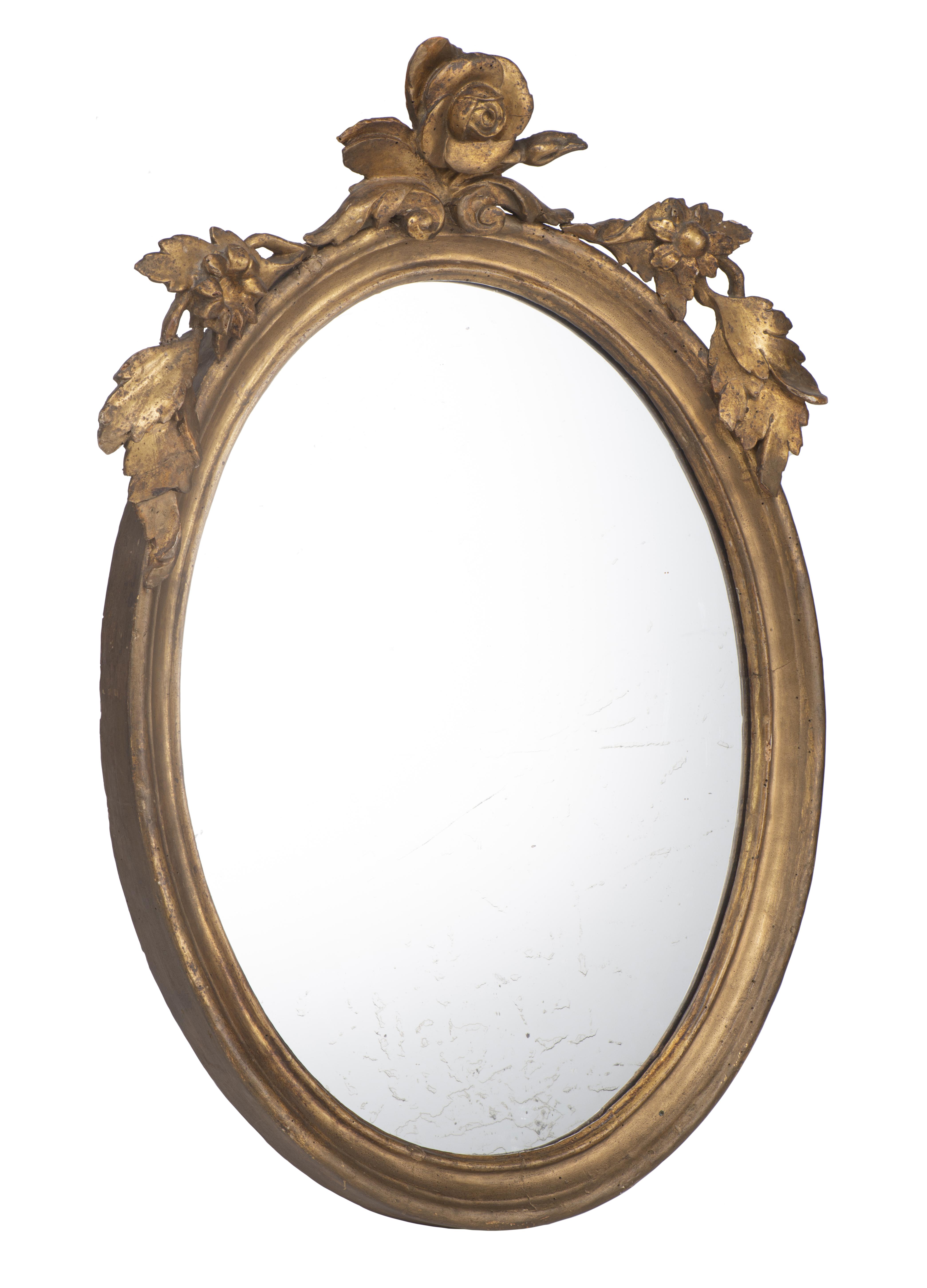 Miroir ovale italien baroque en bois doré à fronton à décor de roses.