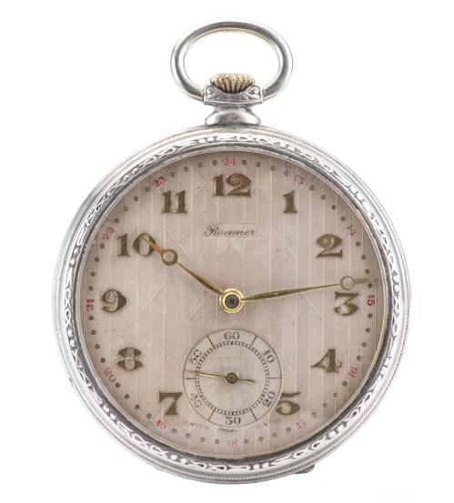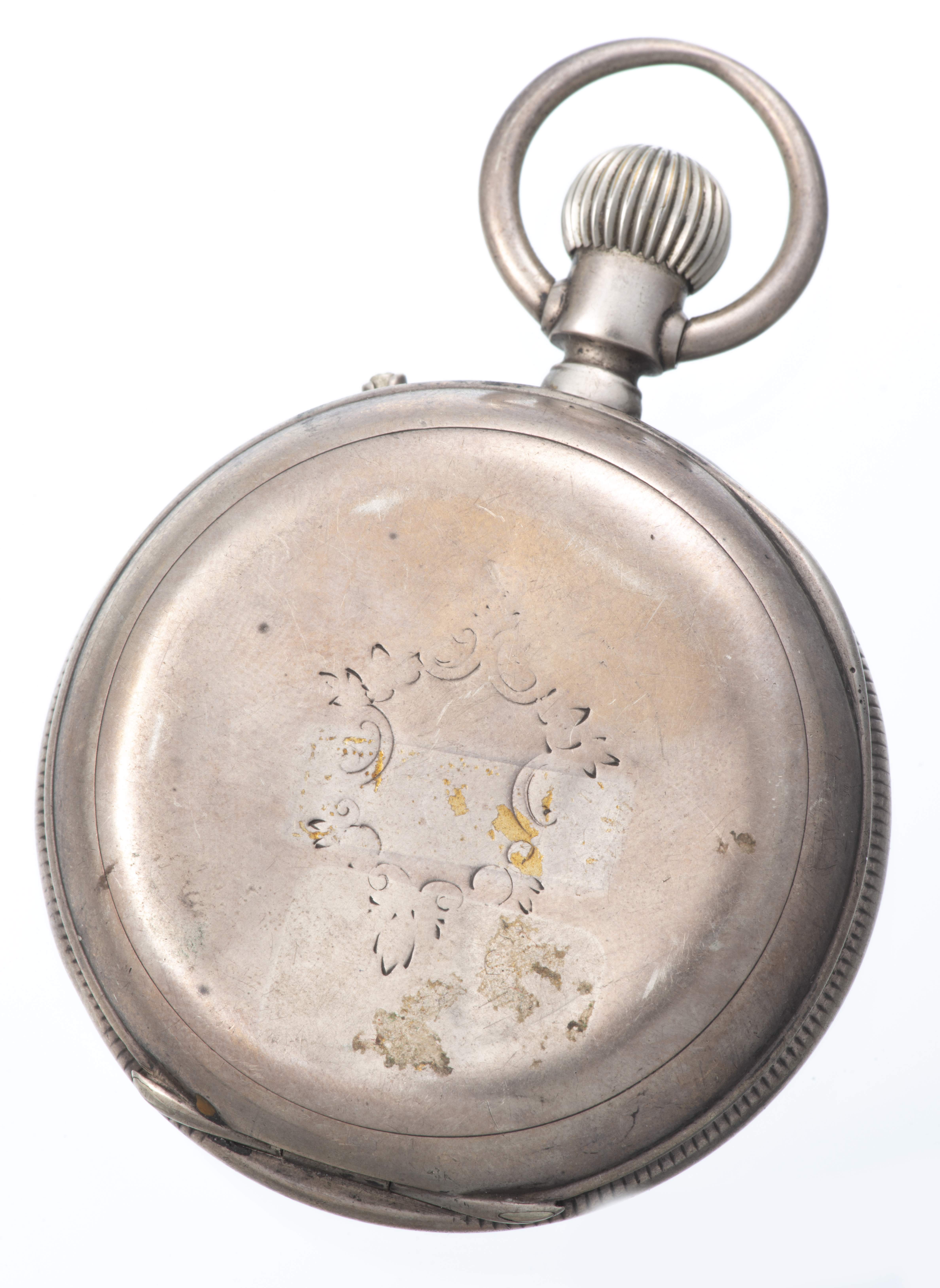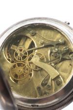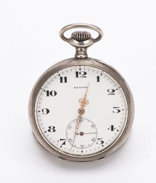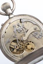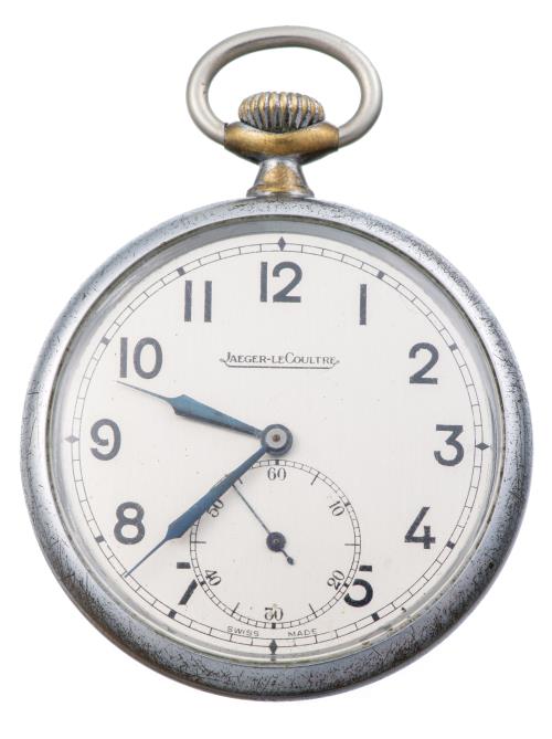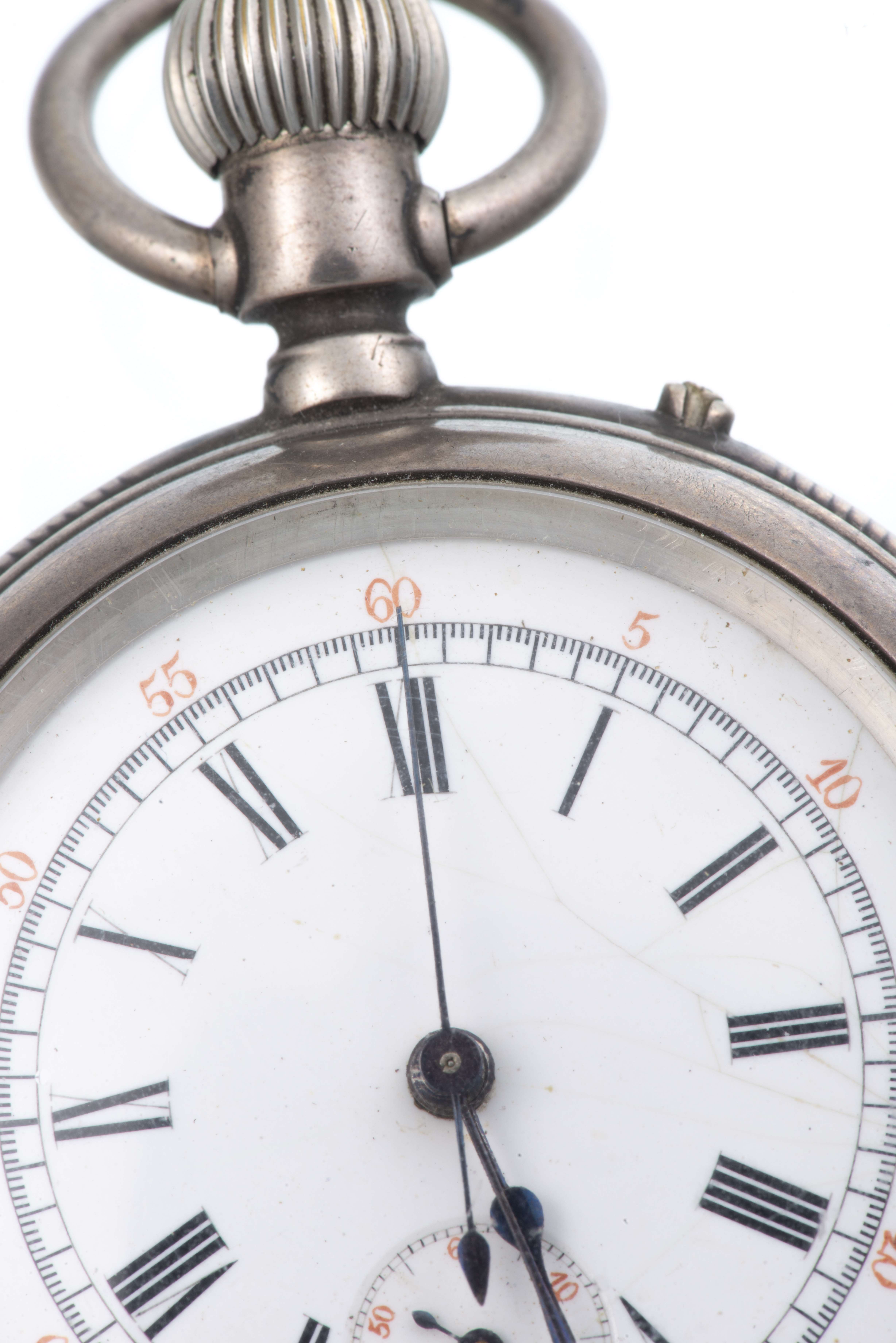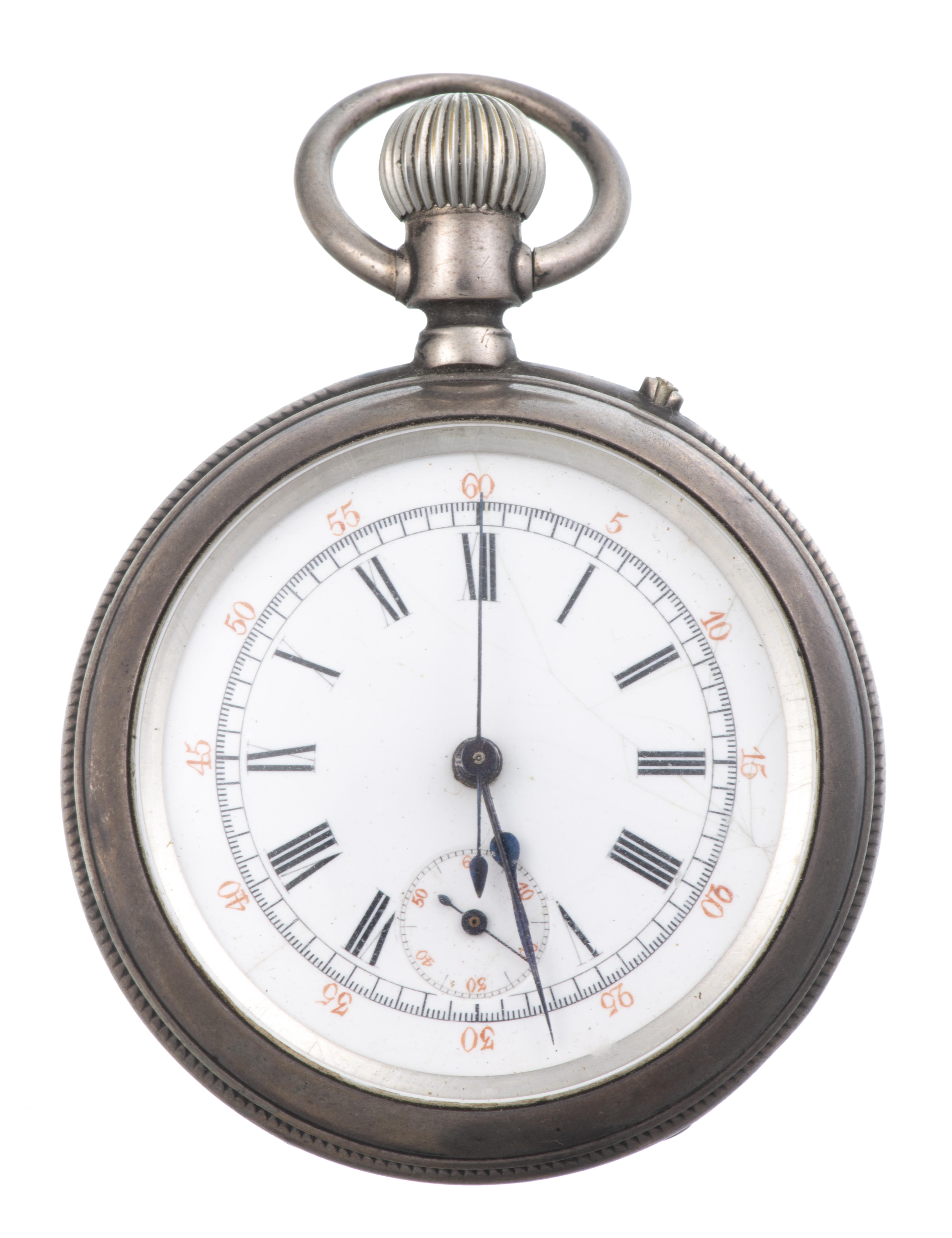 Montre chronomètre anonyme boîte métal n° 219898 à cadran blanc, petite aiguille des secondes à 6h, grande seconde centrale pour le chronomètre, chiffres romains pour les heures 1 à 12 en noir et chiffres arabes en rouge pour les secondes et le chronomètre. Dos gravé d'un écu vide.