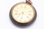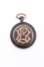 Montre de poche de dame en métal noirci sans marque, n°24873, boîte marquée FB avec une clef dans un rectangle à coins coupés, monogrammée LB au dos en or rose à bas titre, ardillon en or rose à bas titre.