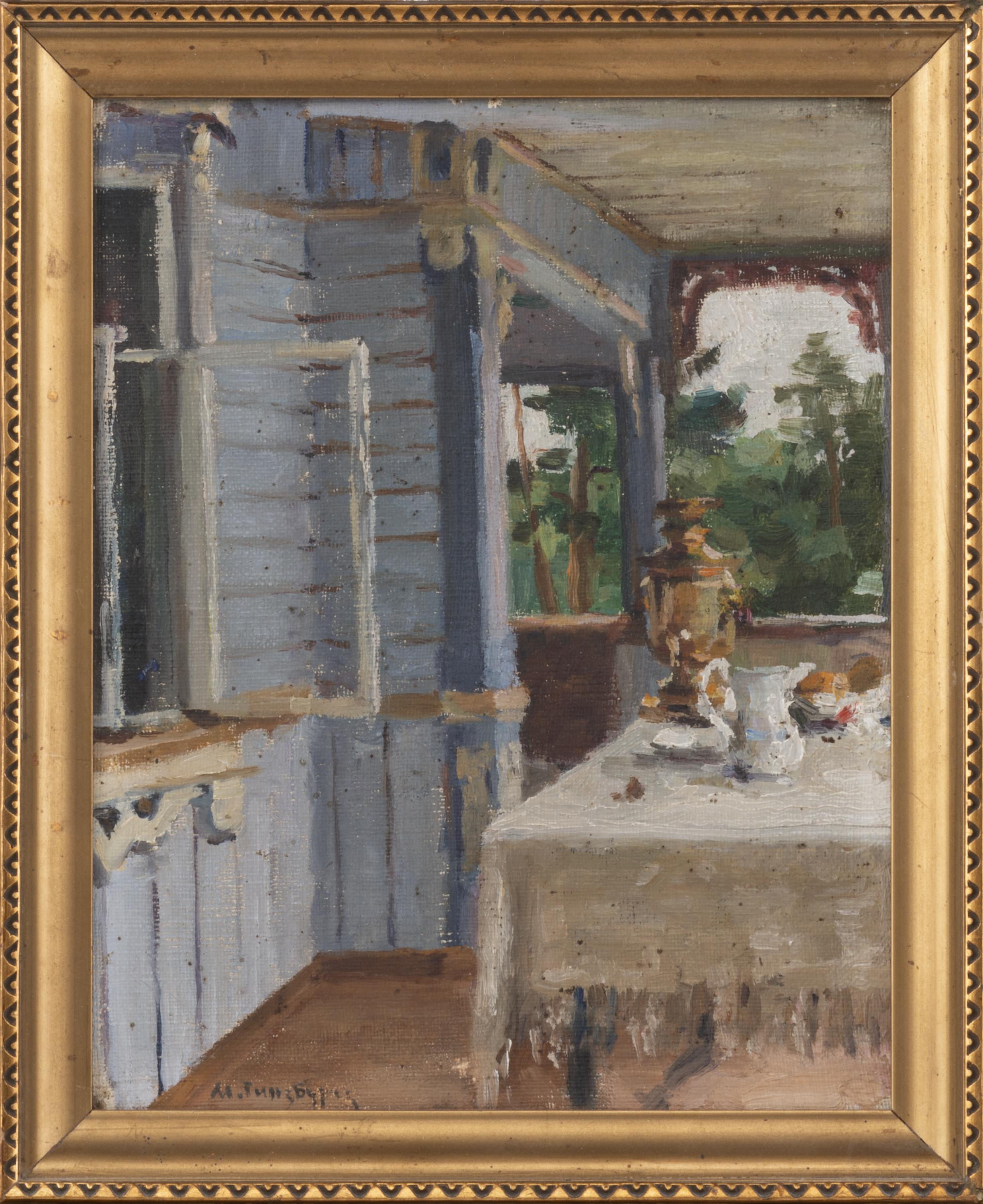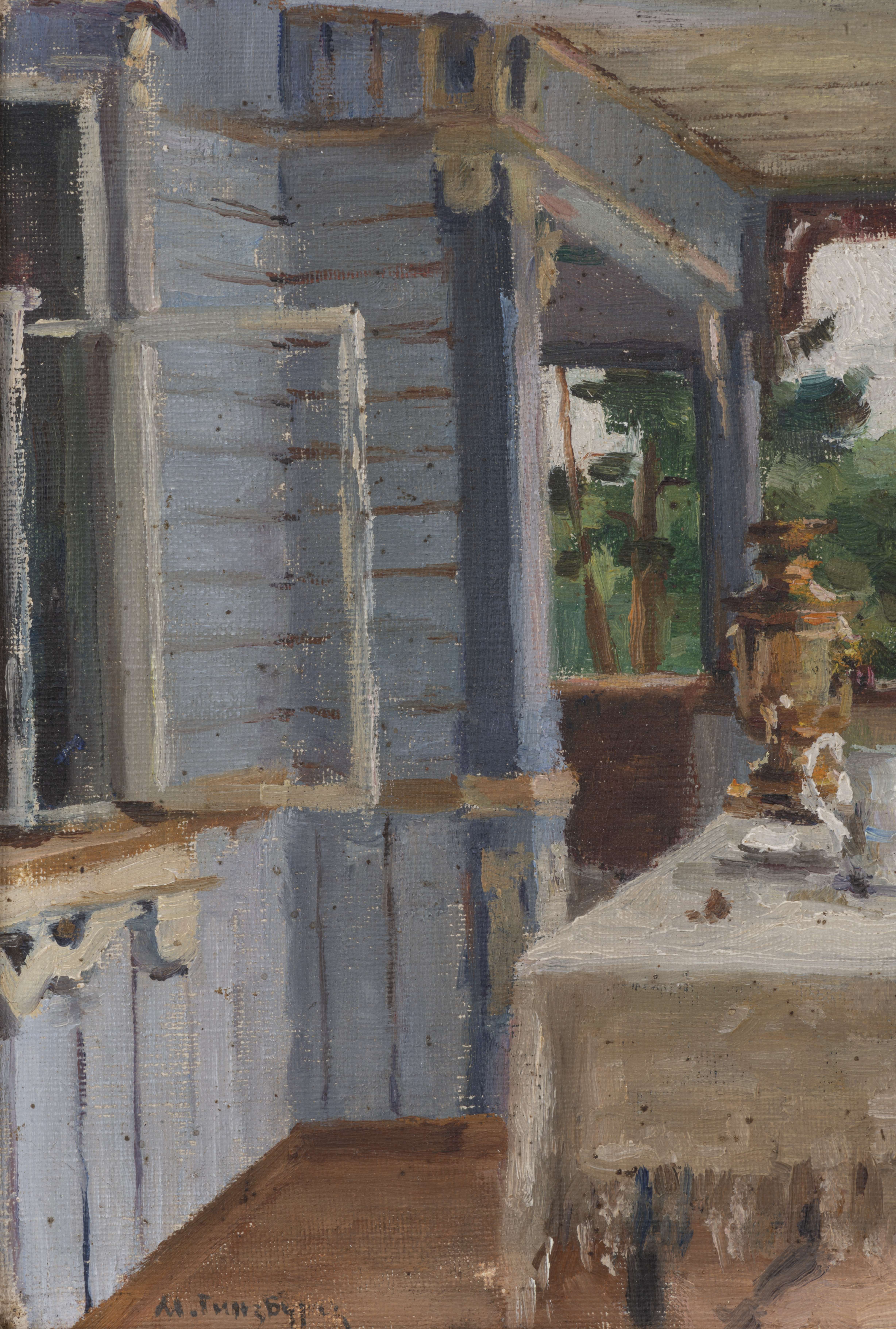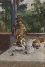 Moïseï GINZBOURG (1892 - 1946), Attribué à, "La datcha", Huile sur panneau, signé en bas à gauche : "M.Гинцбург".