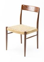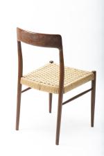 Niels Otto MOLLER, Attribué à, Ensemble de 4 chaises à structure en teck, dossier bandeau, assise en cordage, modèle créé en 1950.