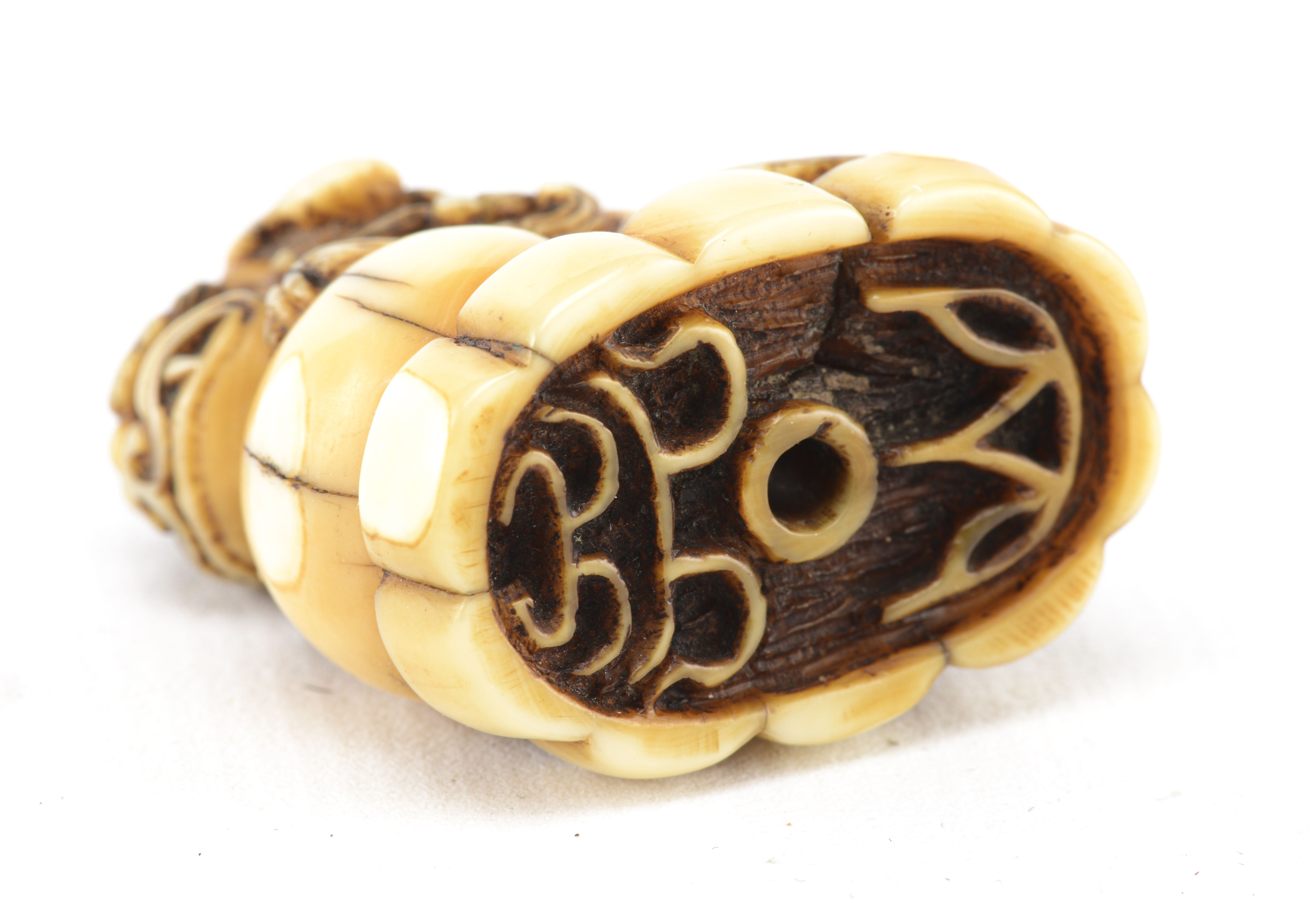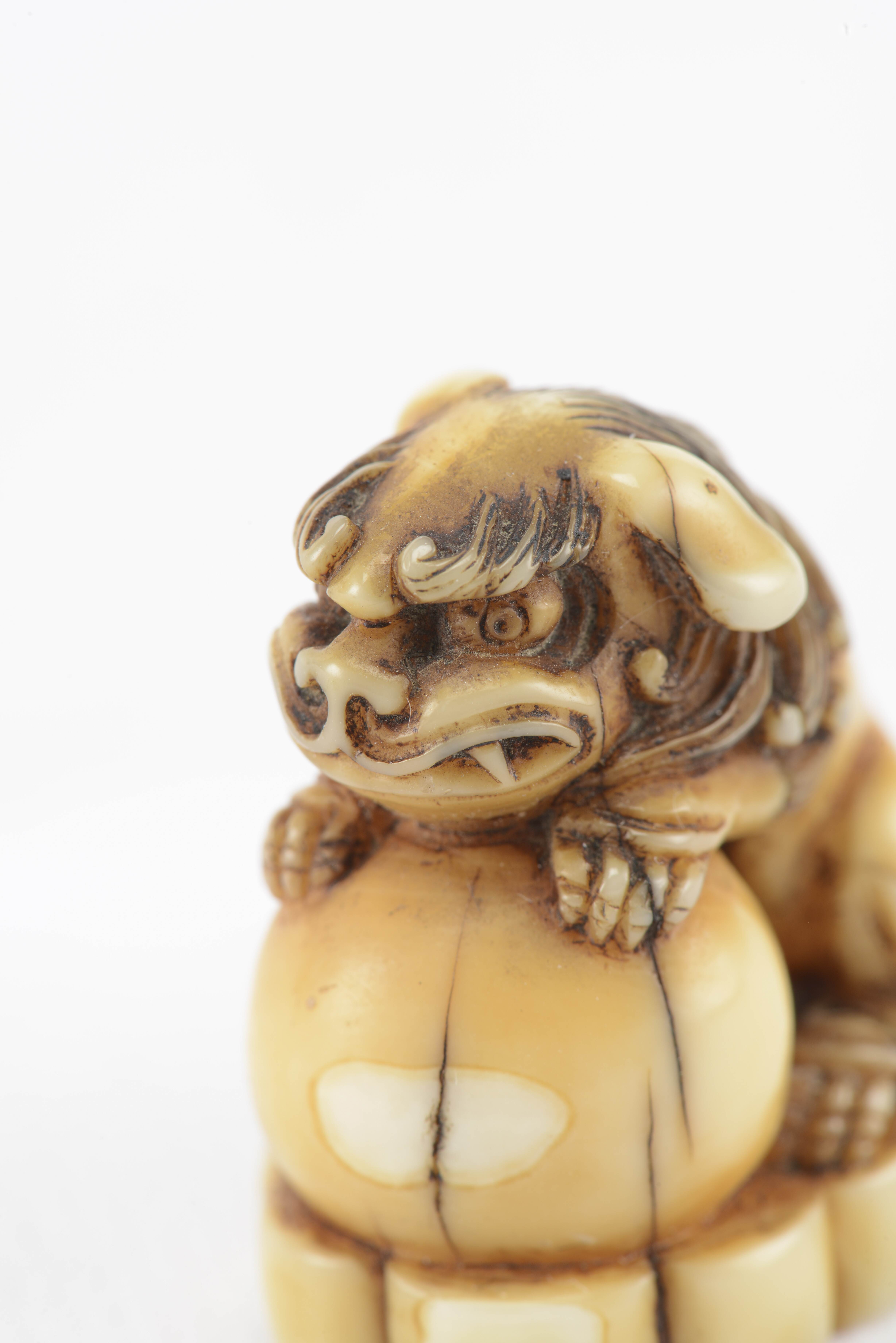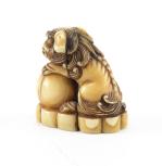 Ojime en ivoire faisant également office de sceau à deux caractères en dent de morse et en forme de shishi poussant une boule.