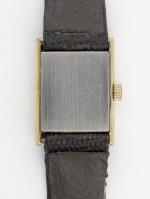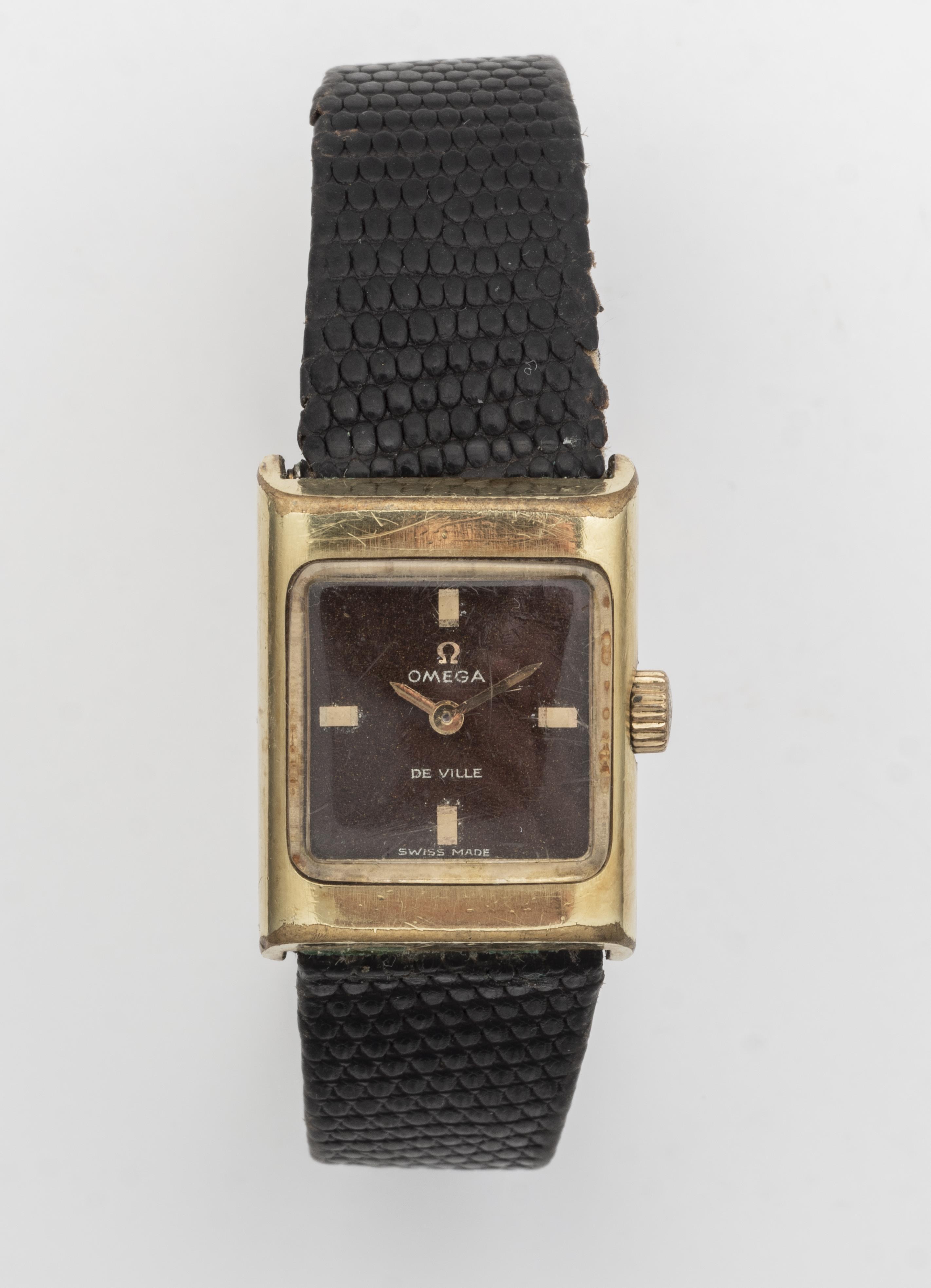 Omega de ville, montre bracelet de dame rectangulaire à cadran noir et boîte en métal doré. Aiguille des minutes et des heures.