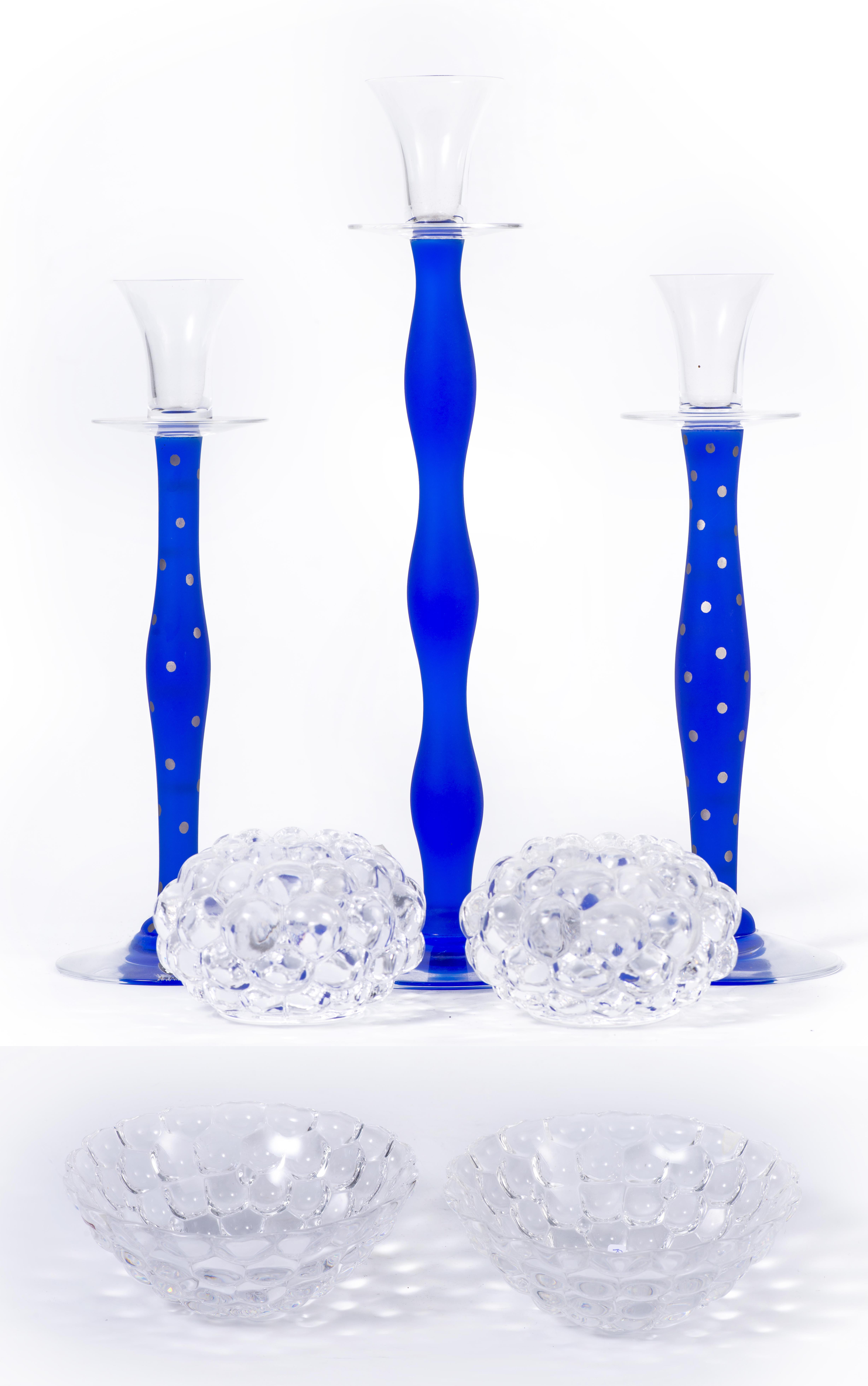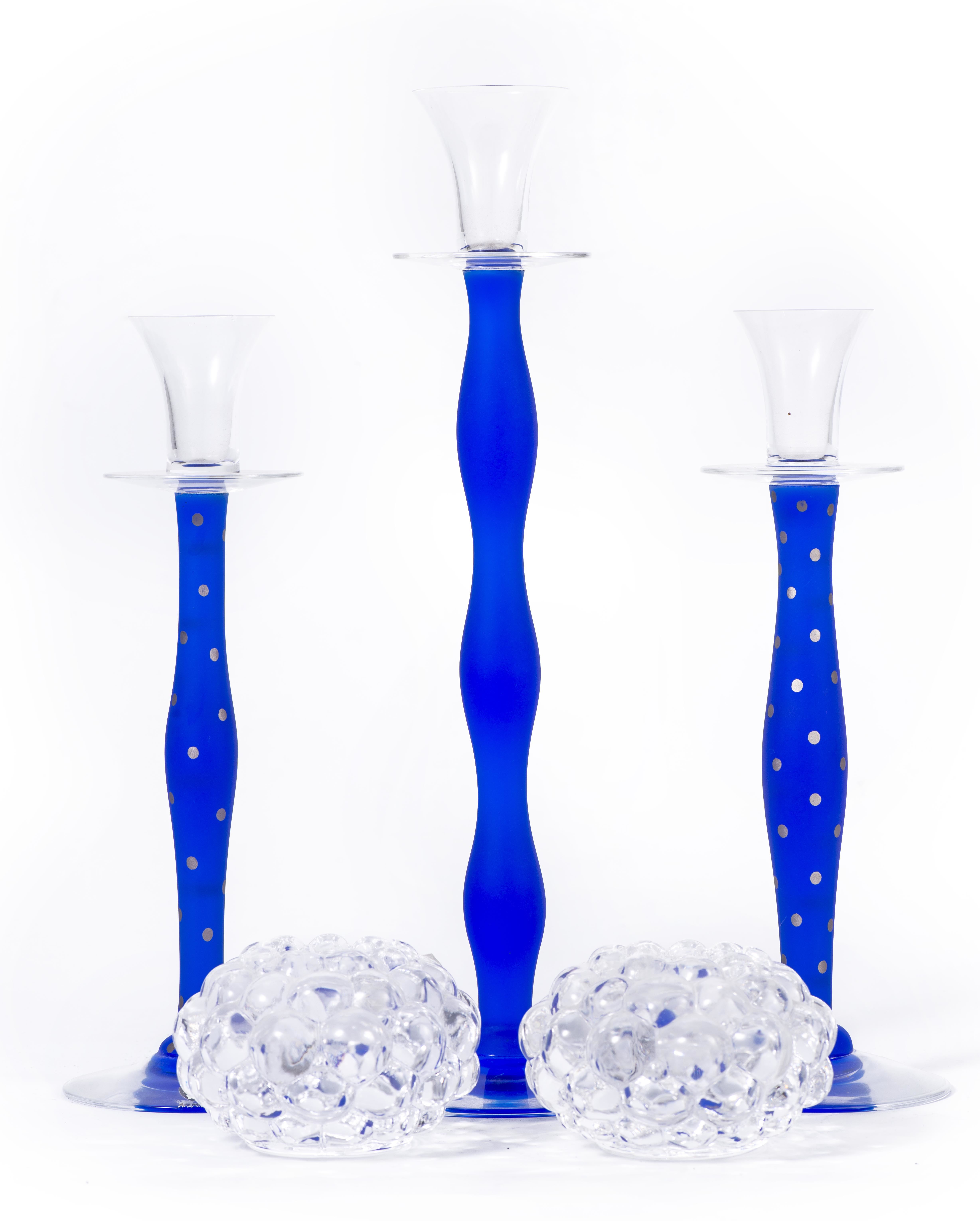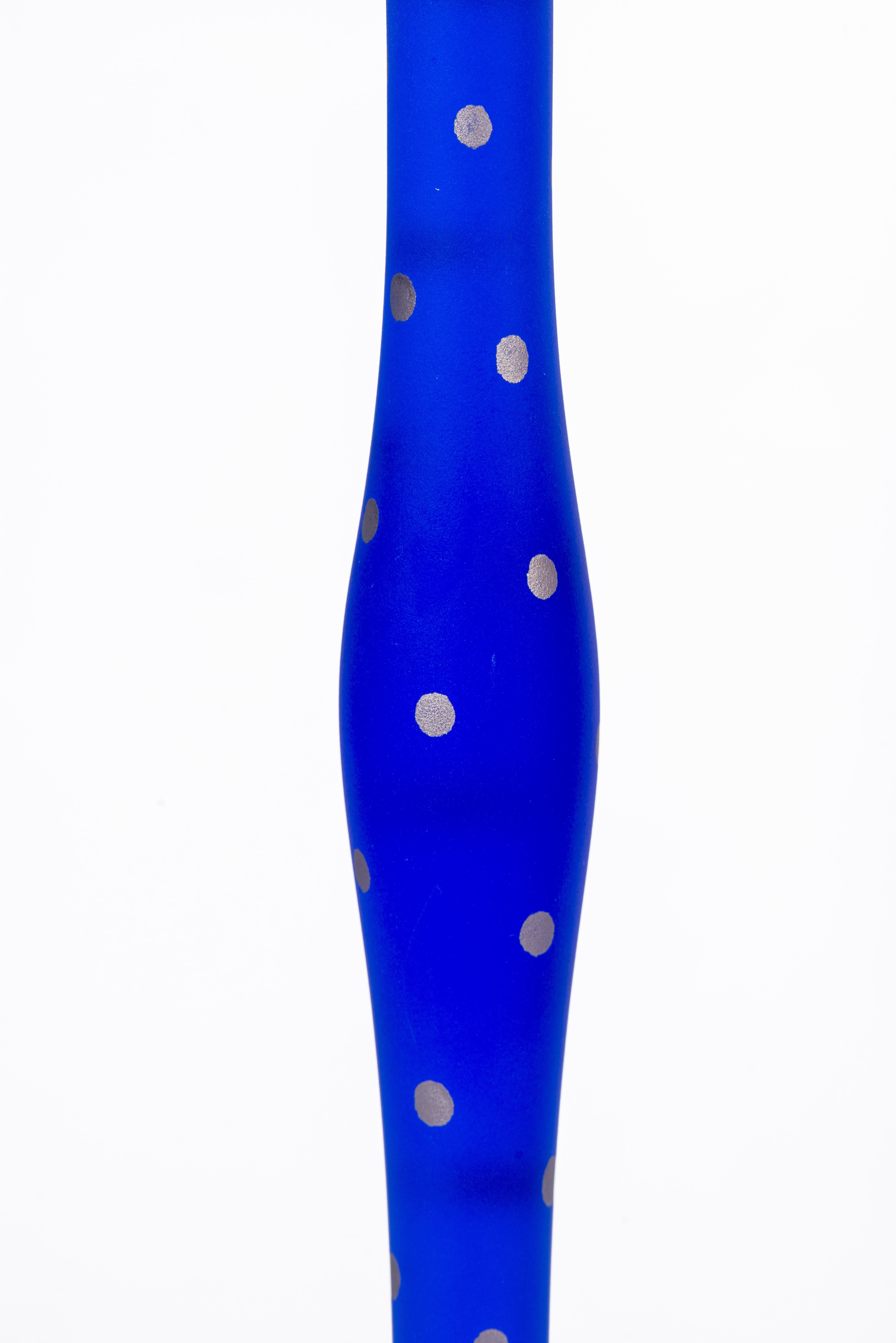 - 2 bougeoirs sur pieds fûts en verre bleu mat à décor de pois, H. 29 cm & Diam. 10 cm