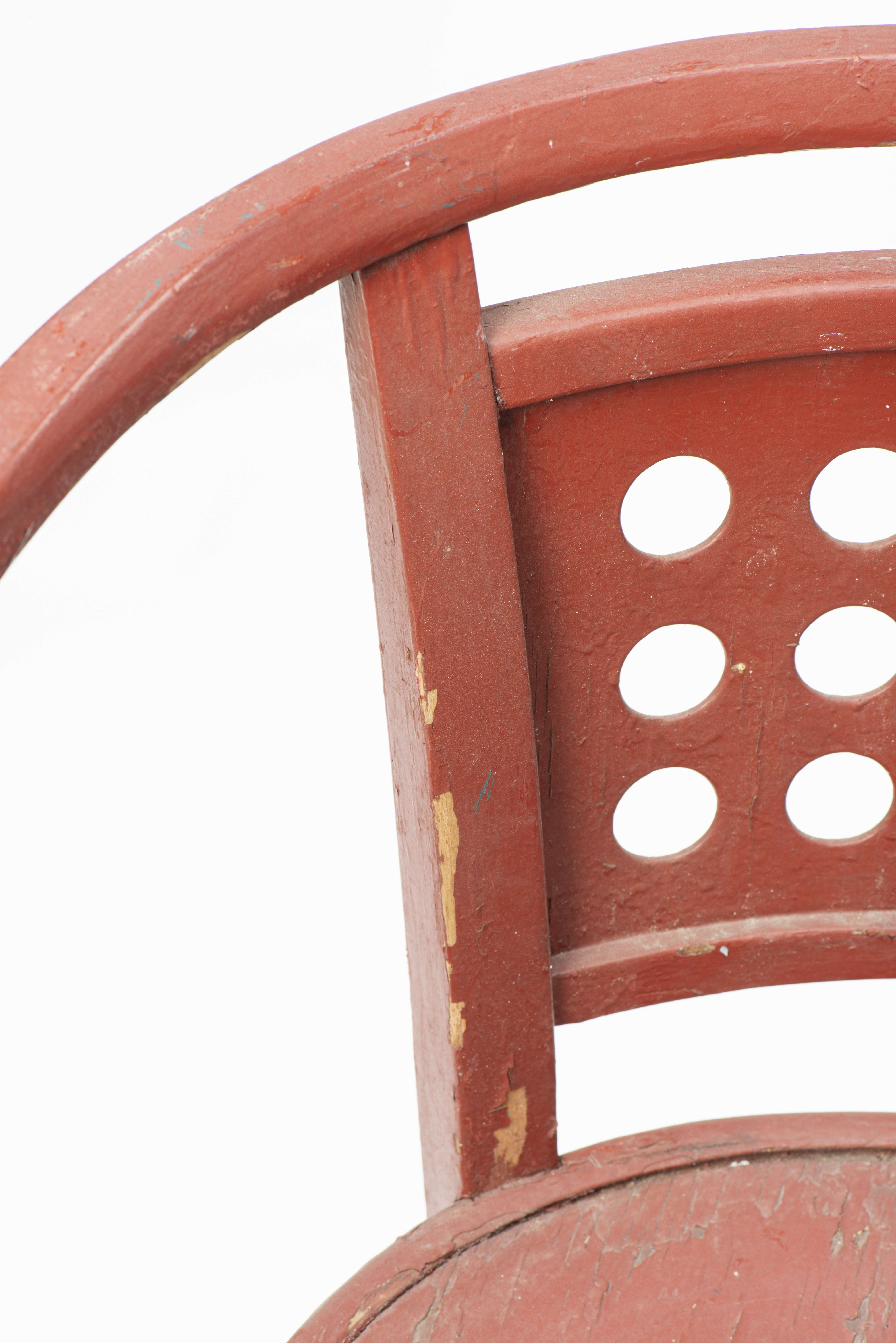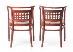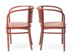 Otto WAGNER (1914-1918), circa 1905 Paire de fauteuil n°721 en bois tourné laqué rouge et dossier perforé. Porte une étiquette au dessous "Jacob Joseph Khon Wien" ainsi que la marque du tampon