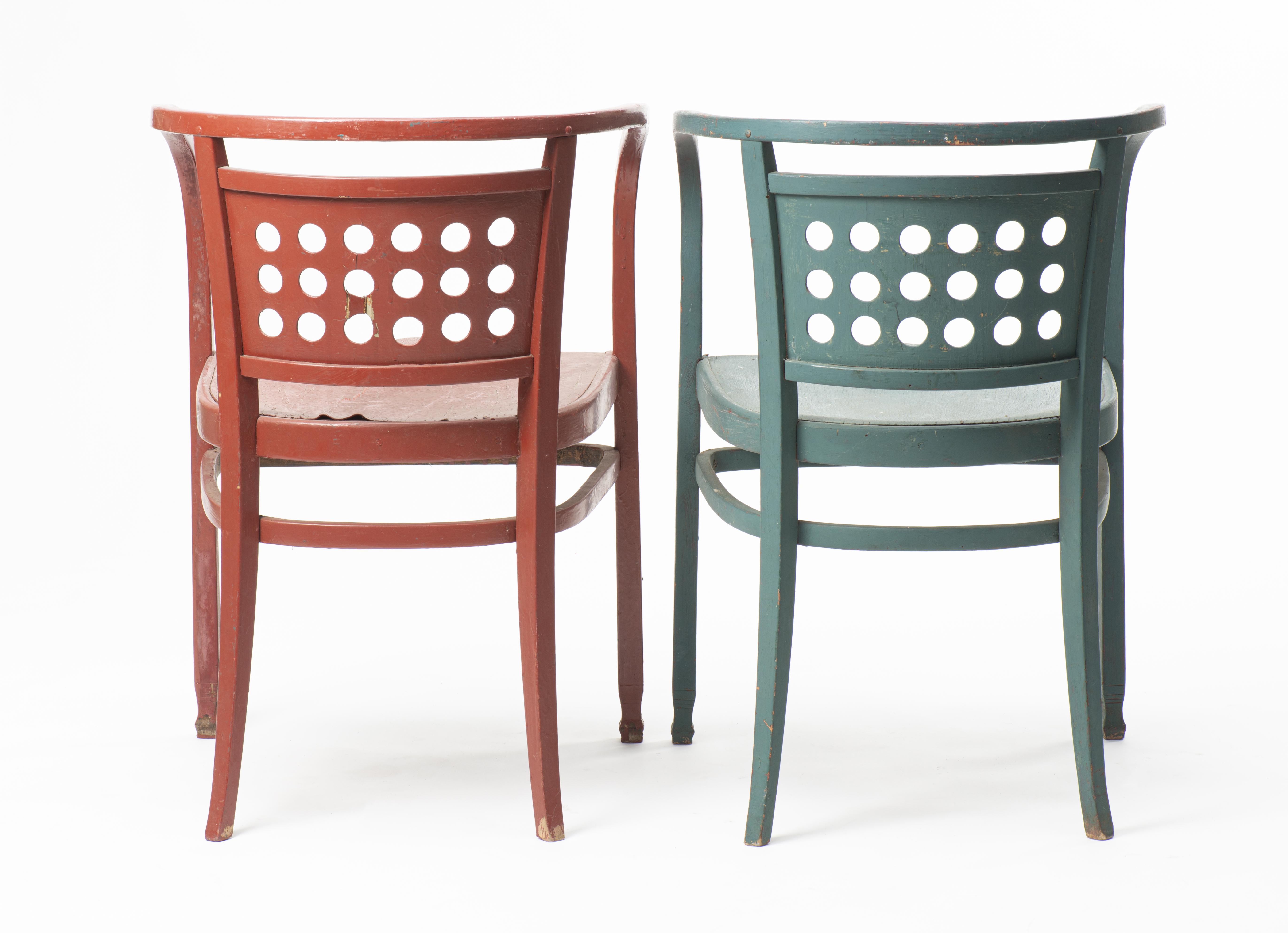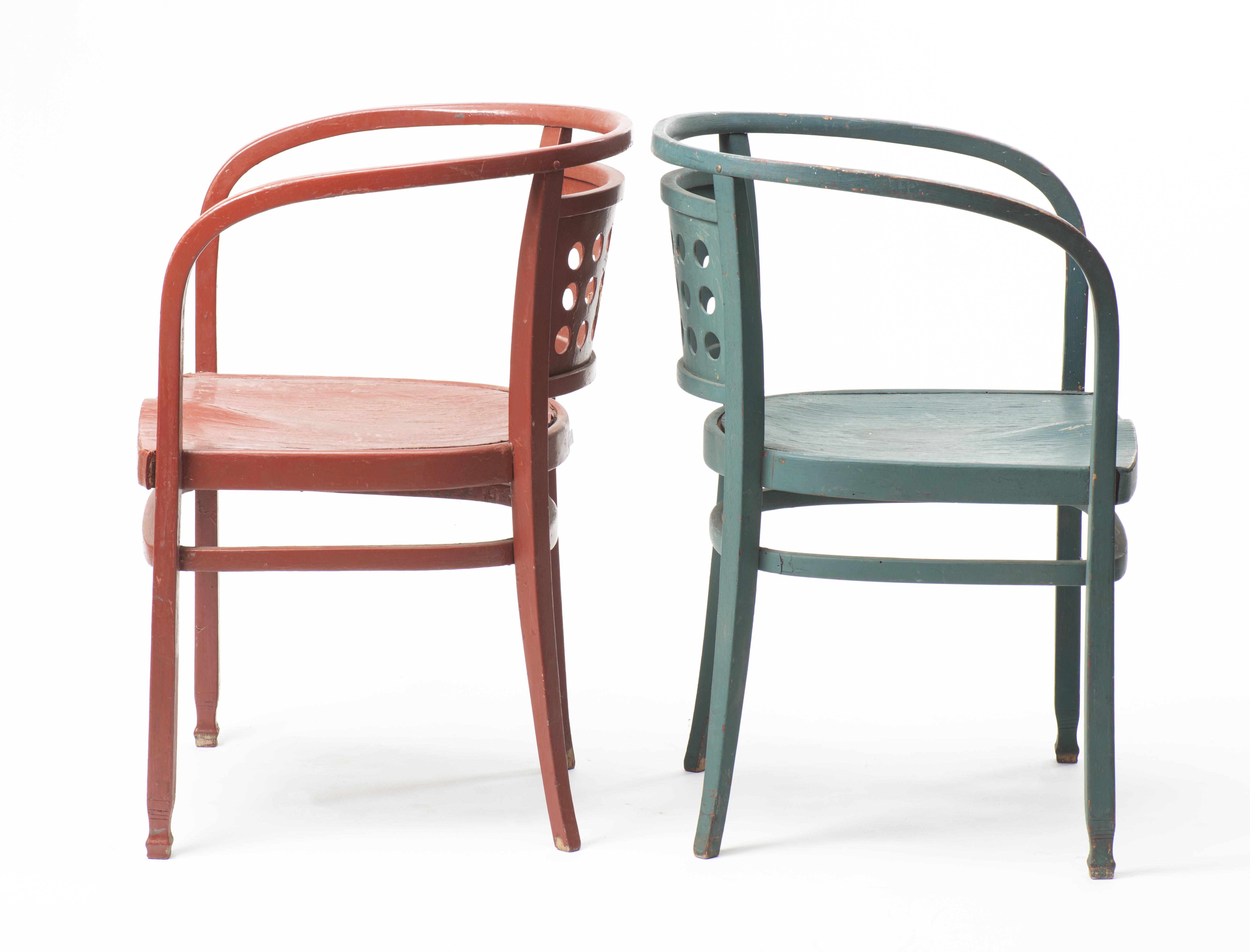 Otto WAGNER (1914-1918), Paire de fauteuils n°721 en bois tourné peint rouge pour l'une et bleu pour l'autre et dossier perforé