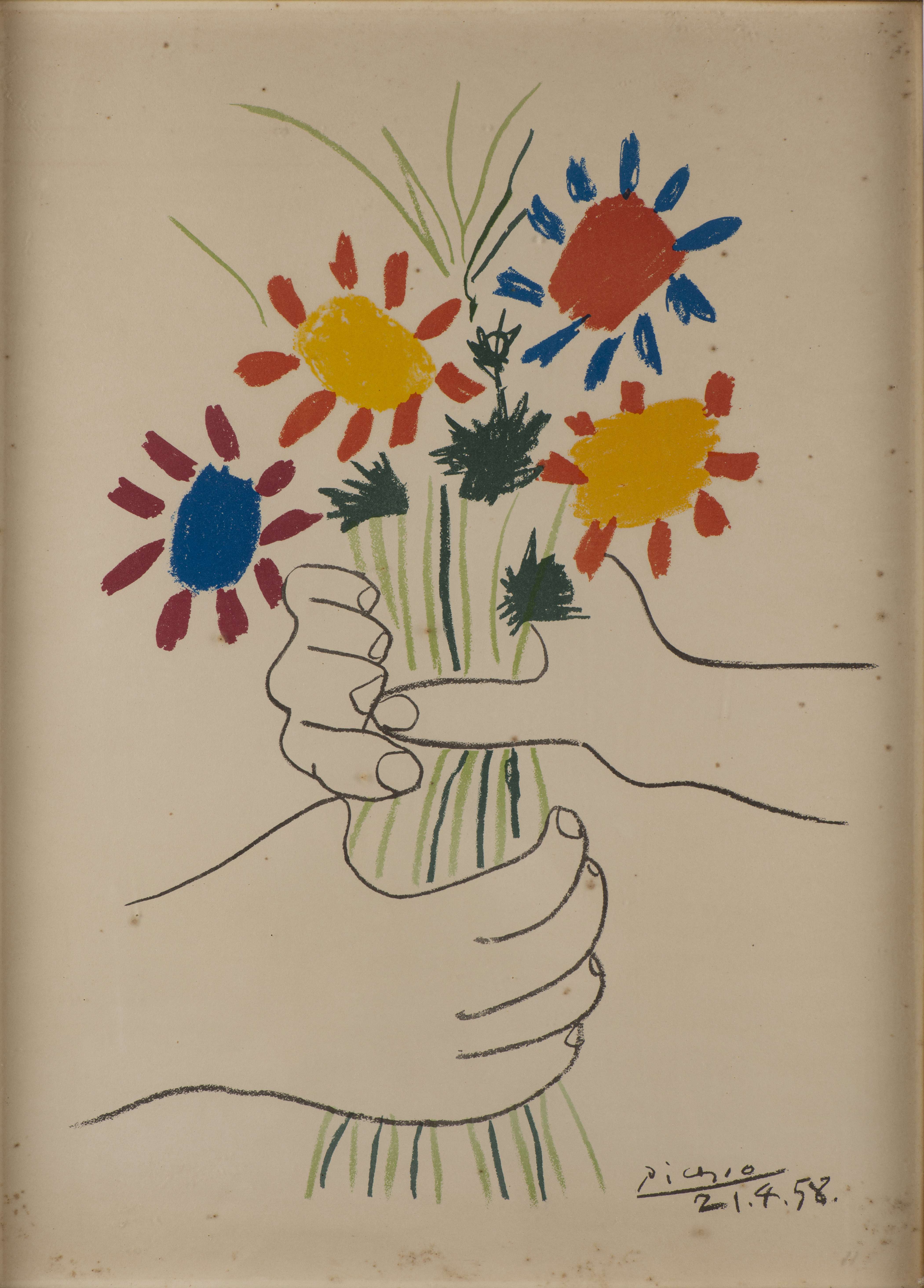 Pablo PICASSO (1881-1973), "Bouquet de fleurs", affiche lithographique en couleurs, signé en bas à droite Picasso et daté 25.04.58 dans la planche.
