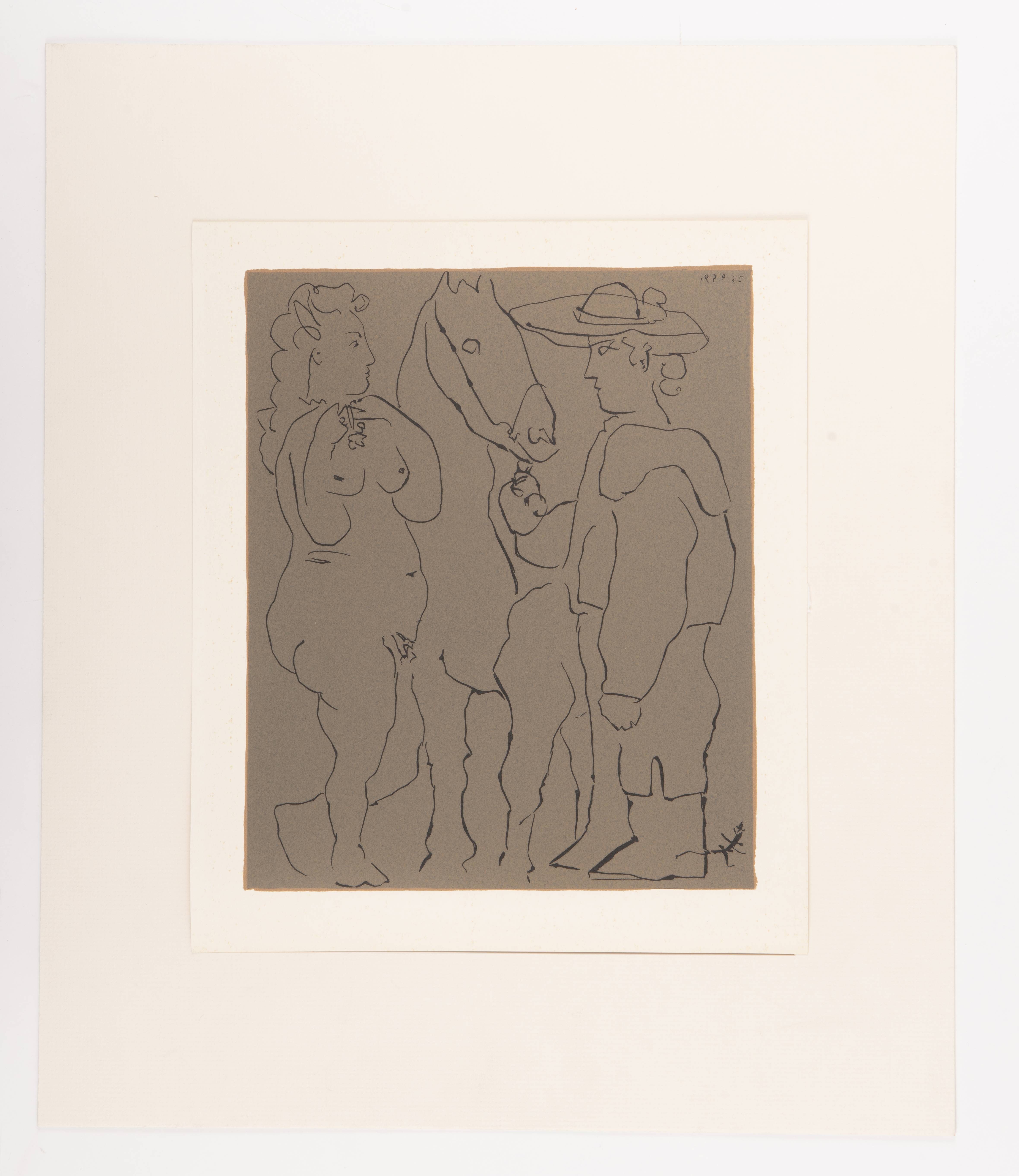 Pablo PICASSO (1881-1973, d'après) "Picador, femme et cheval", linogravure, édition le Cercle d'art, 25/9/59.