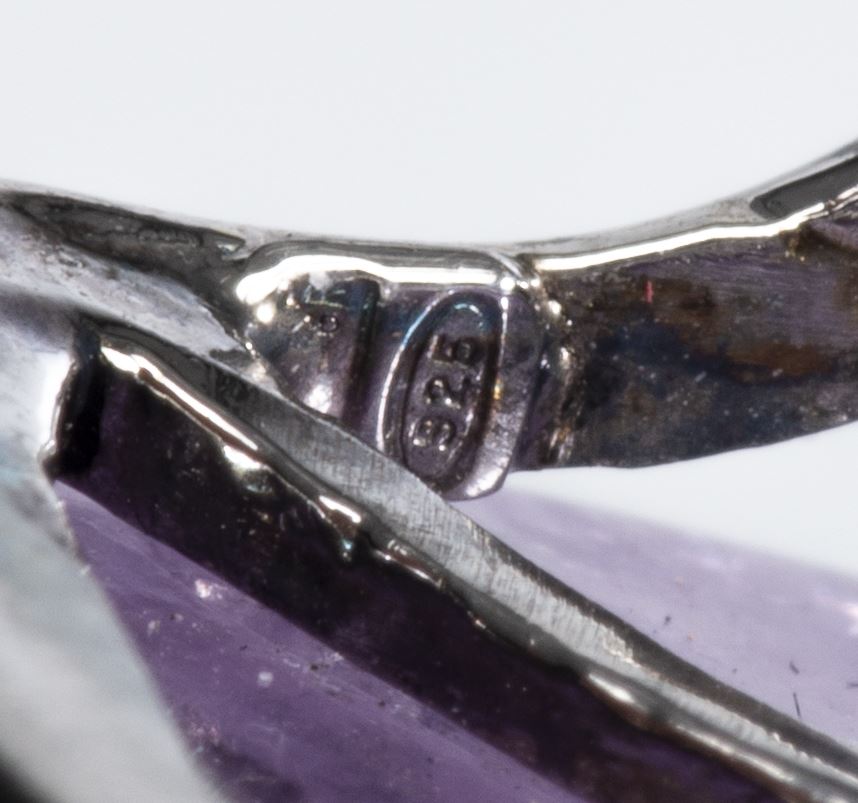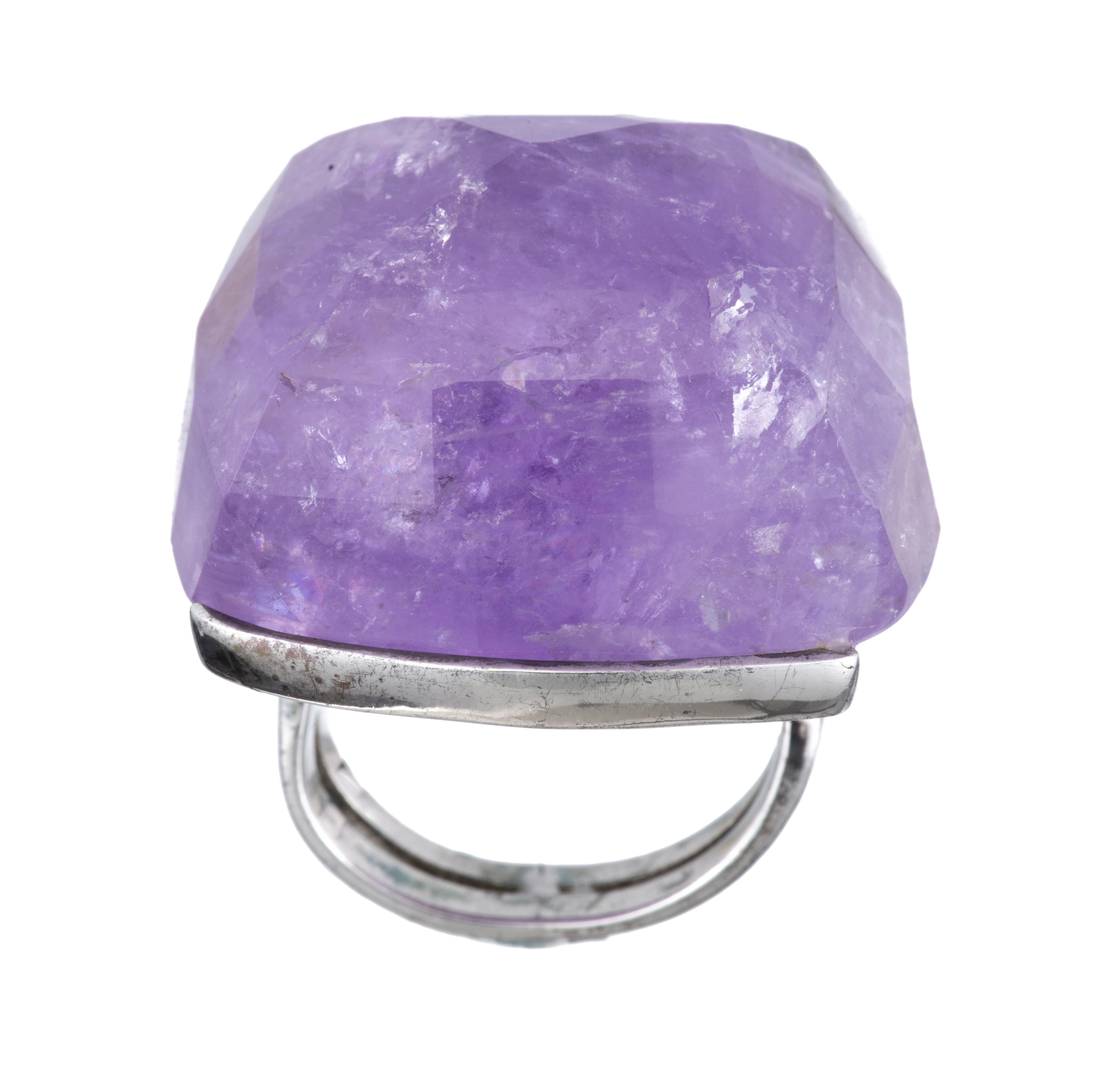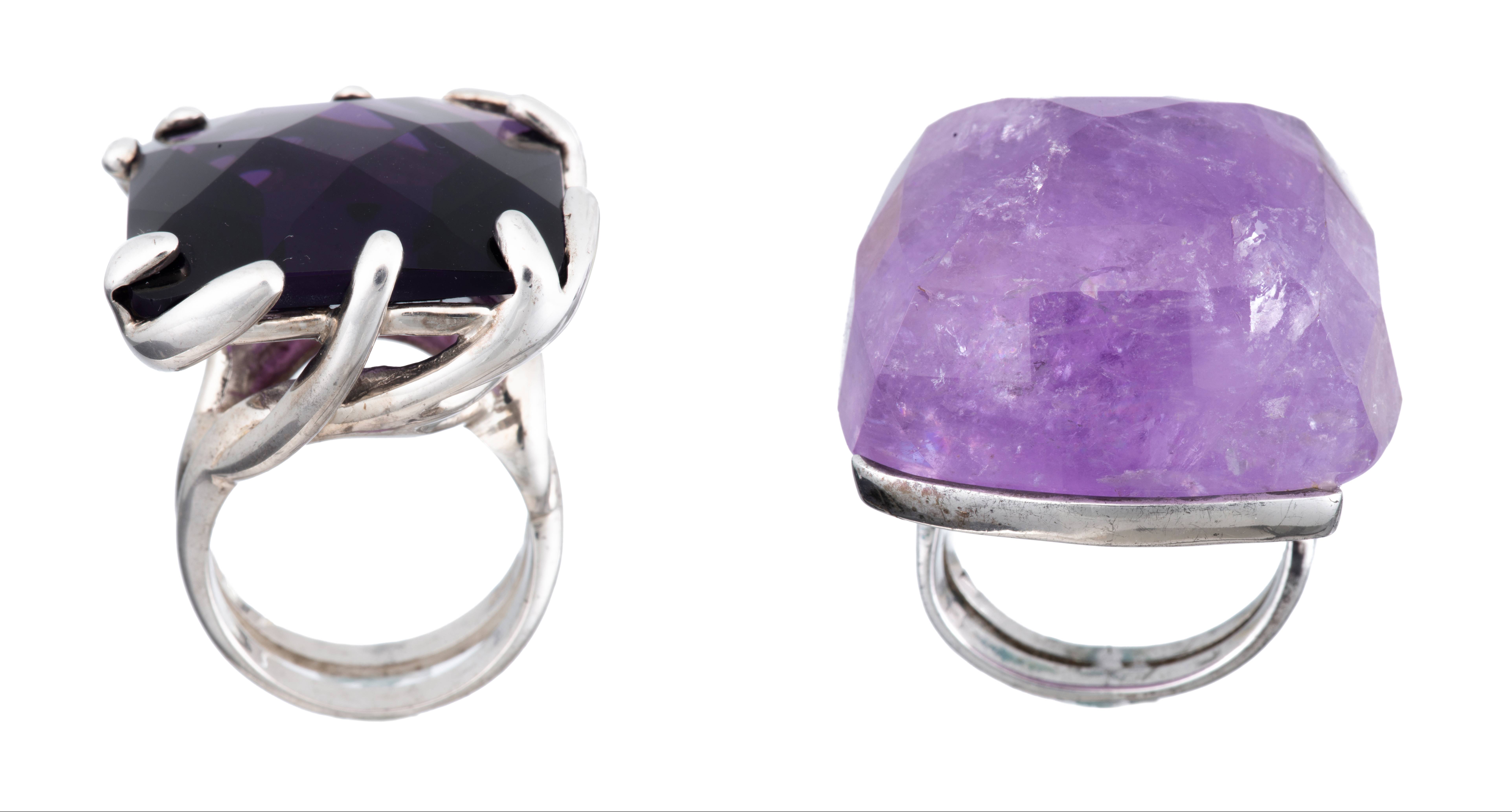 Bague en argent .925 avec un quartz mauve et 1 bague en argent .925 et une améthyste synthétique facettée sur la table.